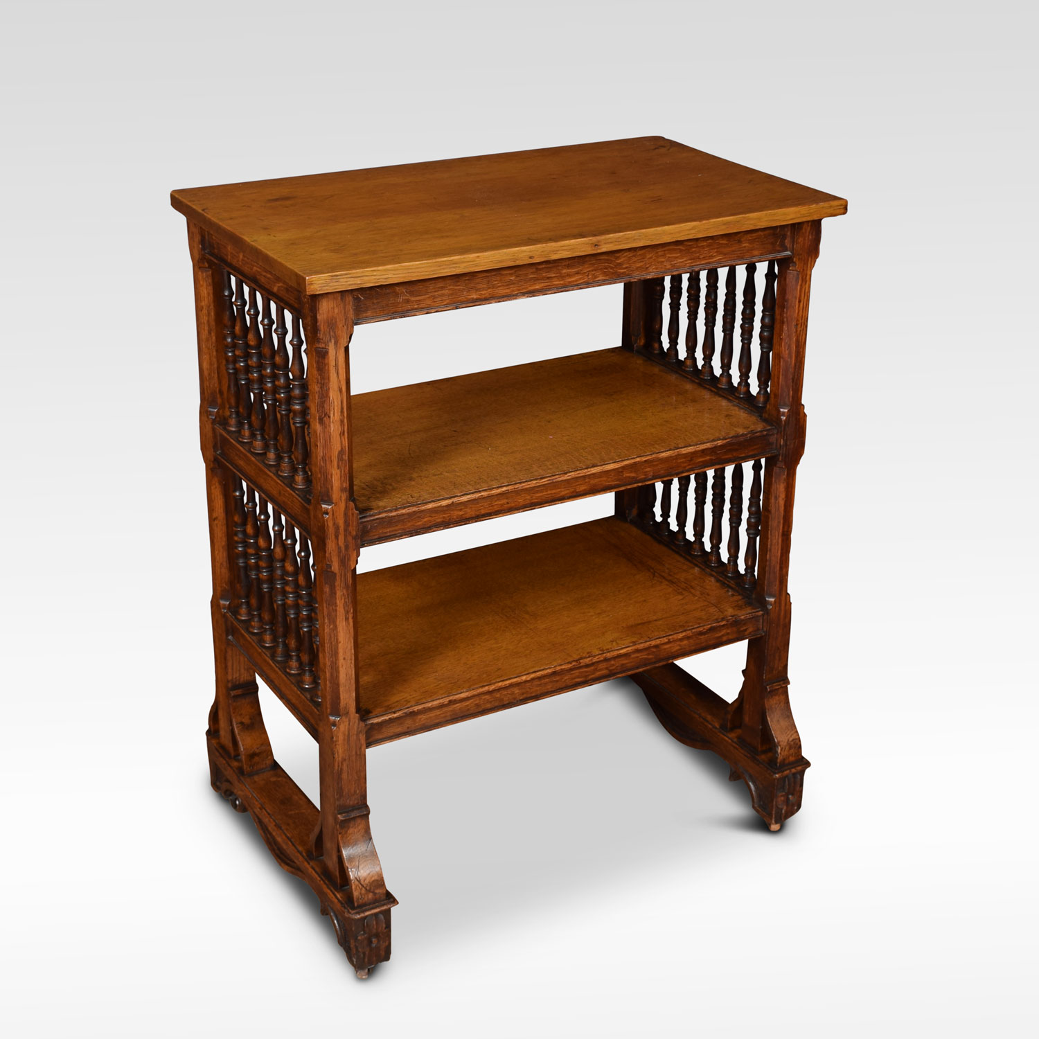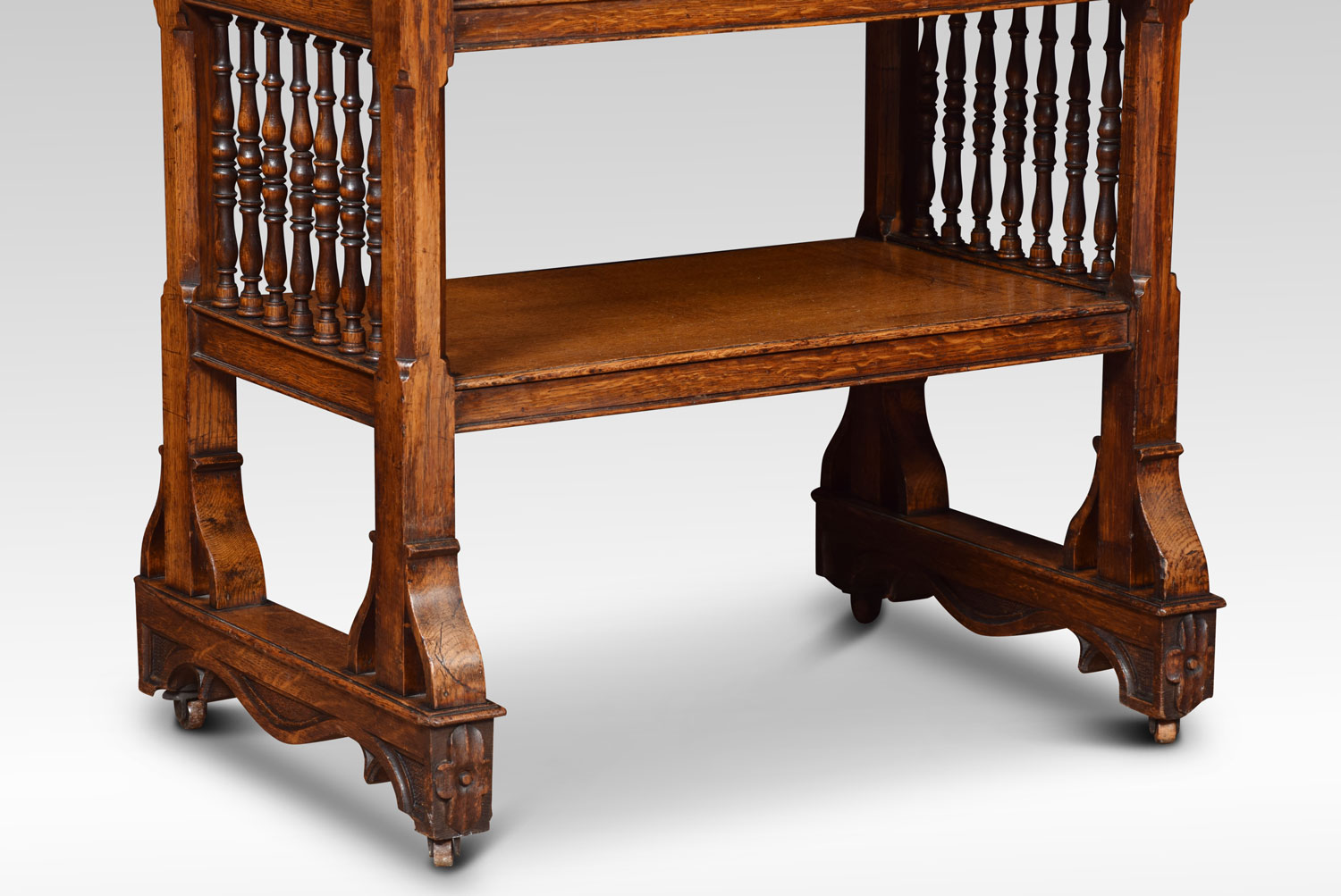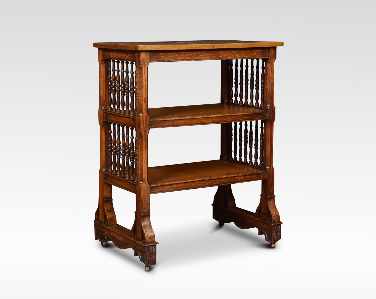 Gothic revival oak book table, The rectangular top above two tiers united by turned spindles. To the architectural base terminating in ceramic castors.
