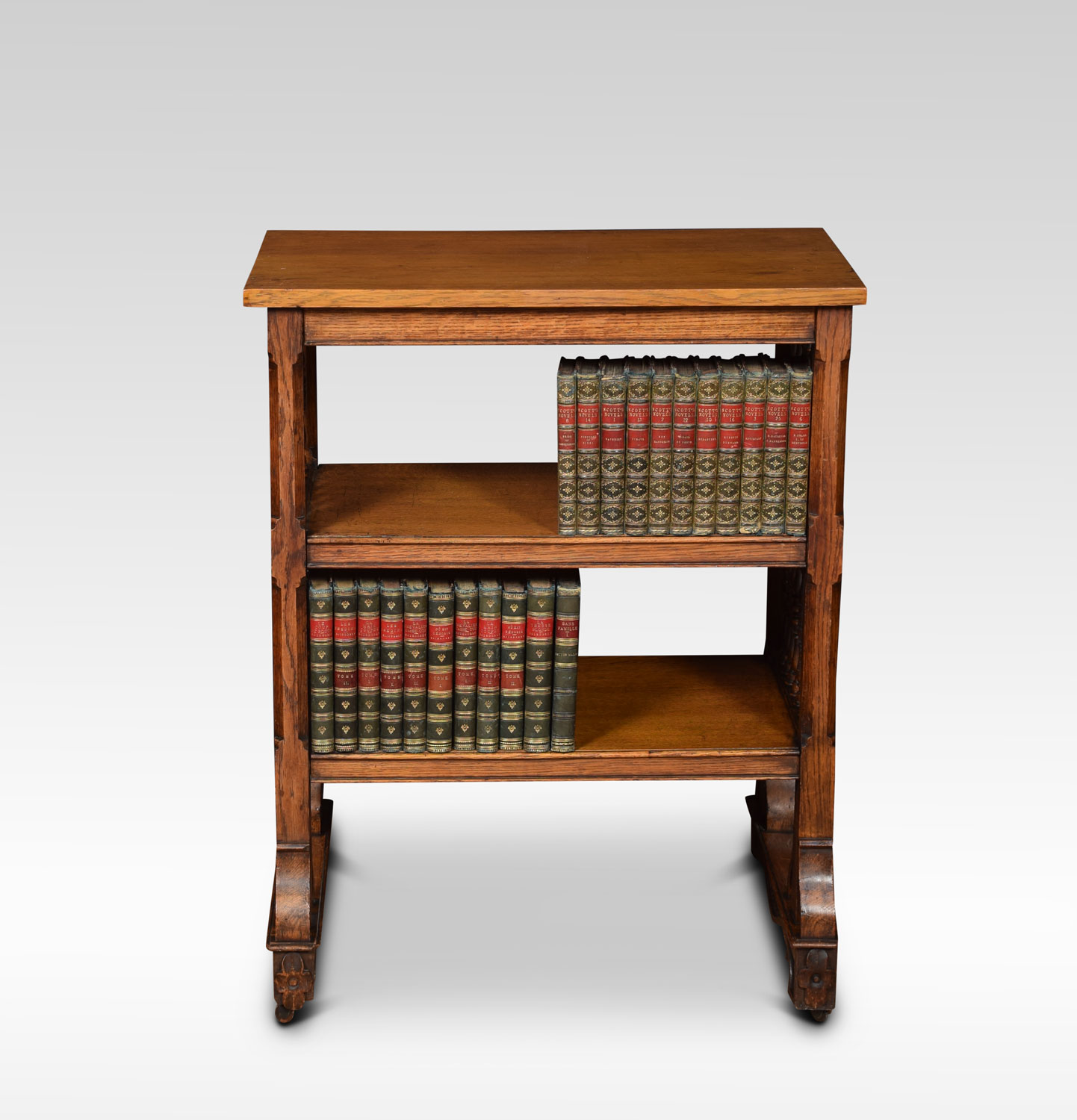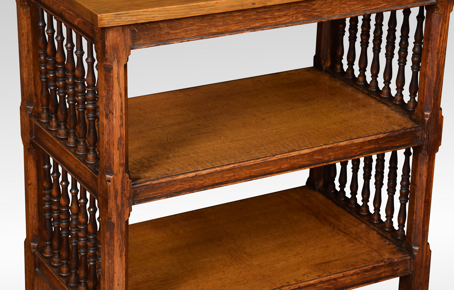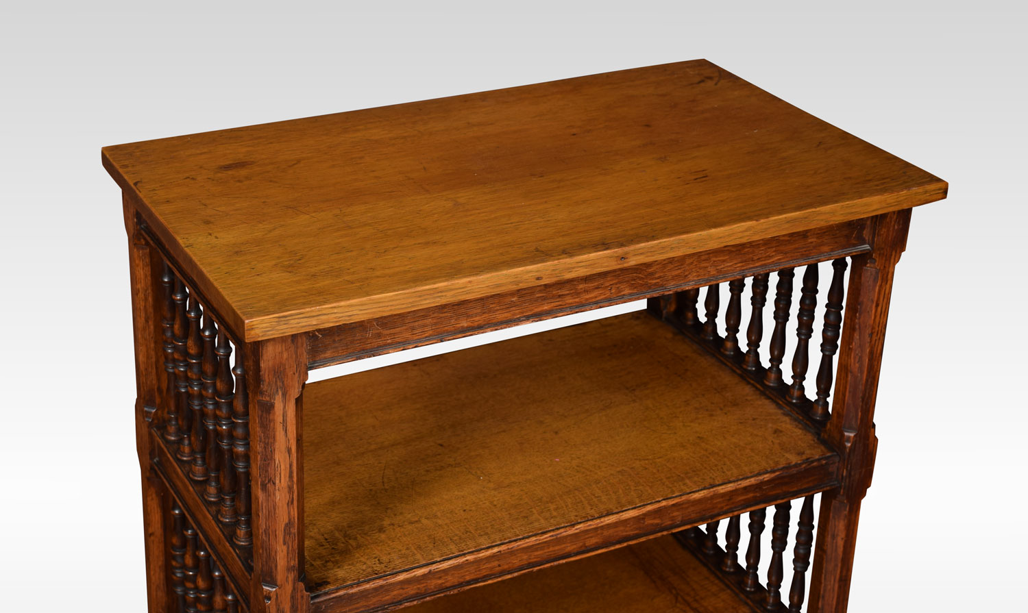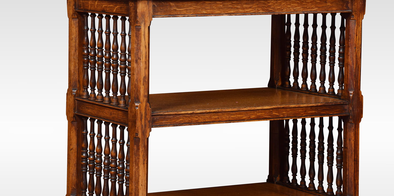 Gothic revival oak book table, The rectangular top above two tiers united by turned spindles. To the architectural base terminating in ceramic castors.