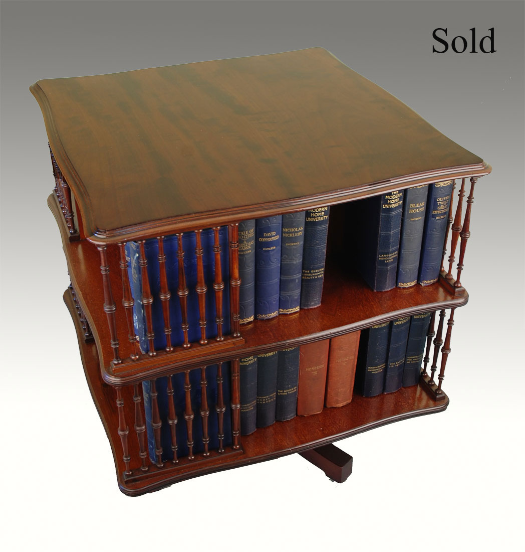 A Howard & Sons mahogany 2 tier revolving bookcase with turned spindles bears plate ‘Howard & Sons