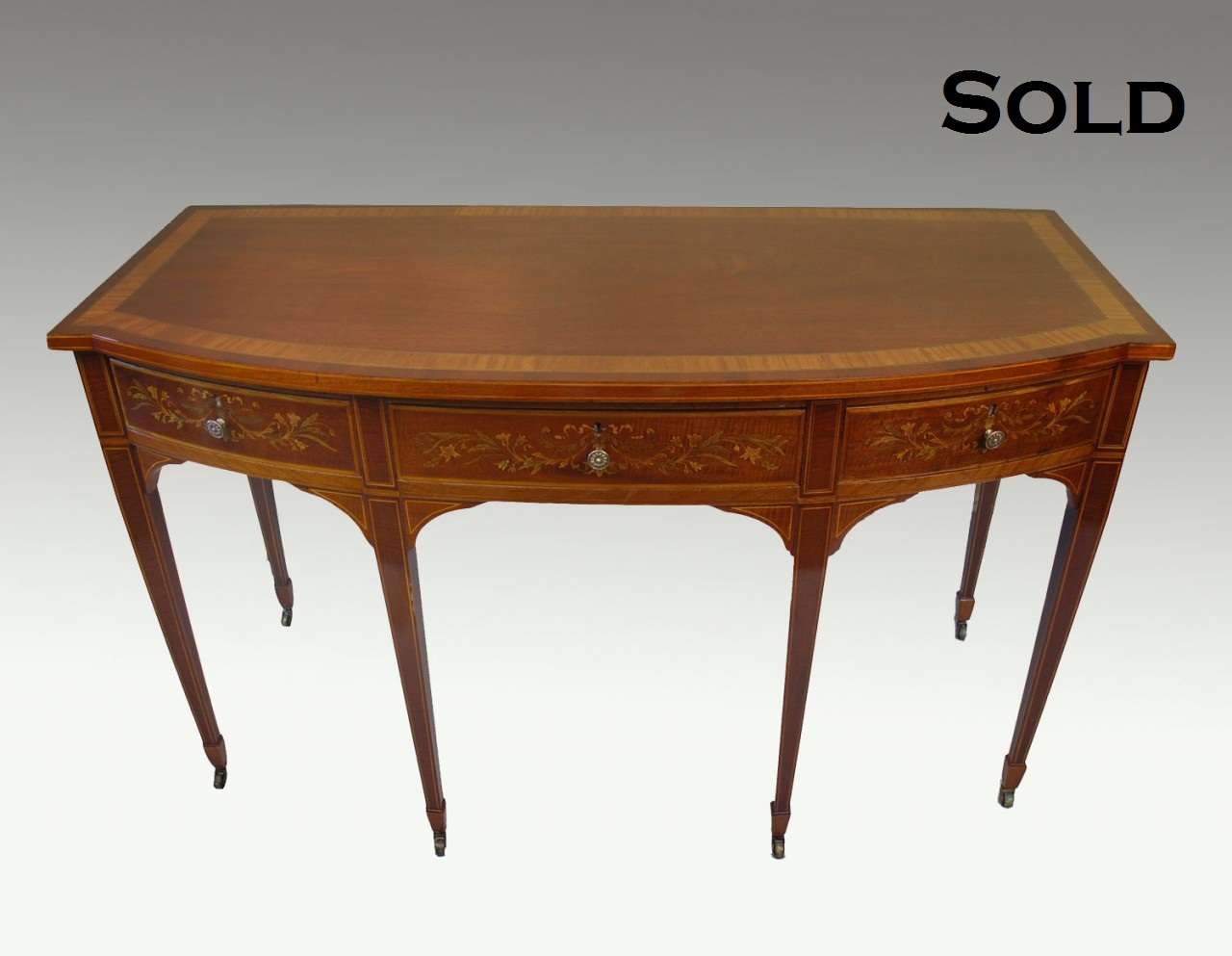 A Edwardian inlaid mahogany bow fronted side table with line edged top above three frieze drawers with brass handles and floral inlay above four square section tapered supports with spade feet and brass castors