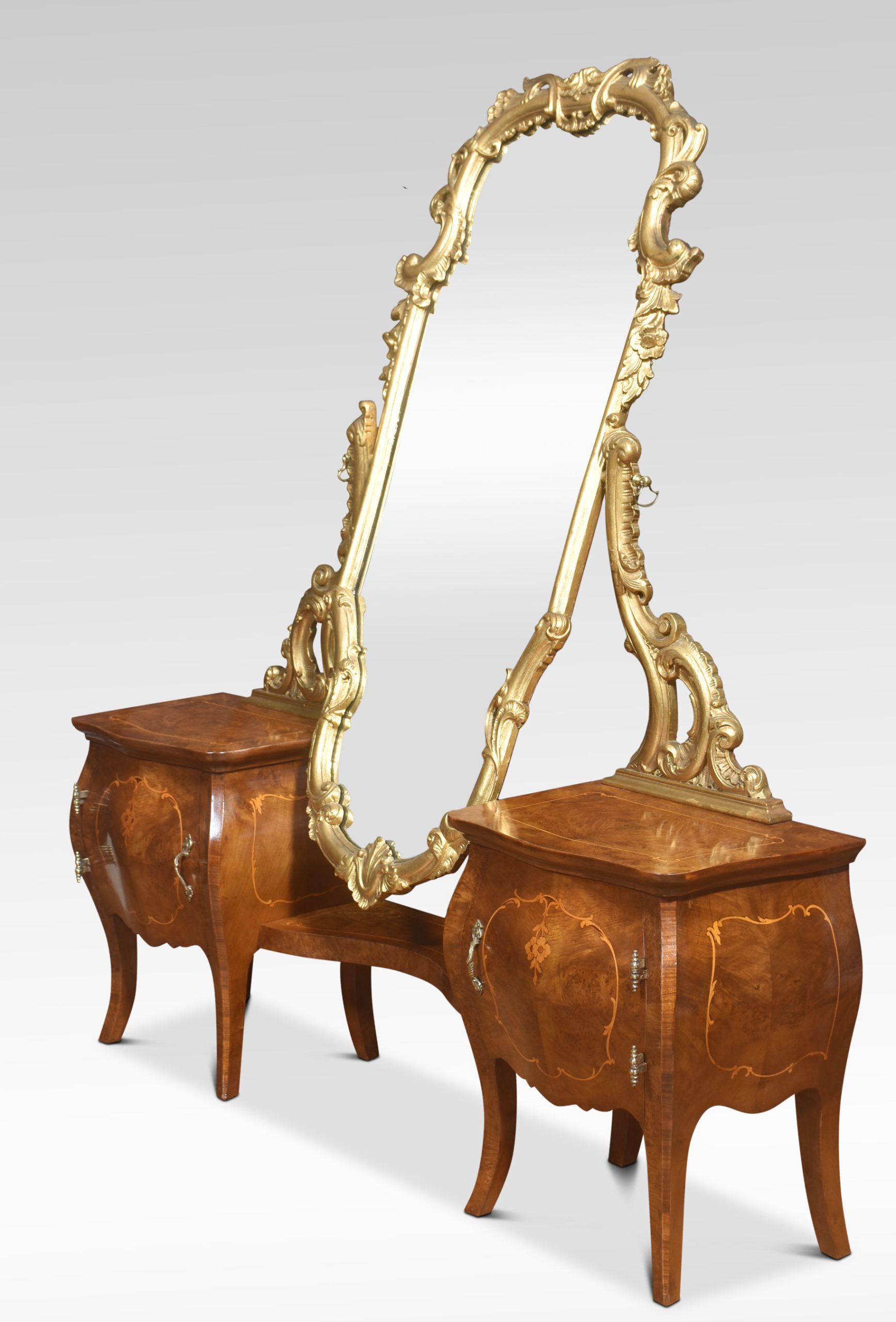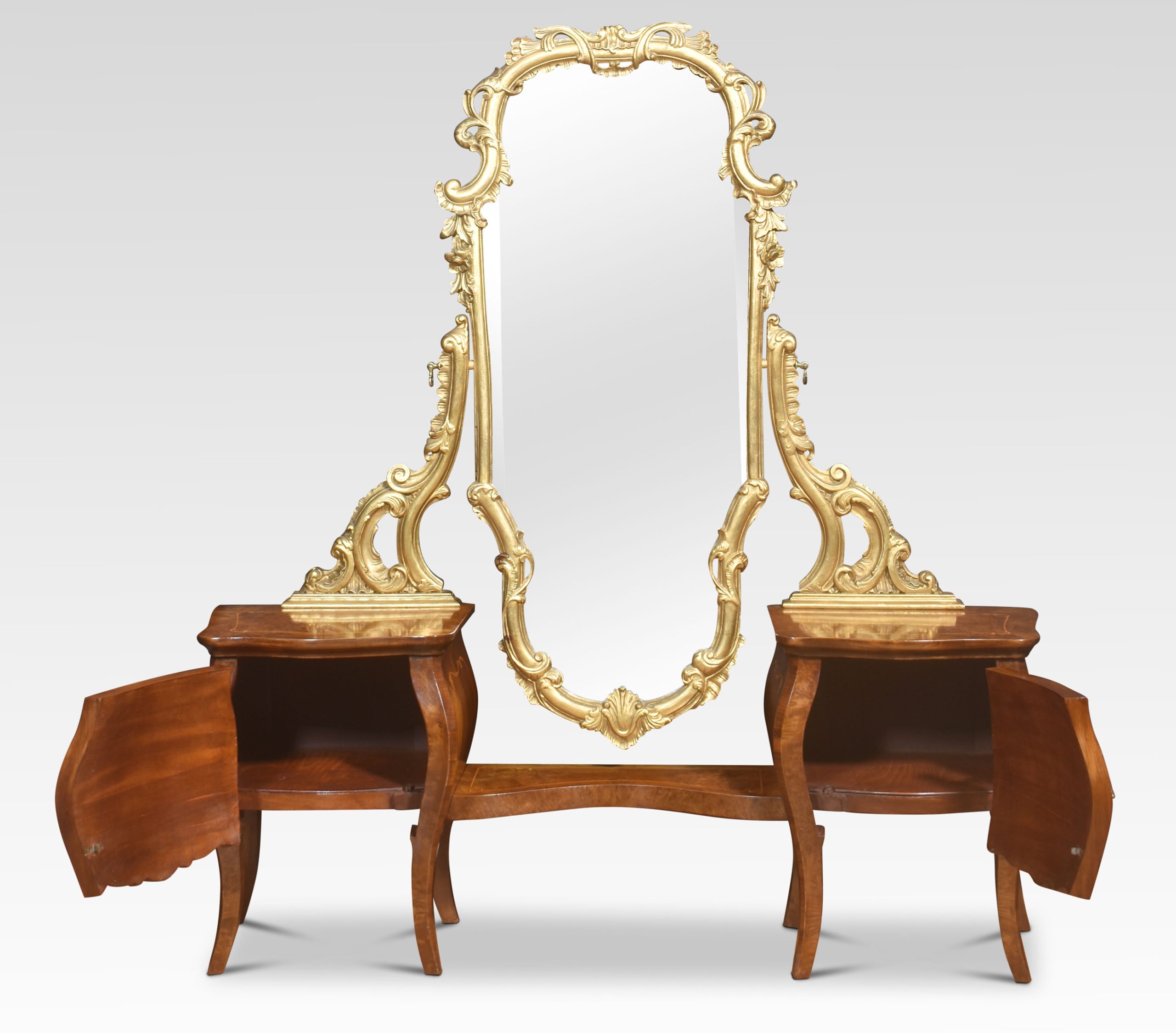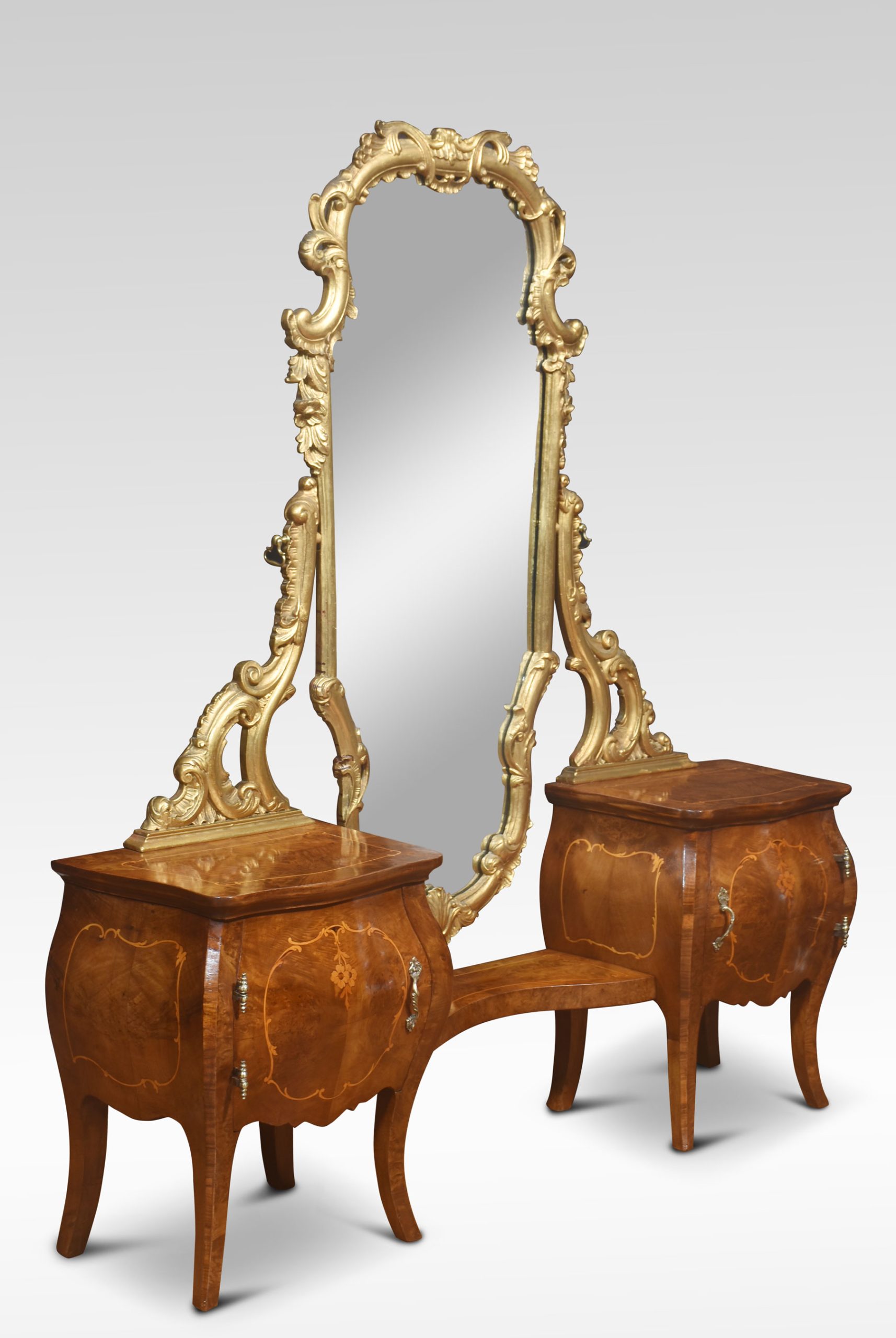 Italian giltwood and figured walnut dressing mirror of Rococo style, the long scrolled foliate frame mounted on scrolled supports, over a pair of bombé petite commodes with well-figured tops and a cupboard door below all raised on splayed supports.