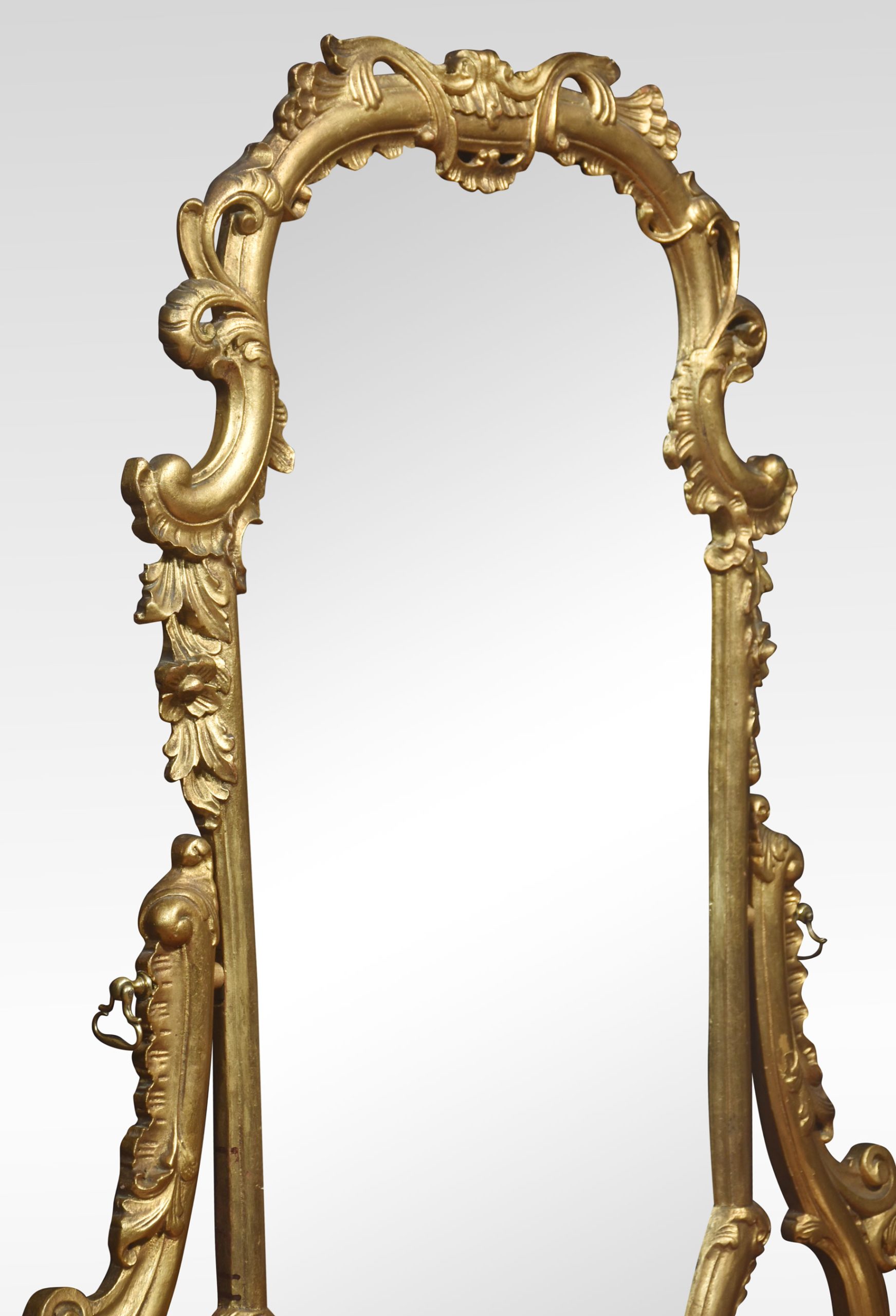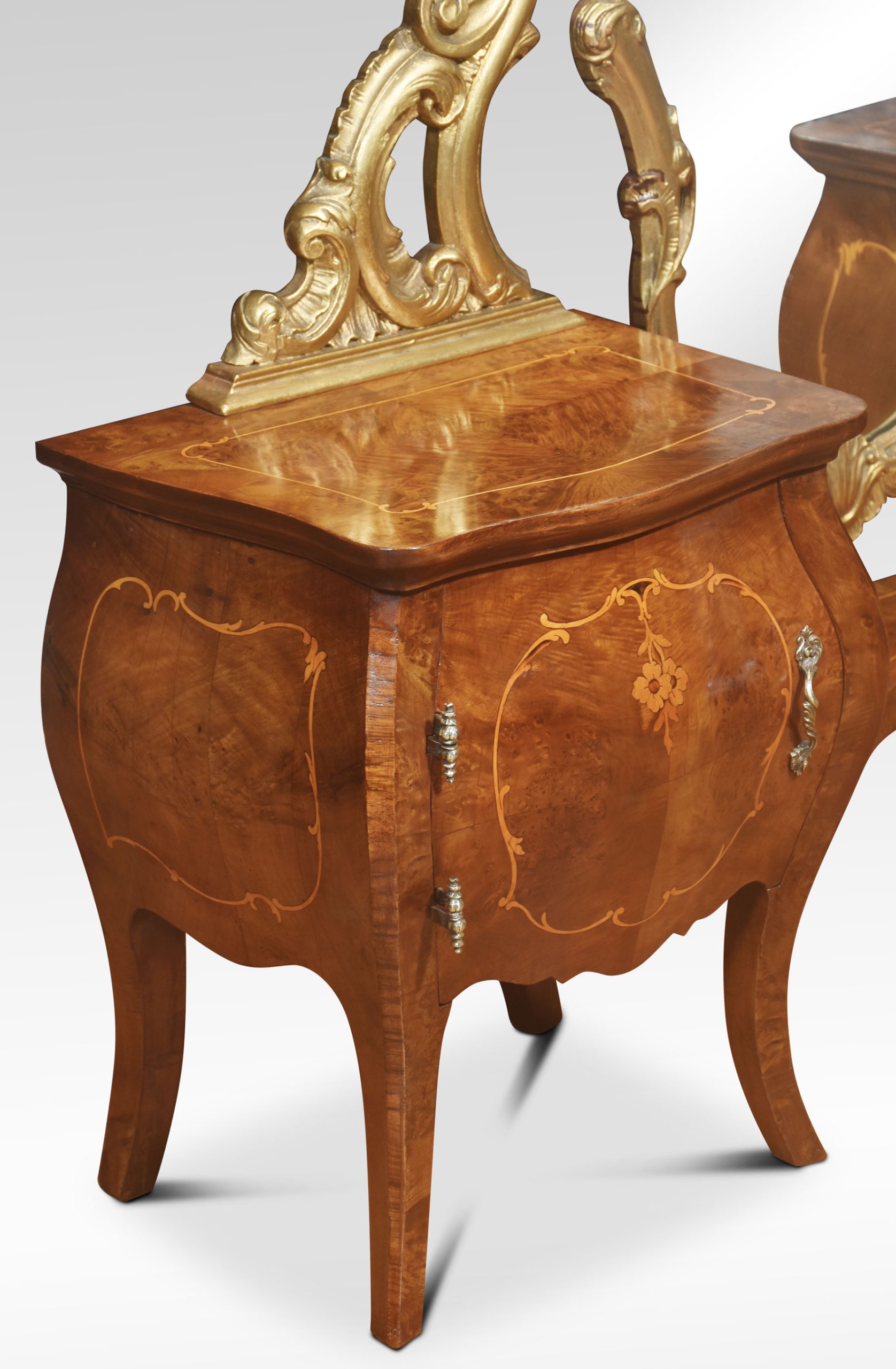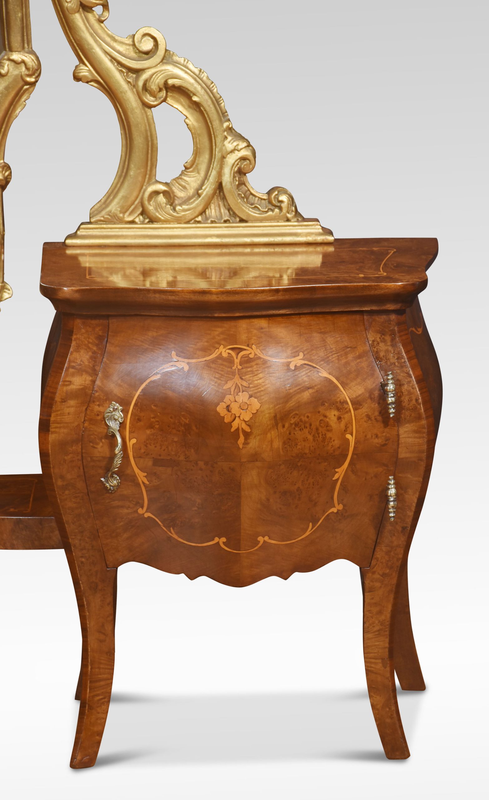 Italian giltwood and figured walnut dressing mirror of Rococo style, the long scrolled foliate frame mounted on scrolled supports, over a pair of bombé petite commodes with well-figured tops and a cupboard door below all raised on splayed supports.