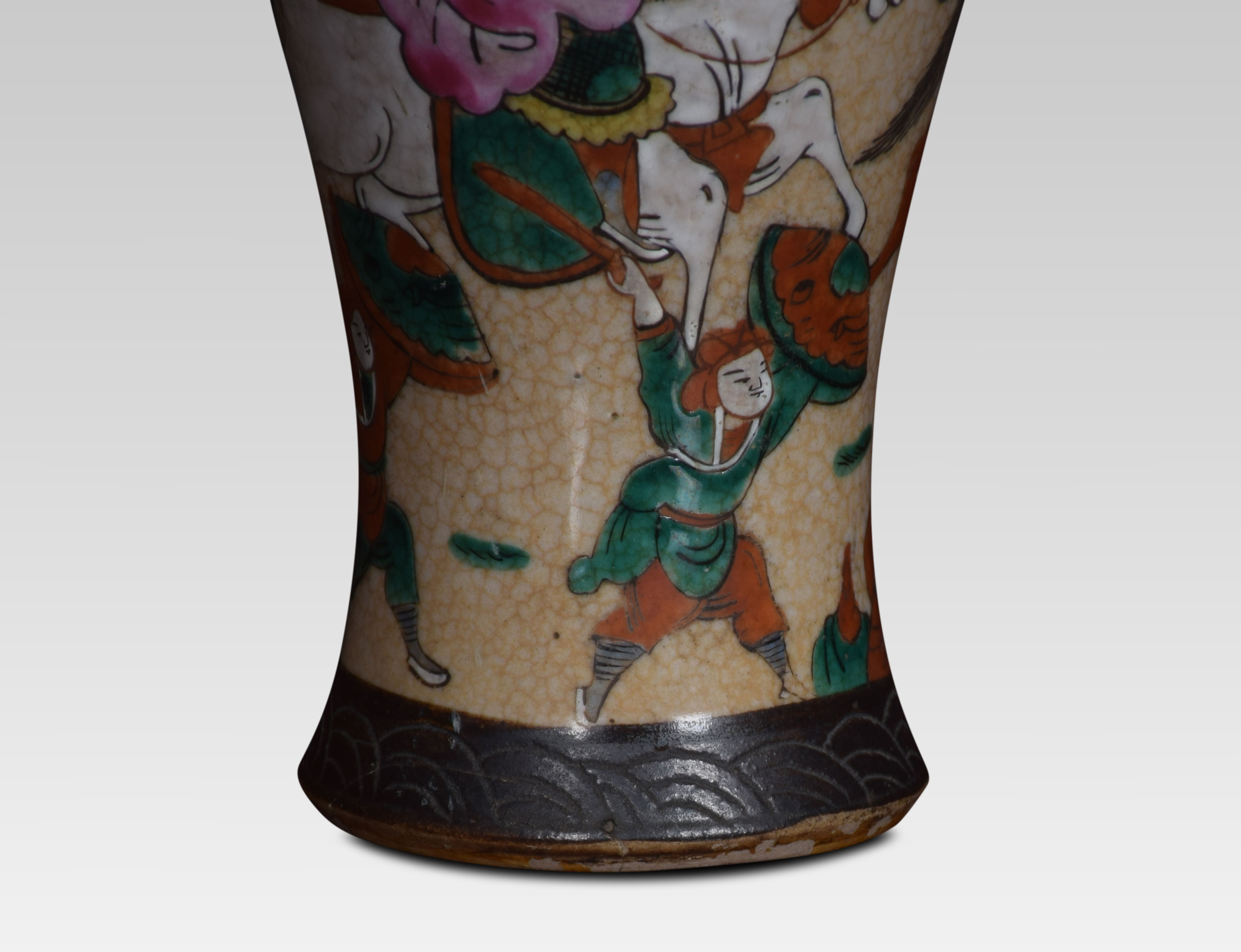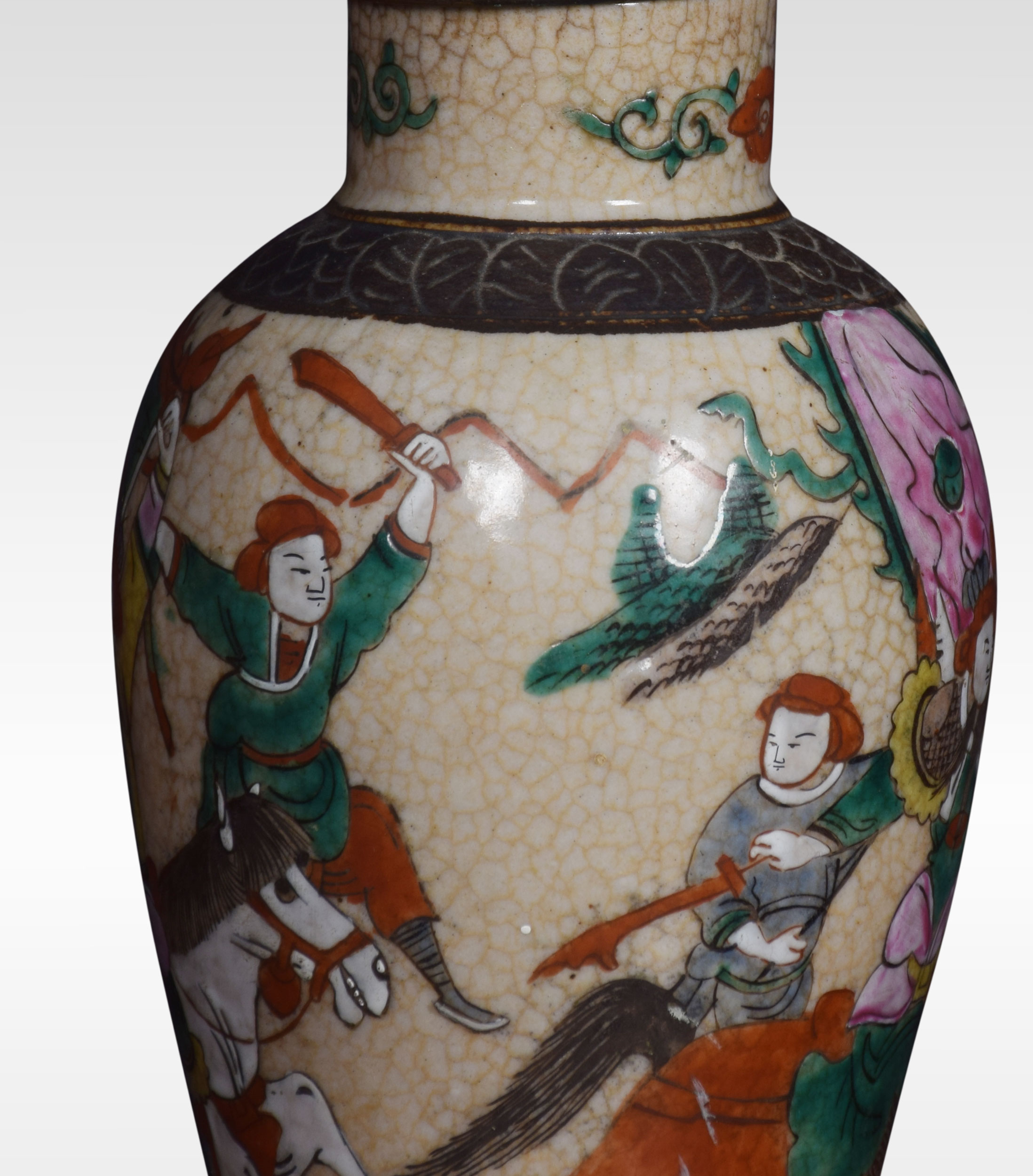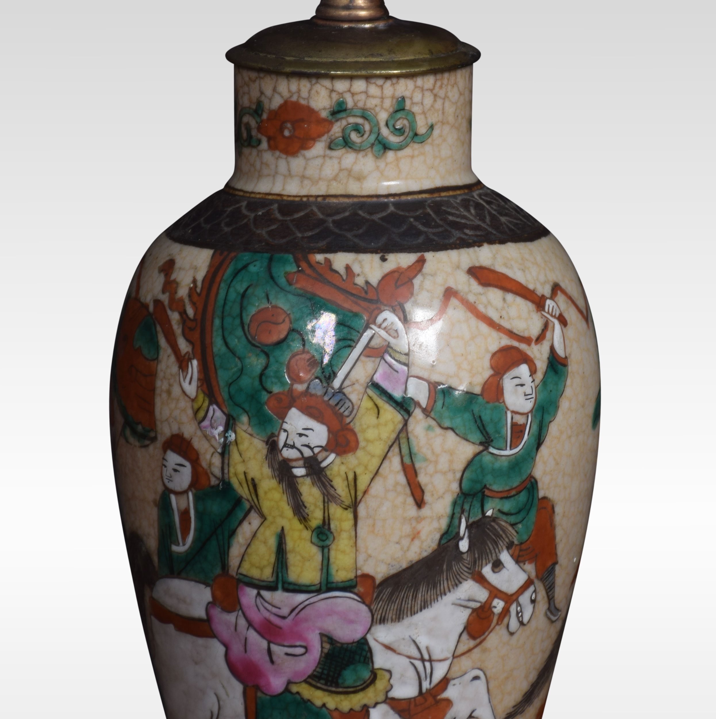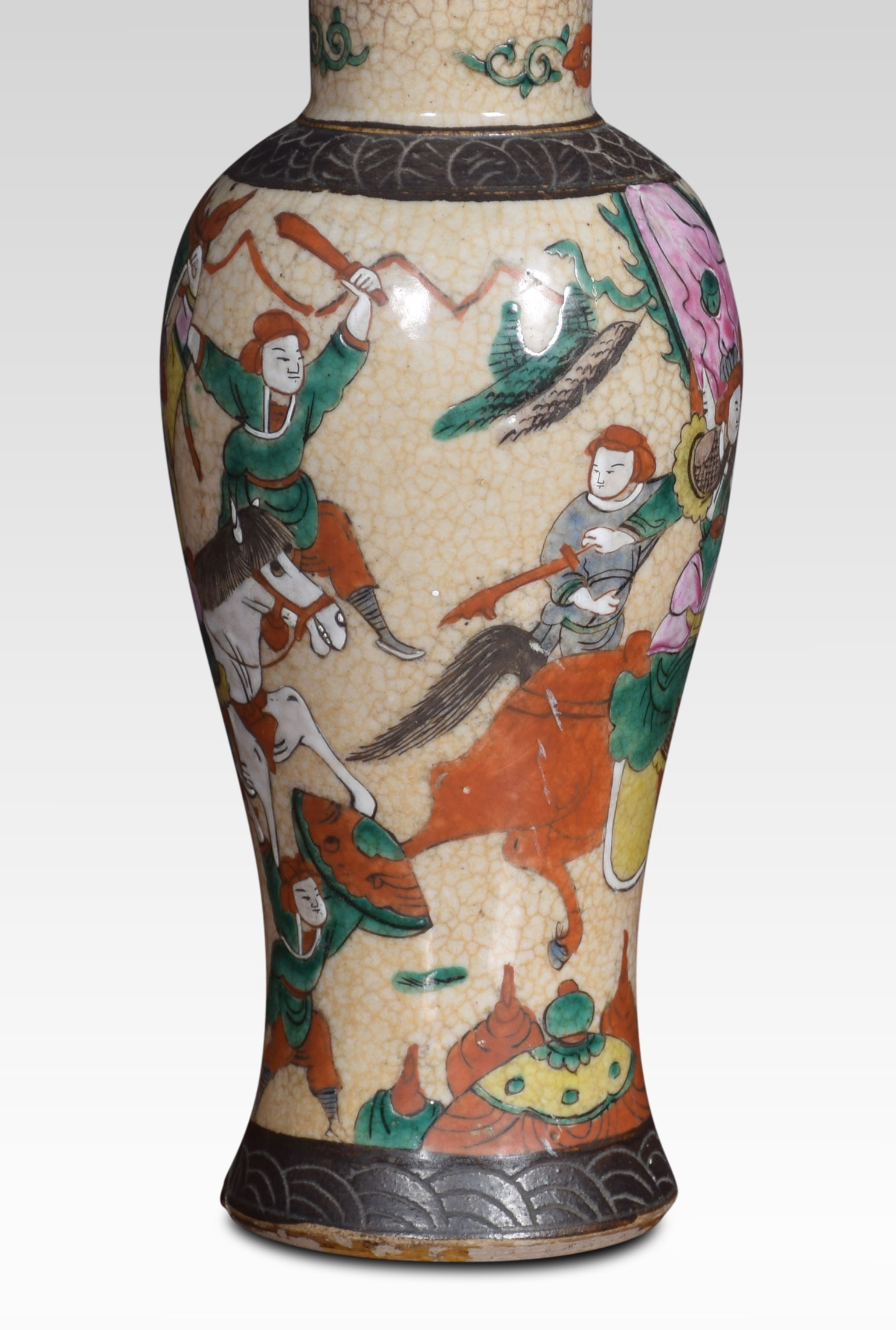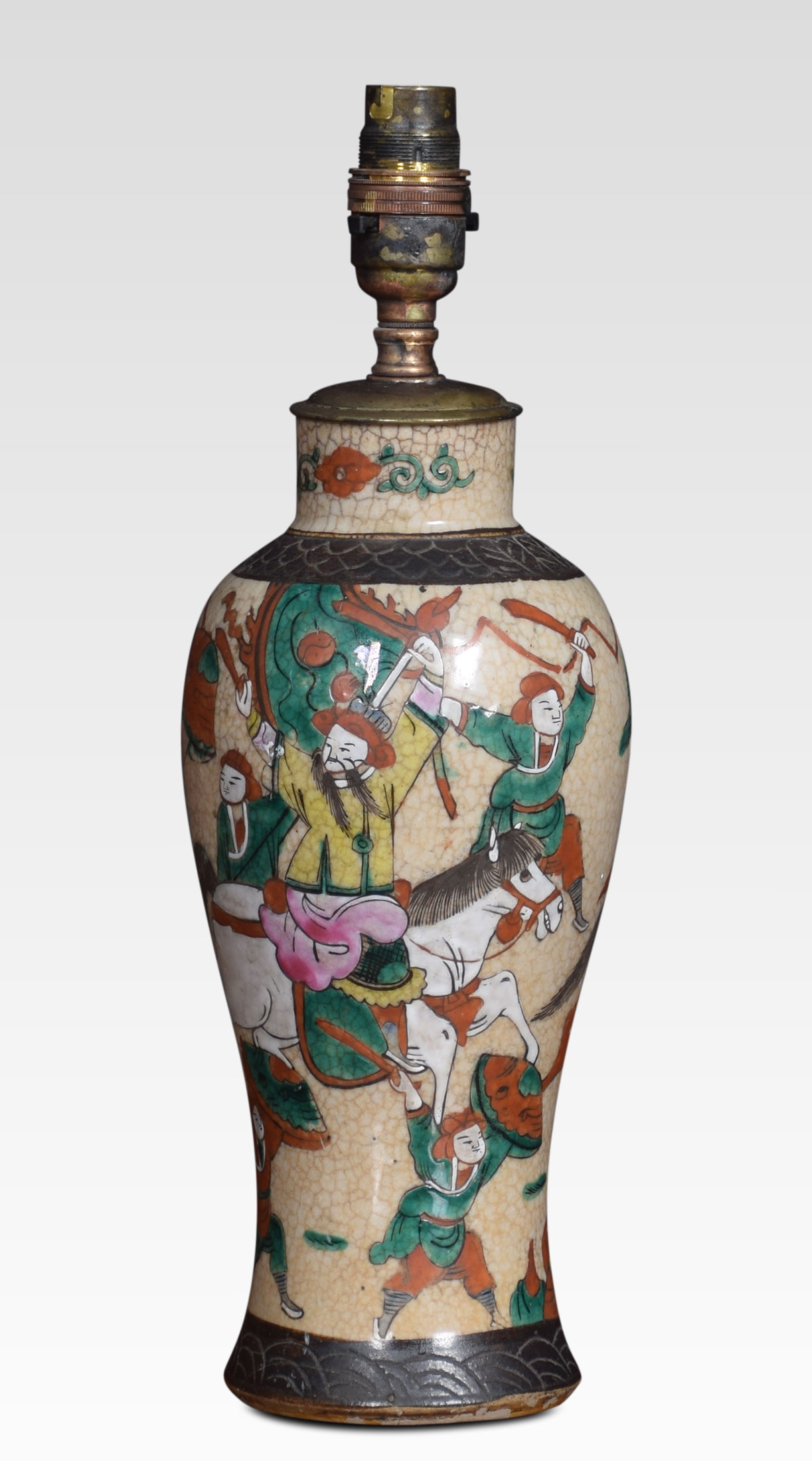 Japanese crackle glaze vase lamp decorated with a battle scene. The lamp has been rewired and tested.