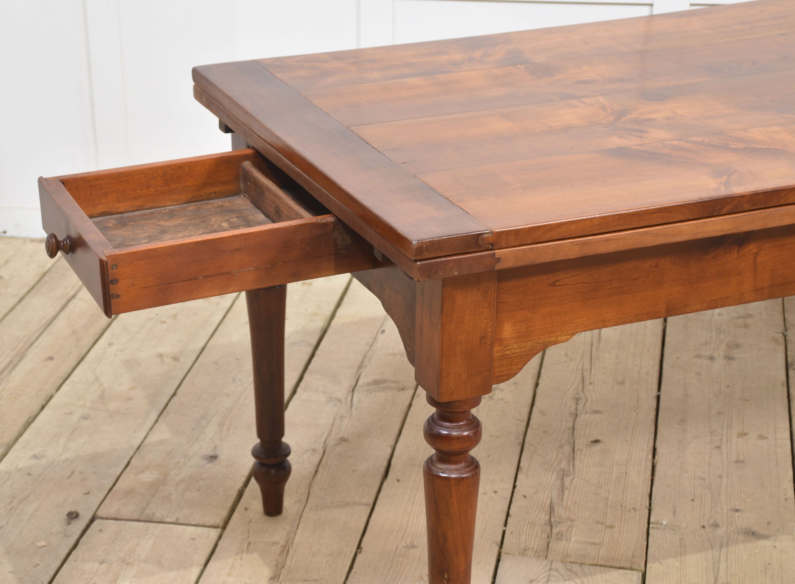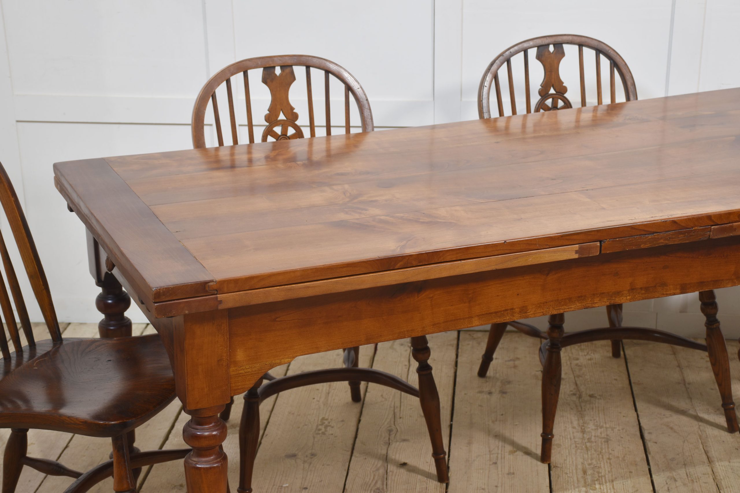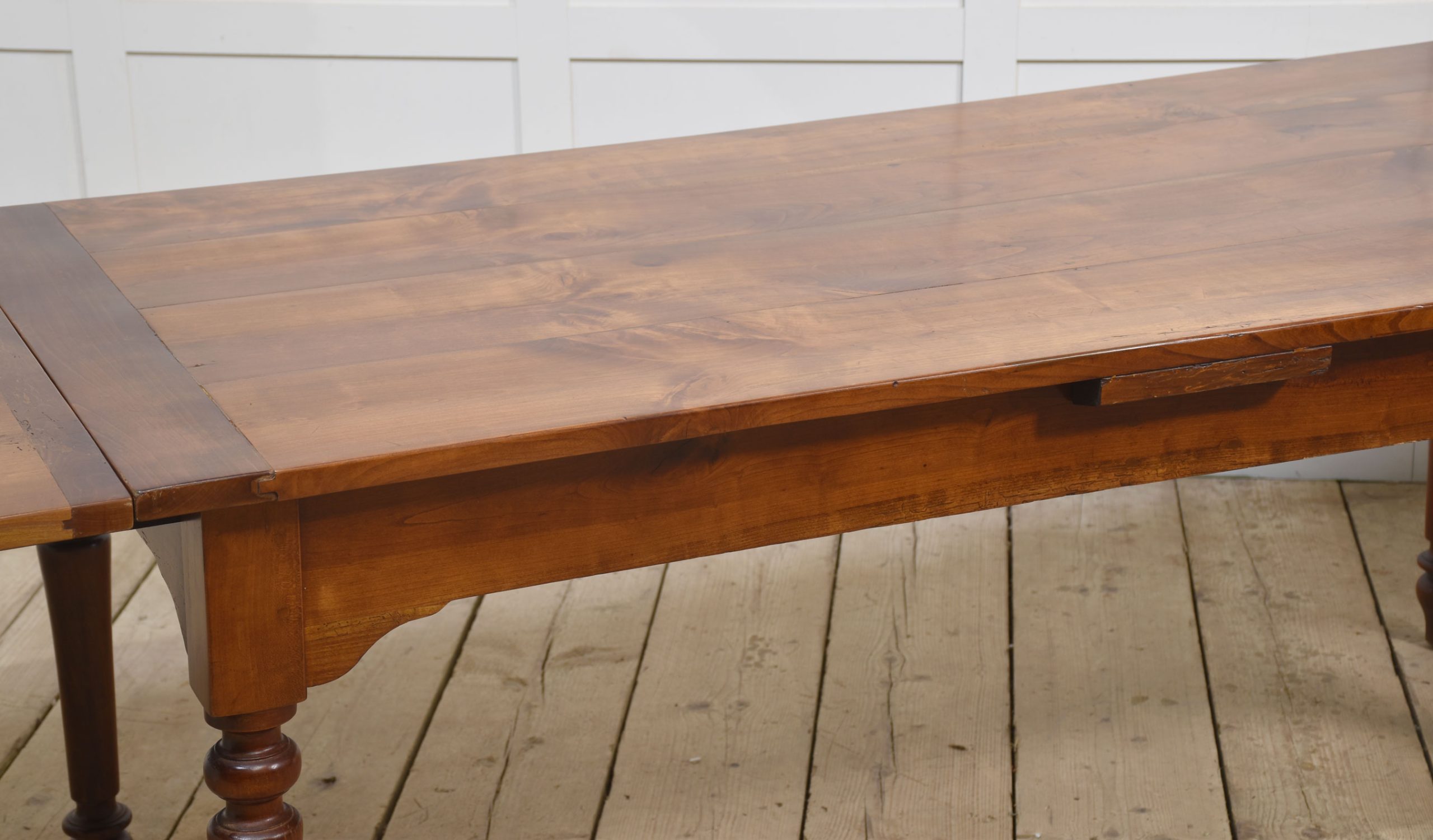 Very large farmhouse table. The rectangular top with pull out ends to the block freeze fitted with cheese slide all raised up on turned tapering legs. Will seat 12 people.