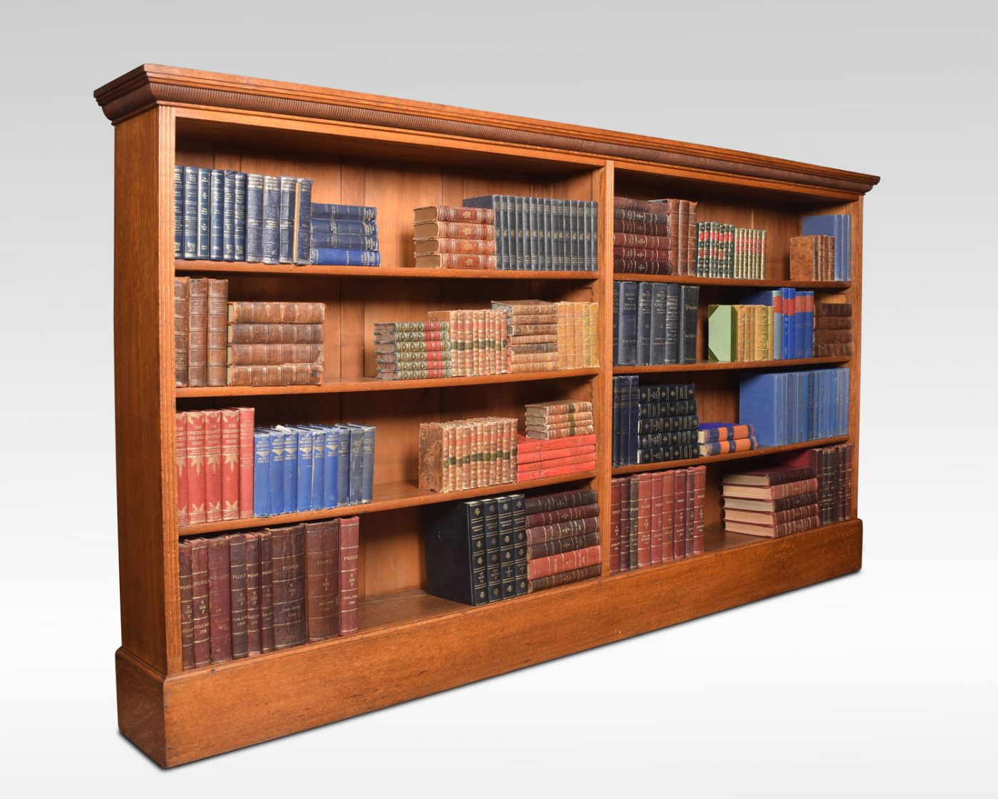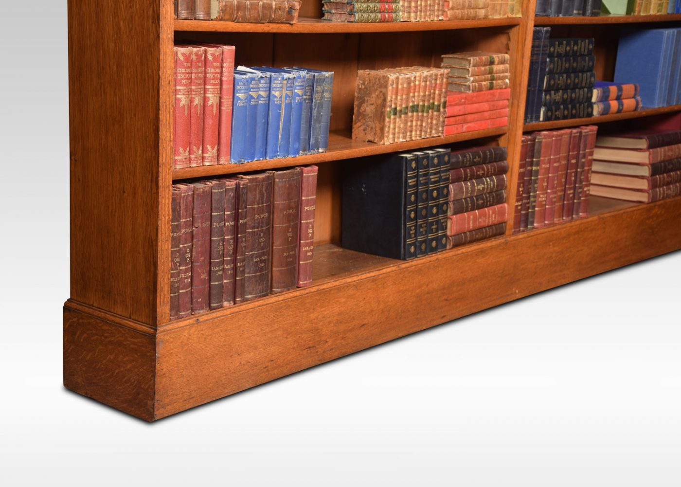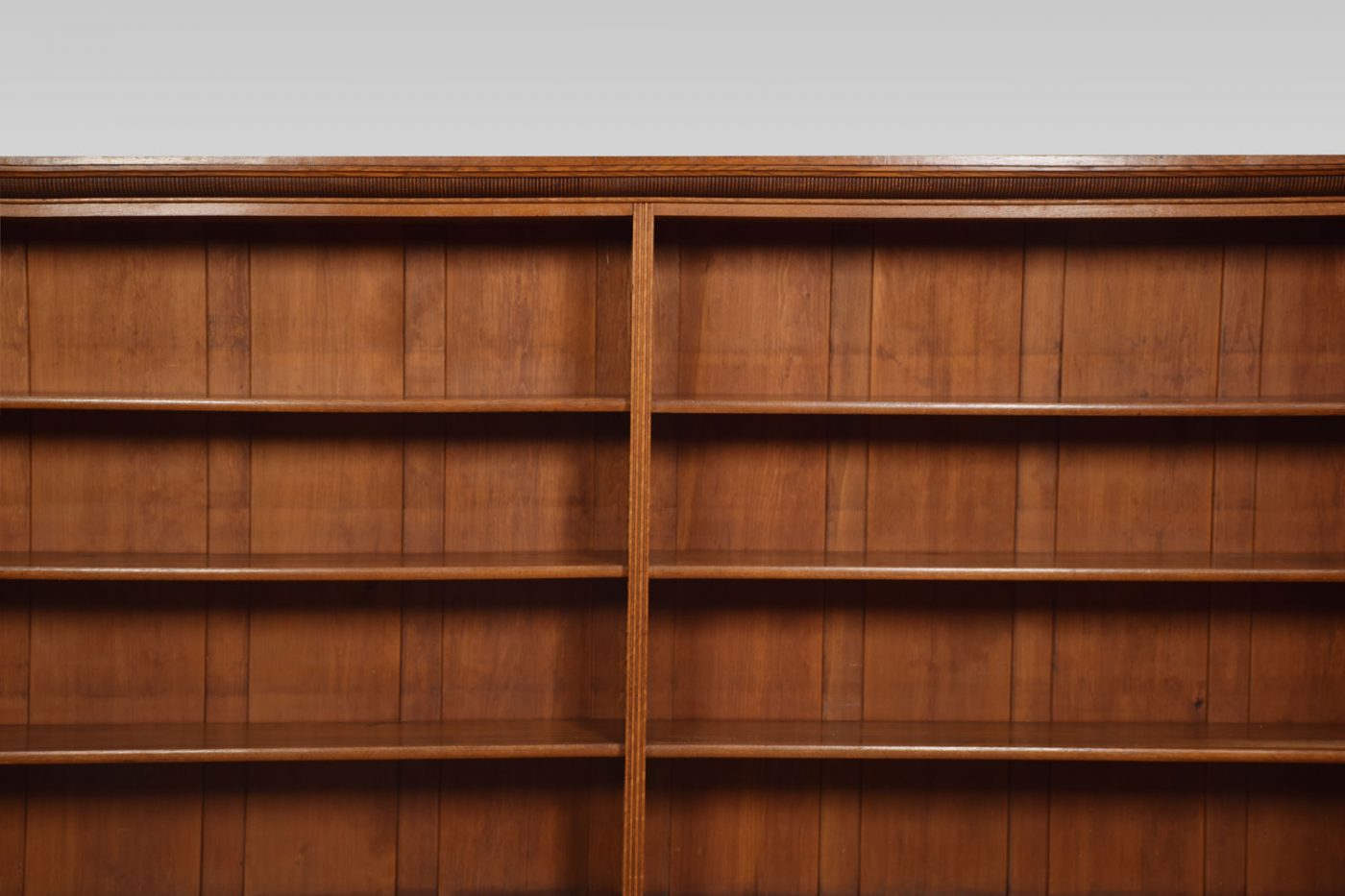 Early 20th-century oak bookcase with a large rectangular moulded reeded top over two sections, each fitted with three adjustable shelves. All raised up on a deep plinth.