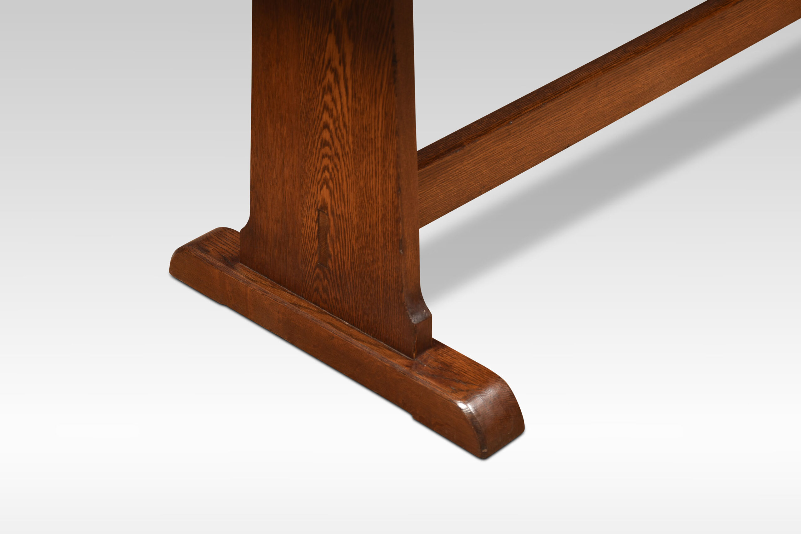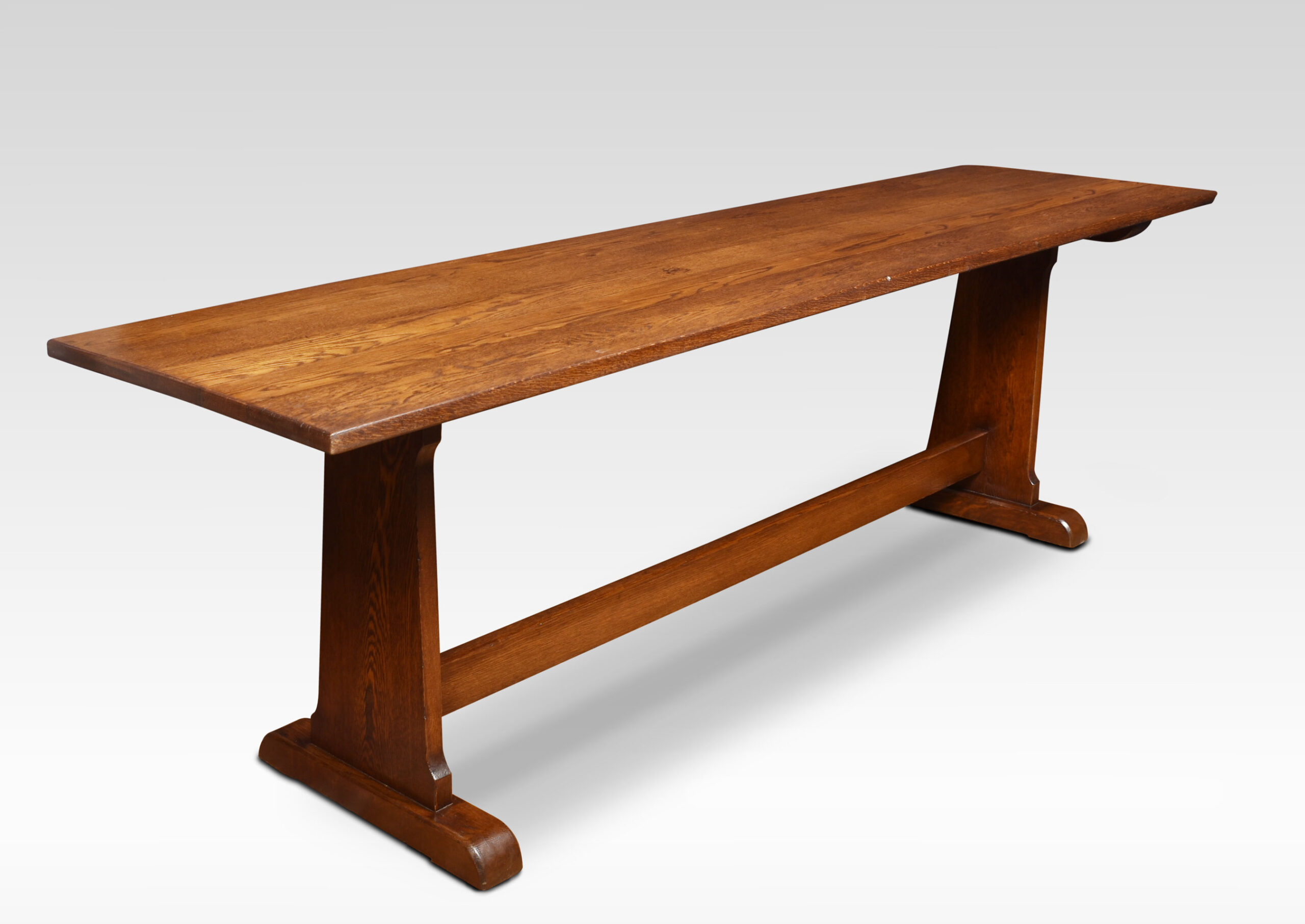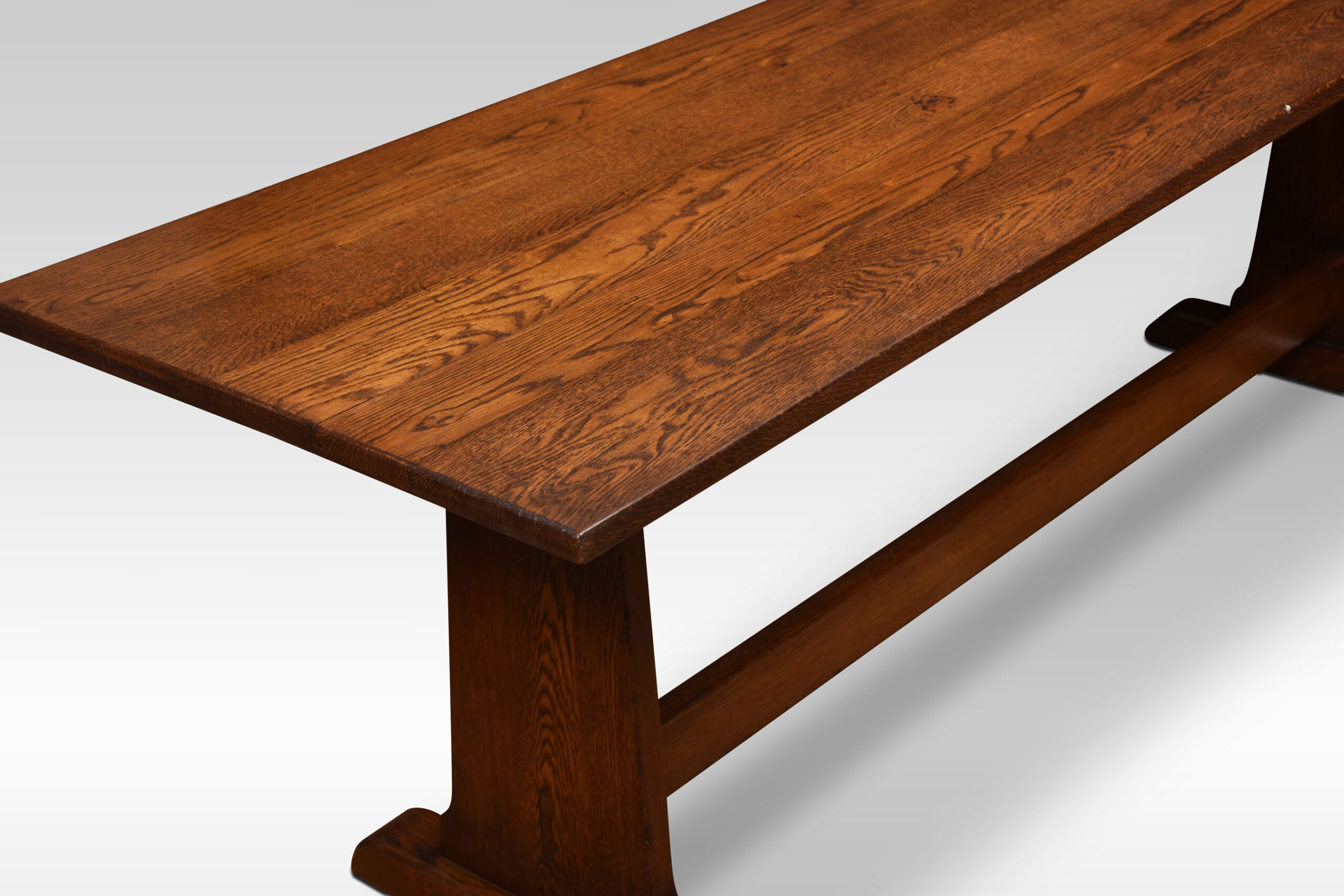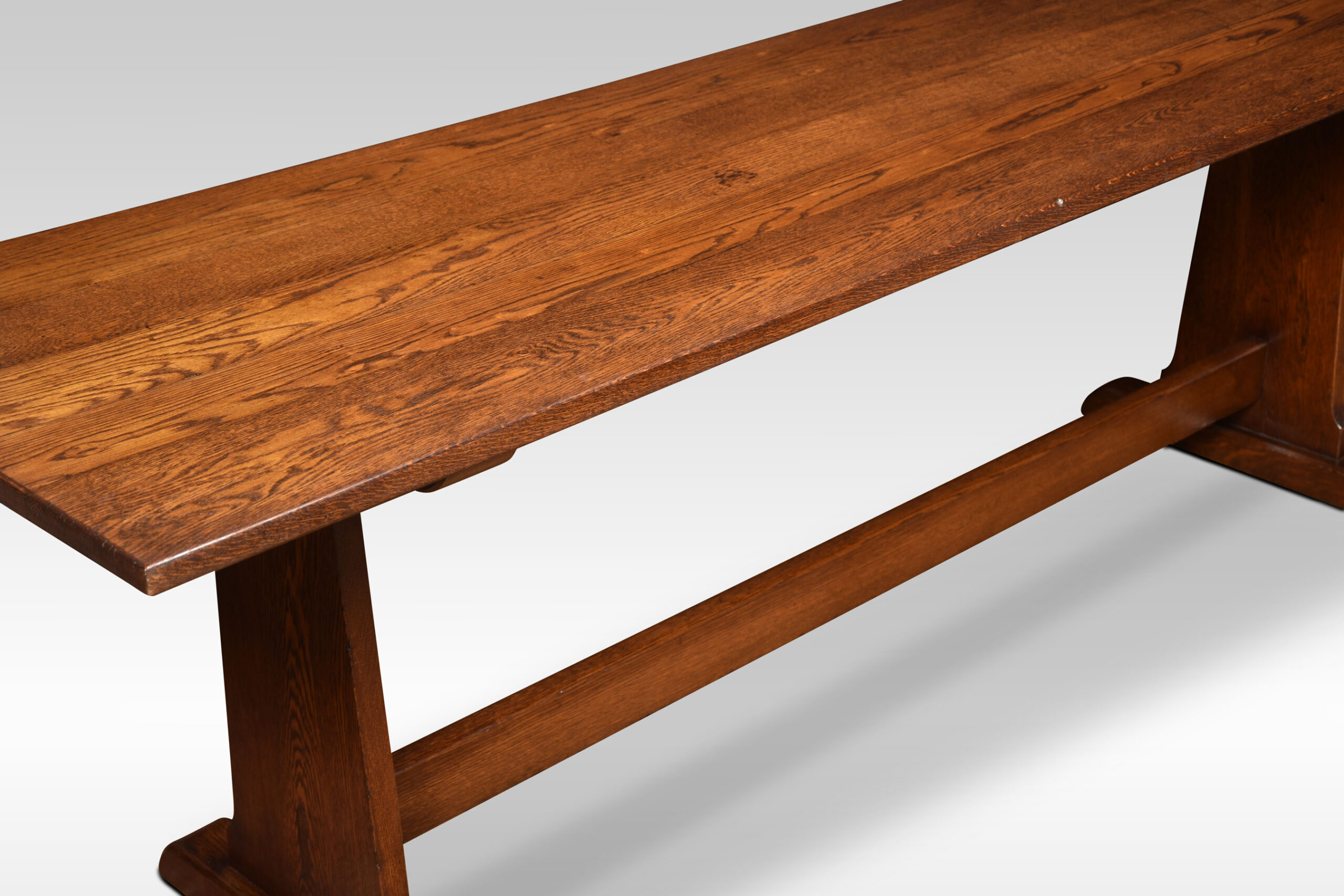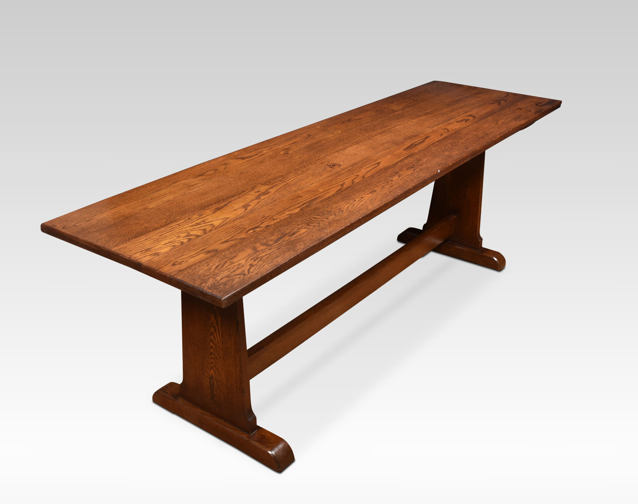 Oak refectory table, the plank top, raised on platform end supports with trestle legs united by stretcher.