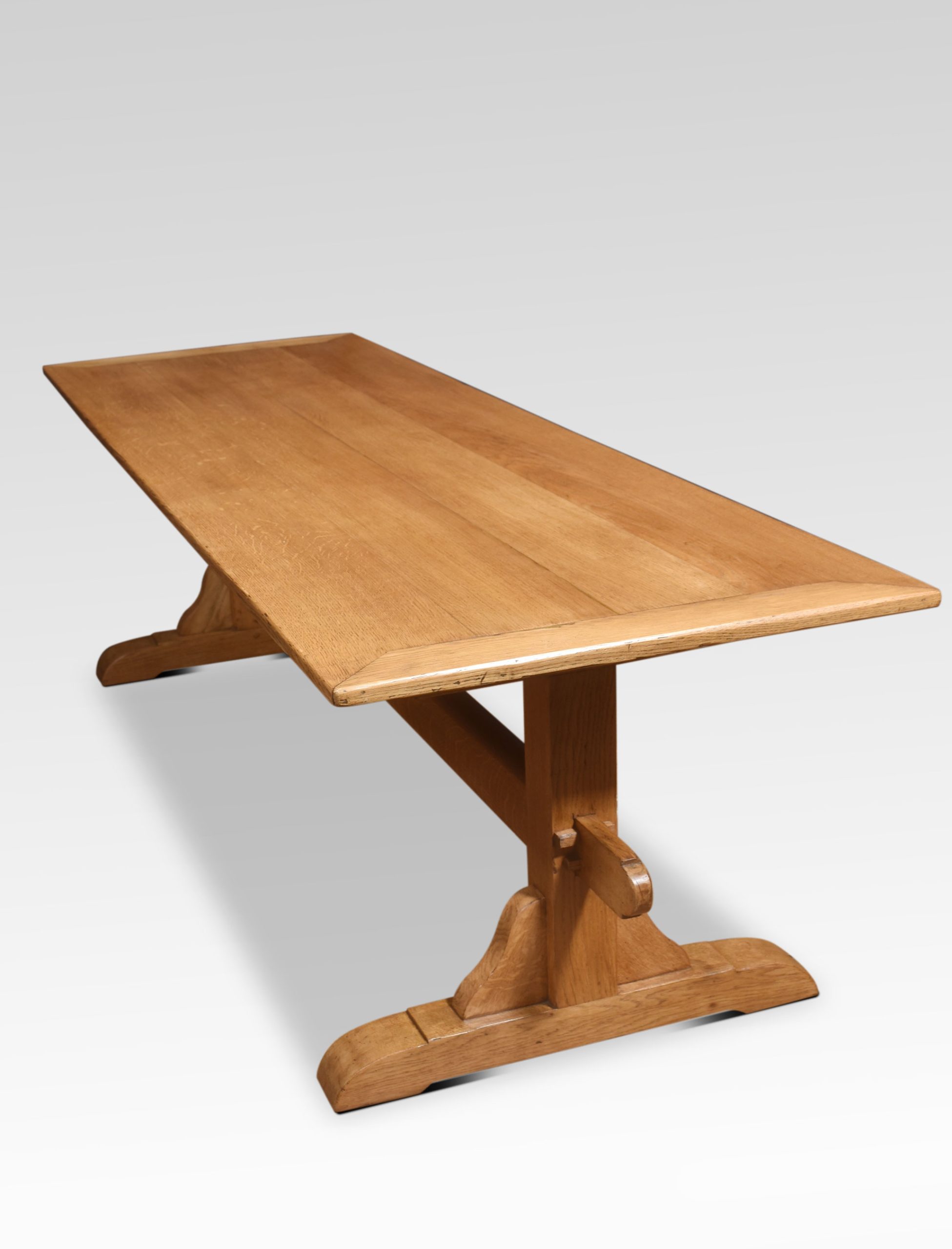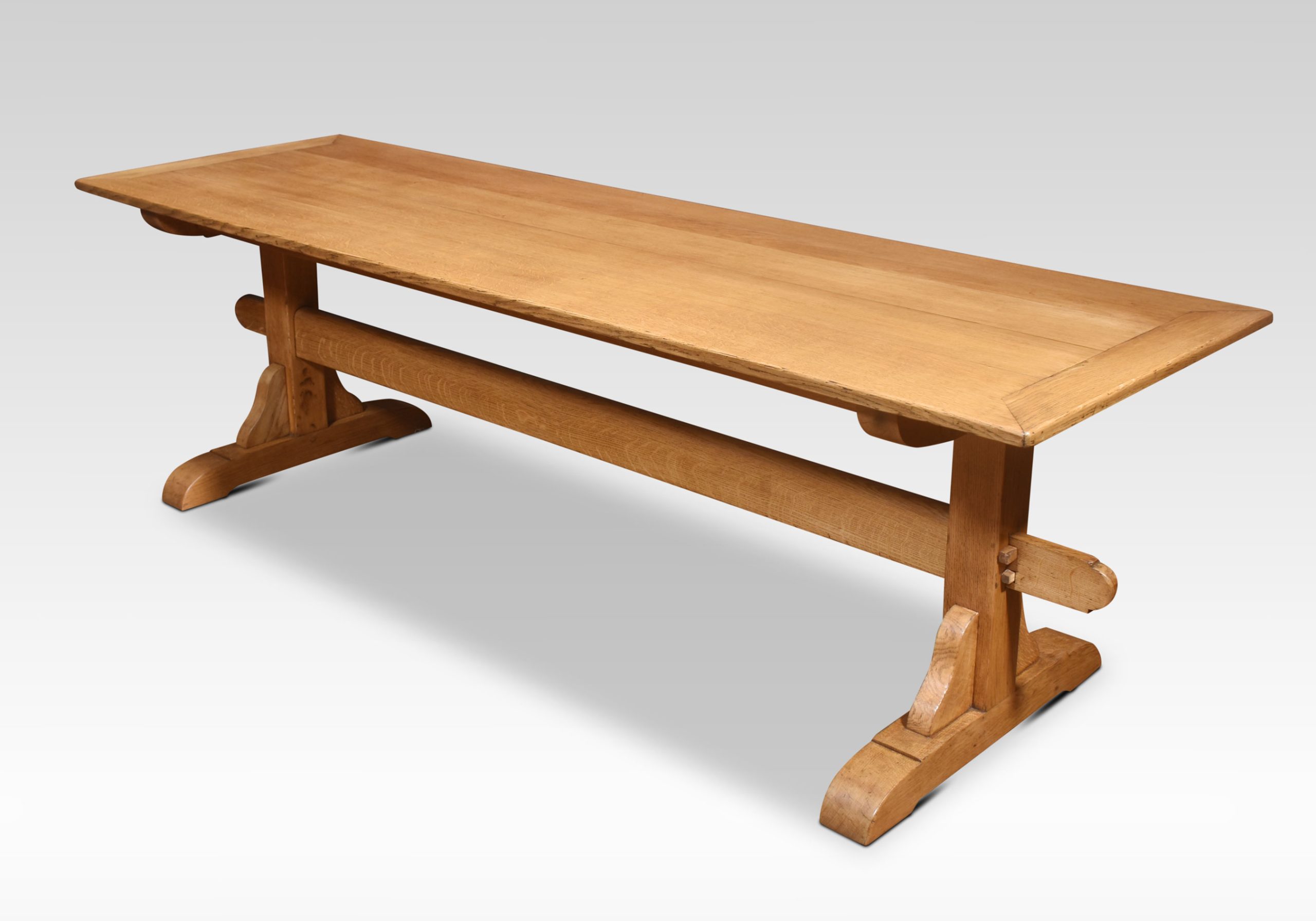 Oak refectory table, the plank top, raised on platform end supports with trestle legs united by stretcher.