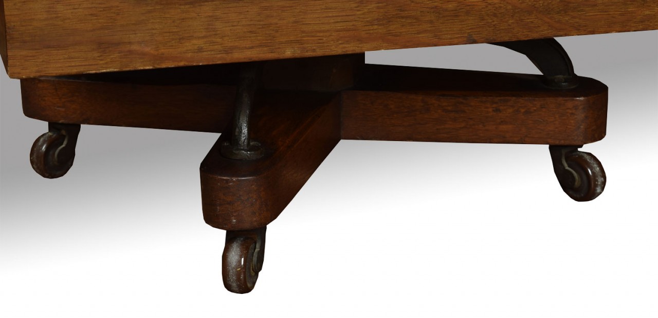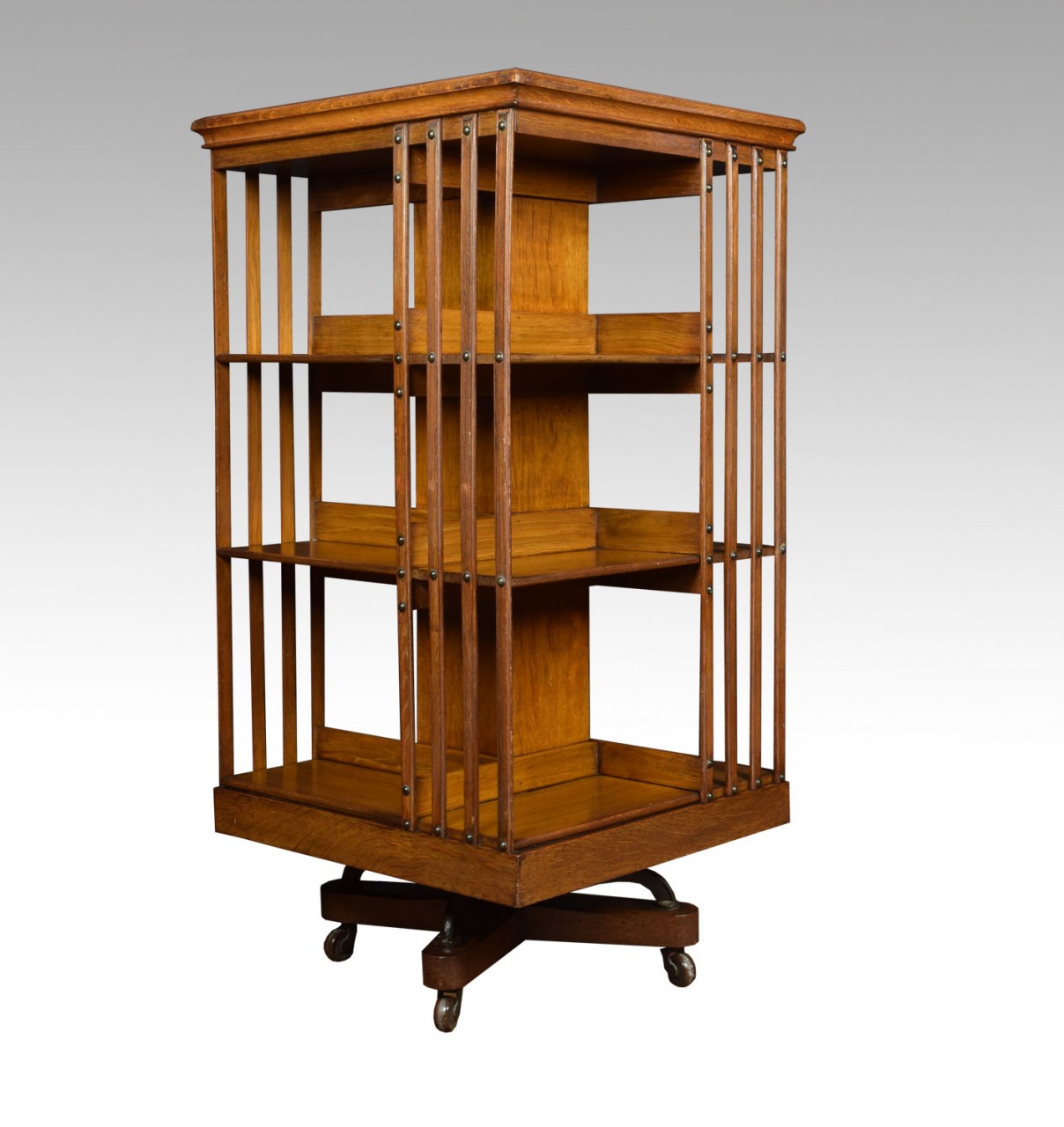 Large oak revolving bookcase having three tiers with an arrangement of shelves raised up on metal cruciform base with castors