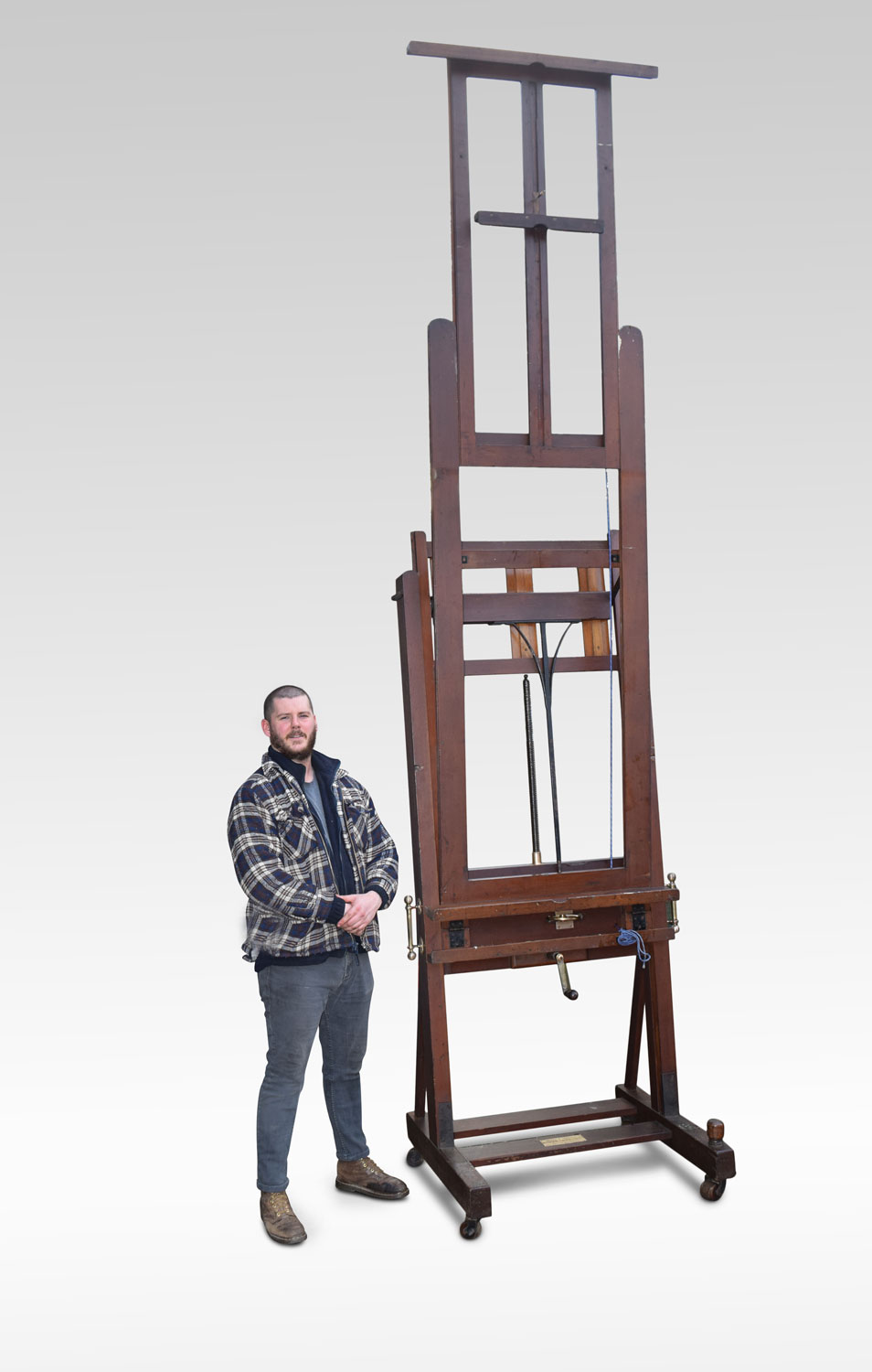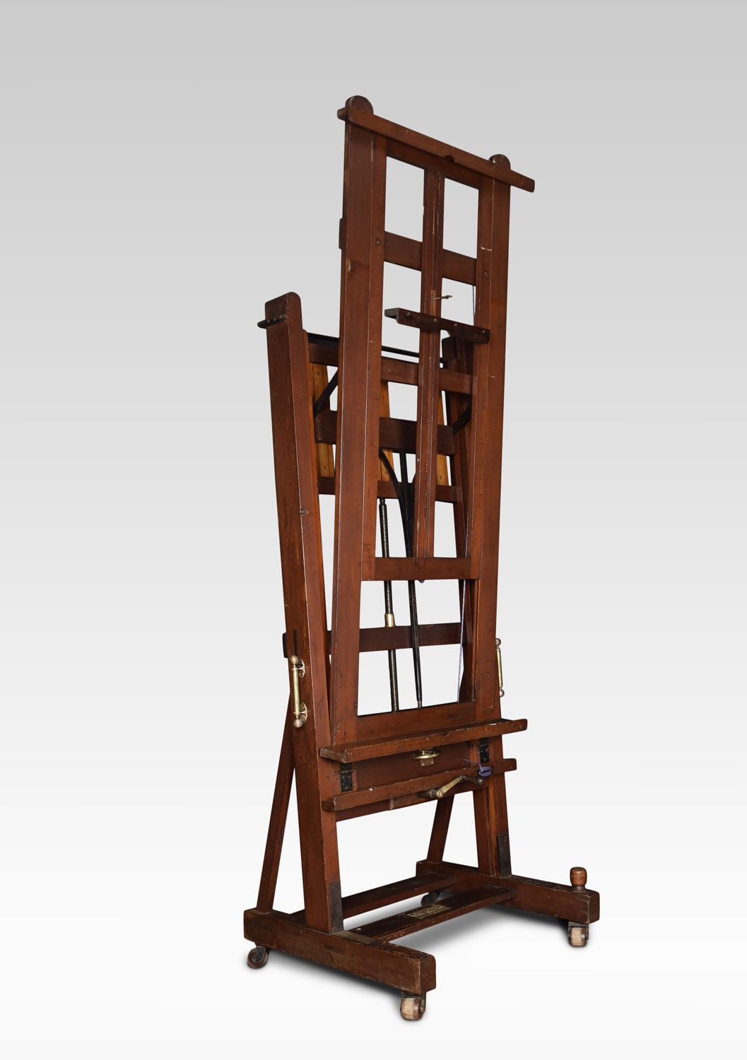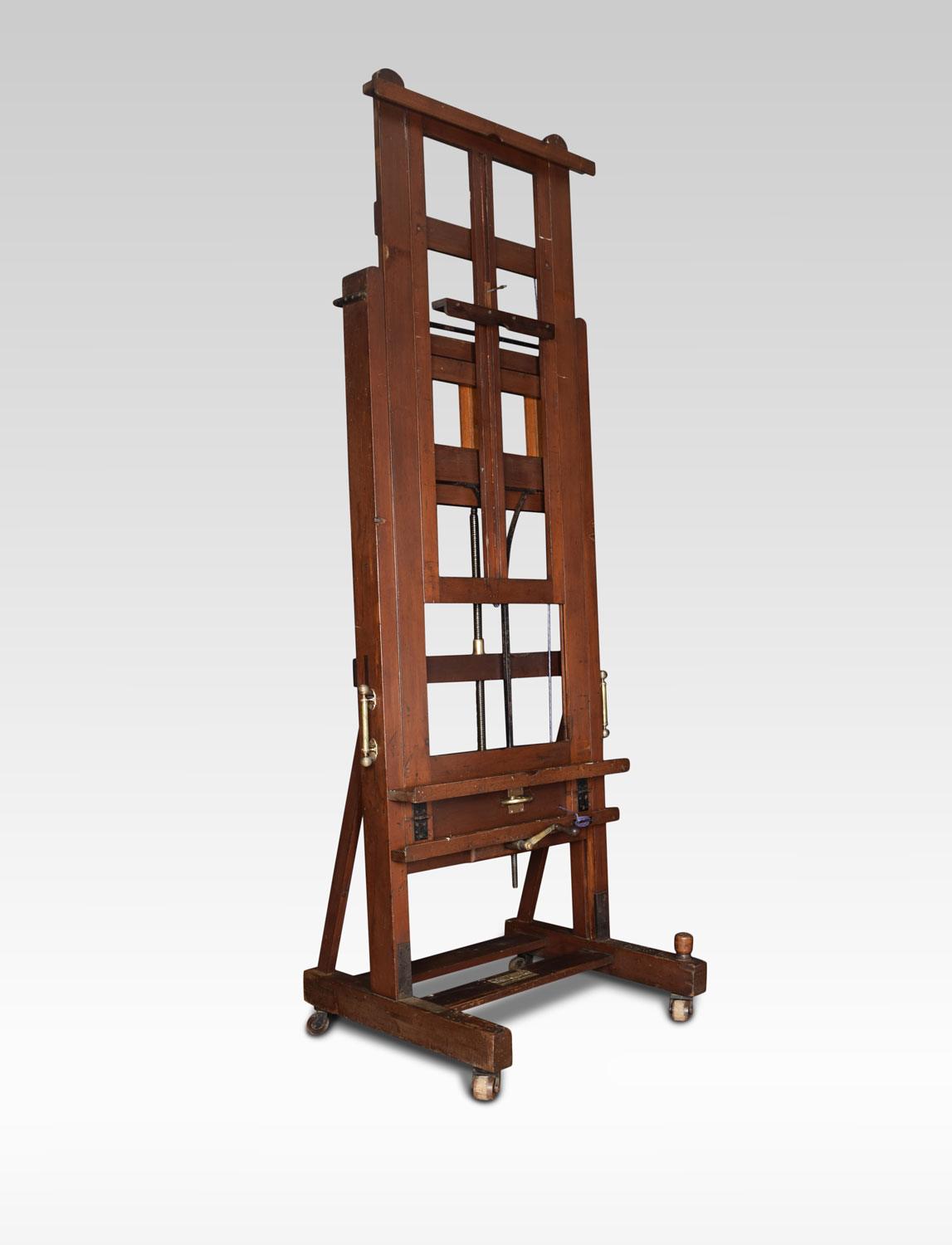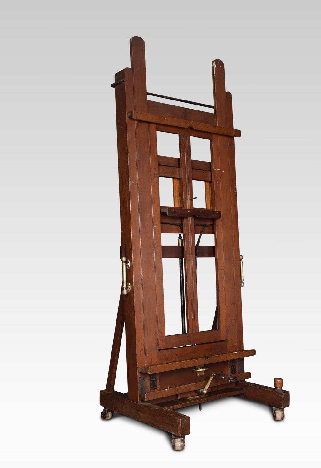 Large oak Windsor and Newton artist’s fully adjustable studio easel raised up on trestle base terminating in four lignum vitae casters.