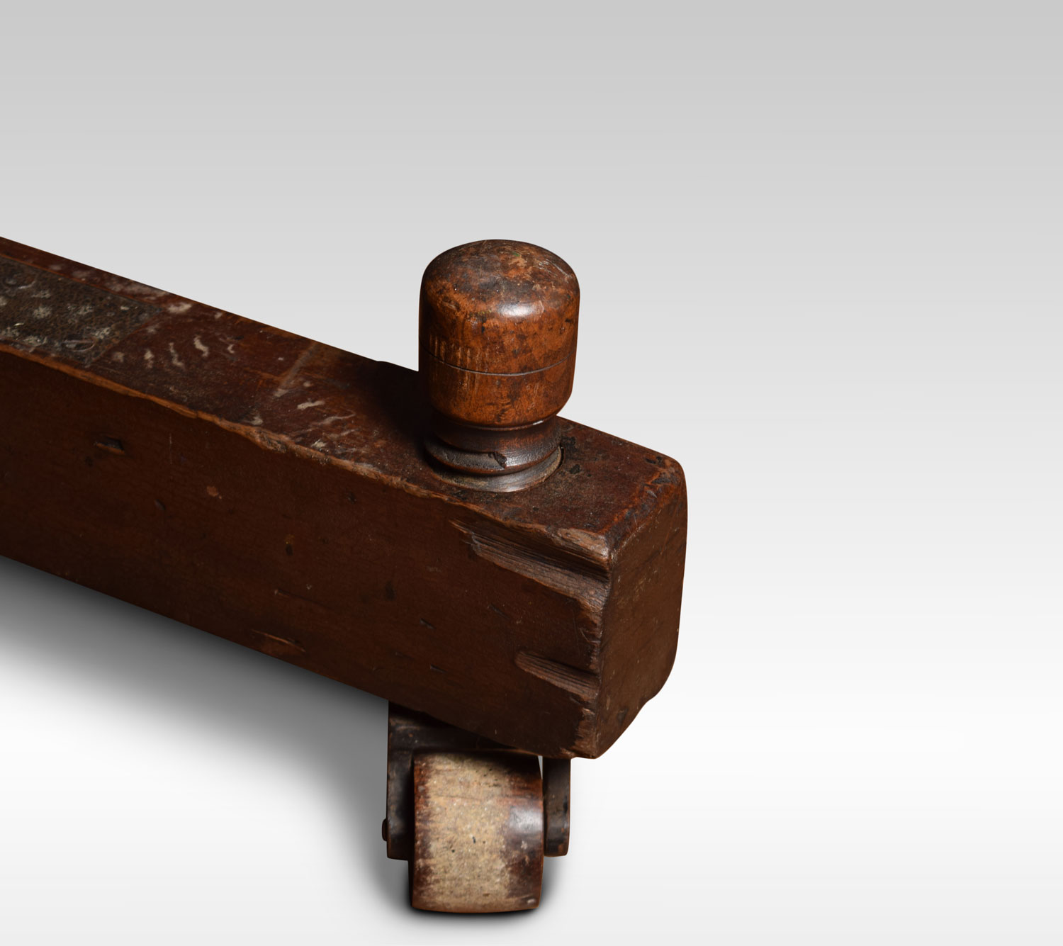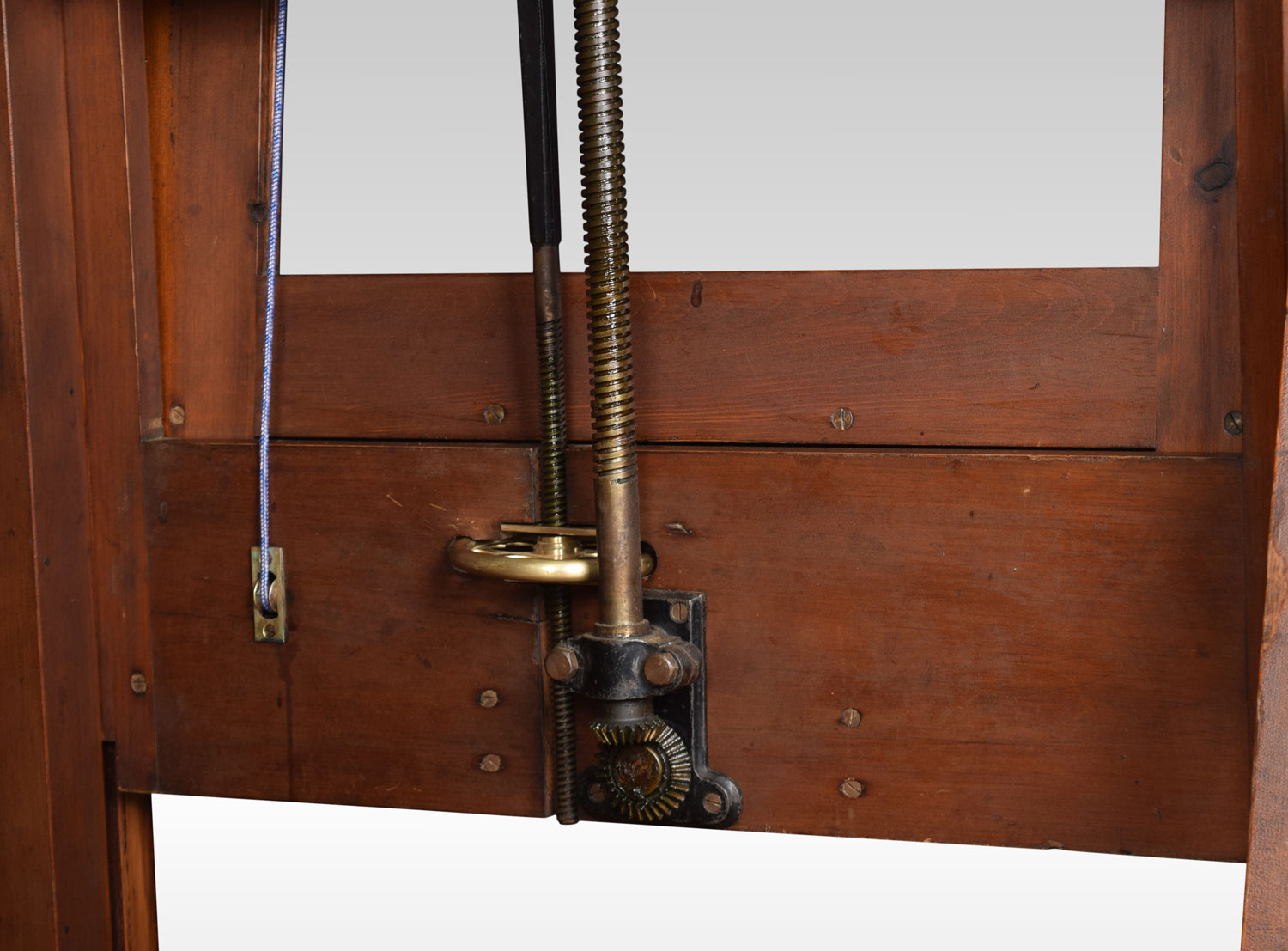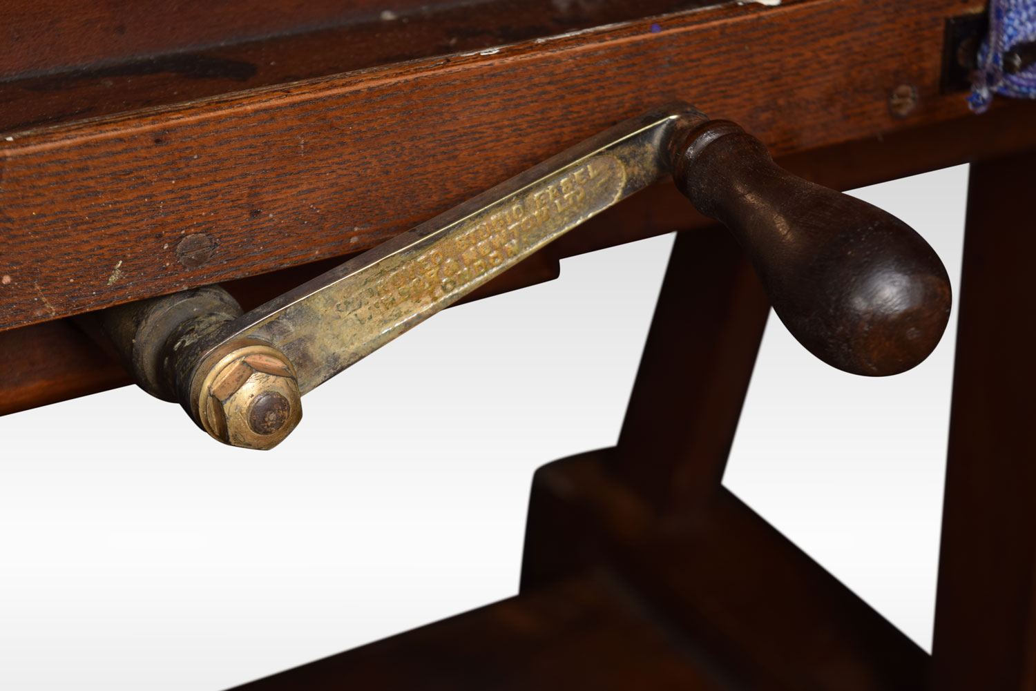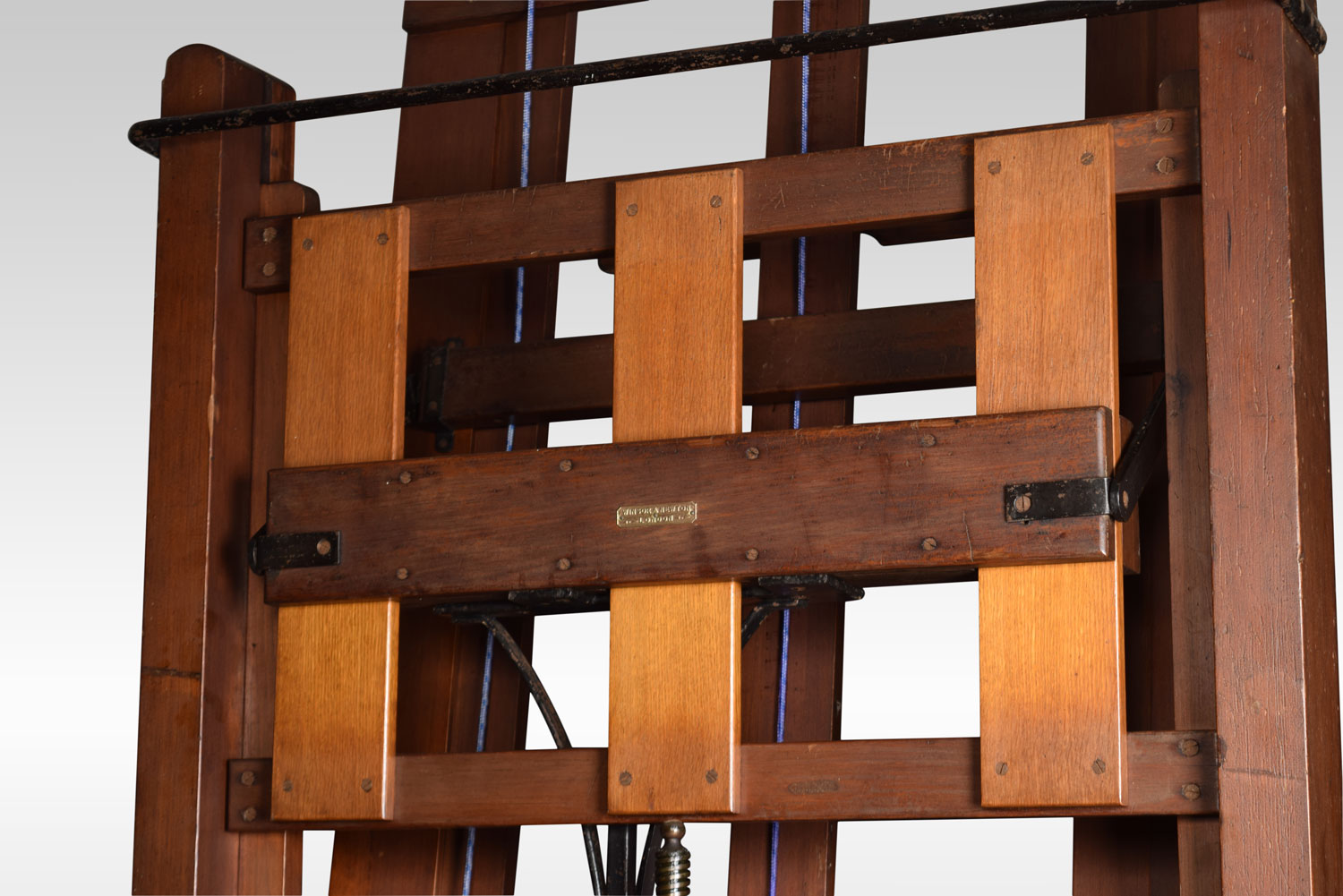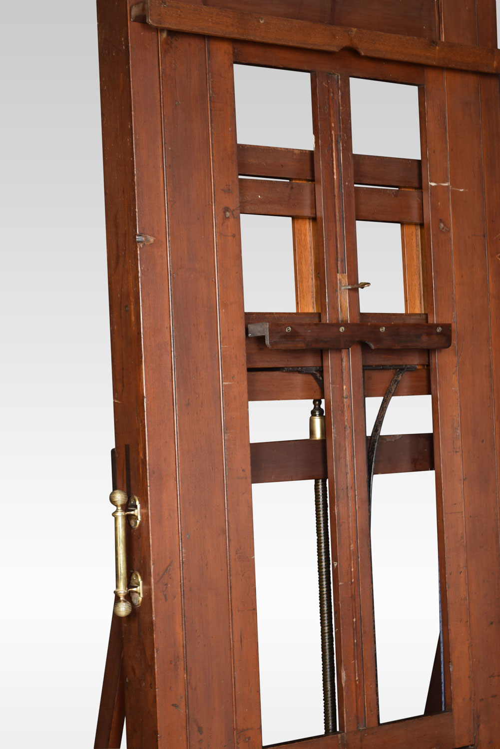 Large oak Windsor and Newton artist’s fully adjustable studio easel raised up on trestle base terminating in four lignum vitae casters.