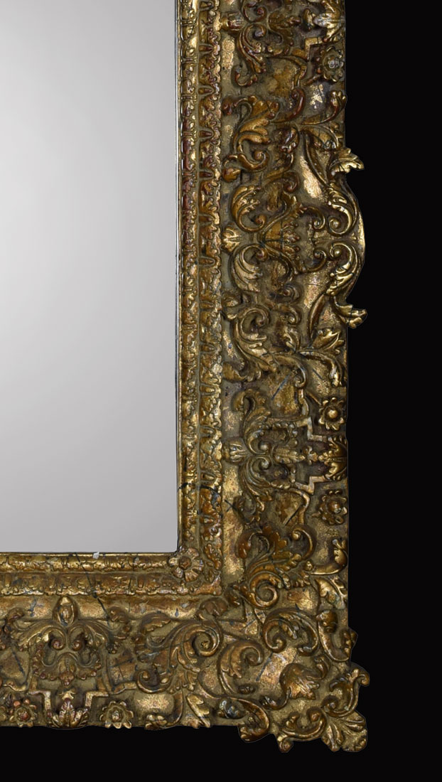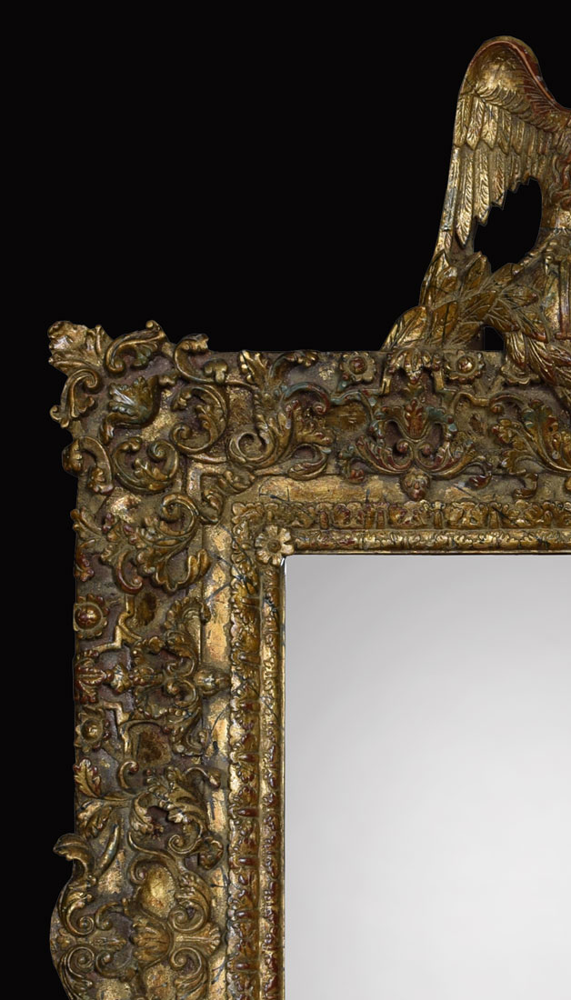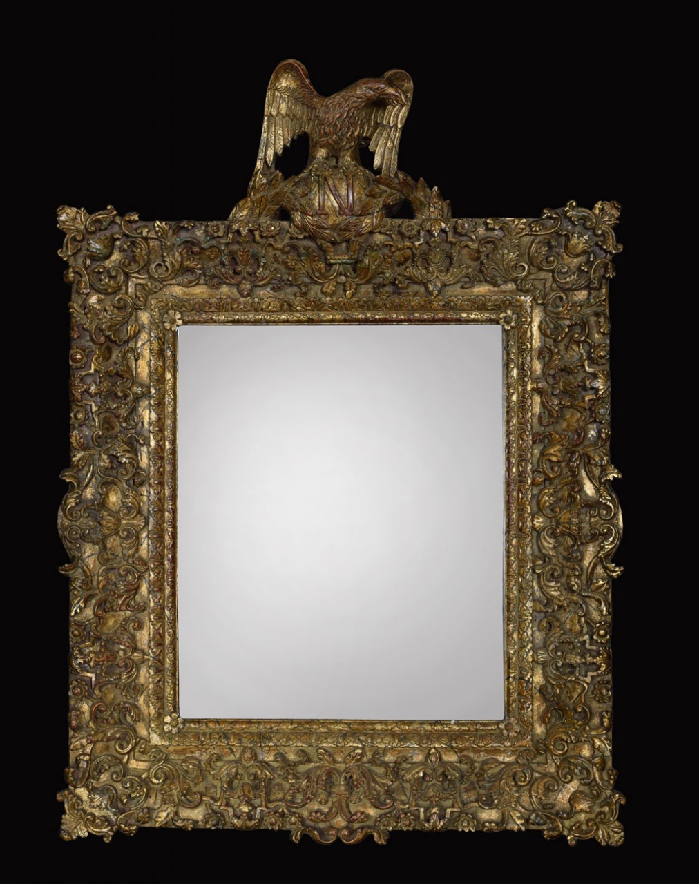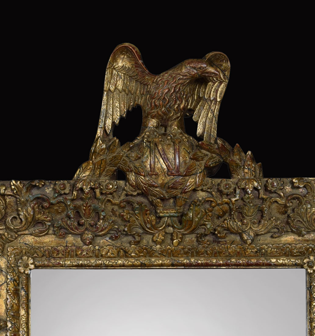 Large gilt wood wall mirror, the elaborate carved frame with a floral scrolling design, having an eagle surmount with the initial N