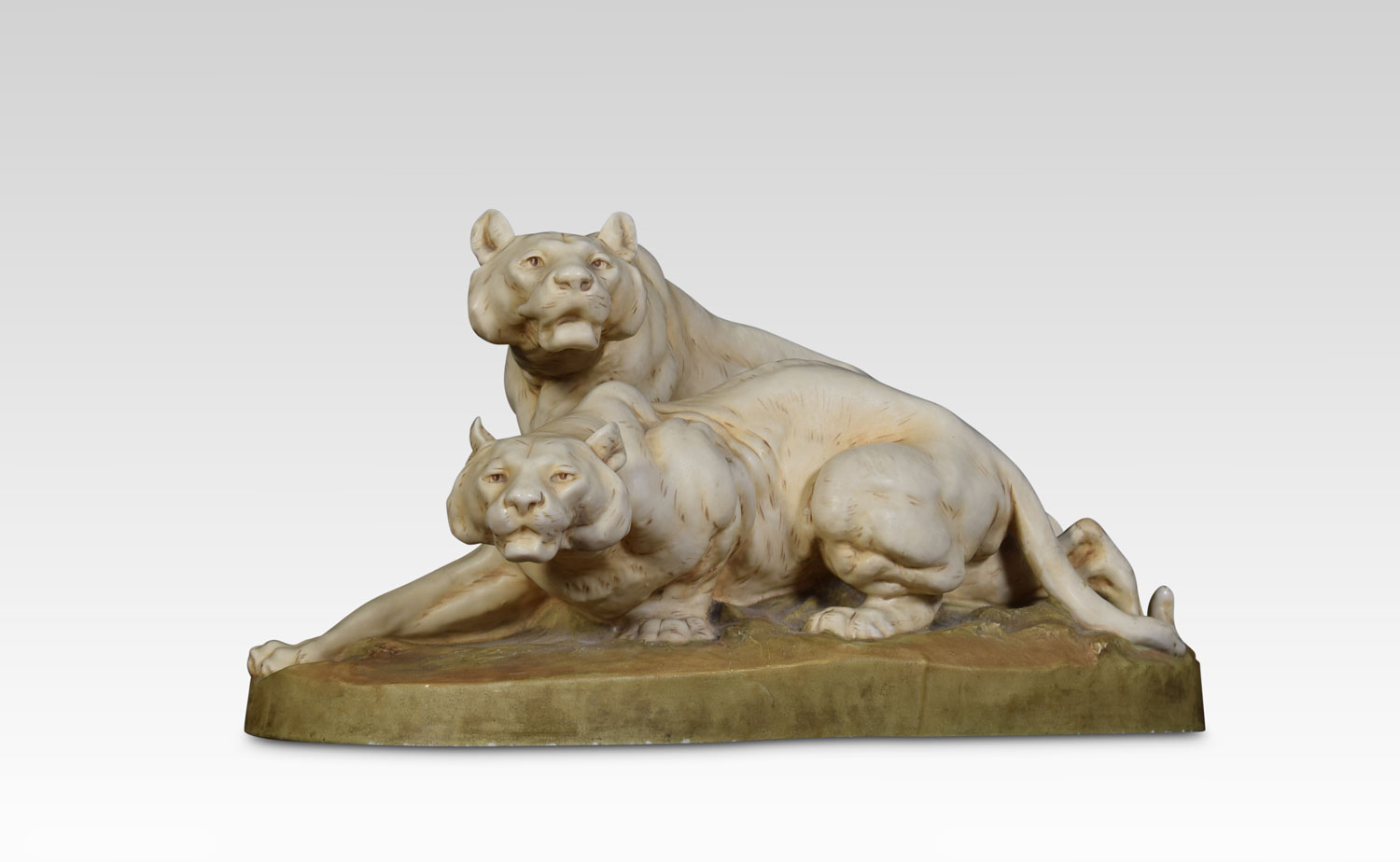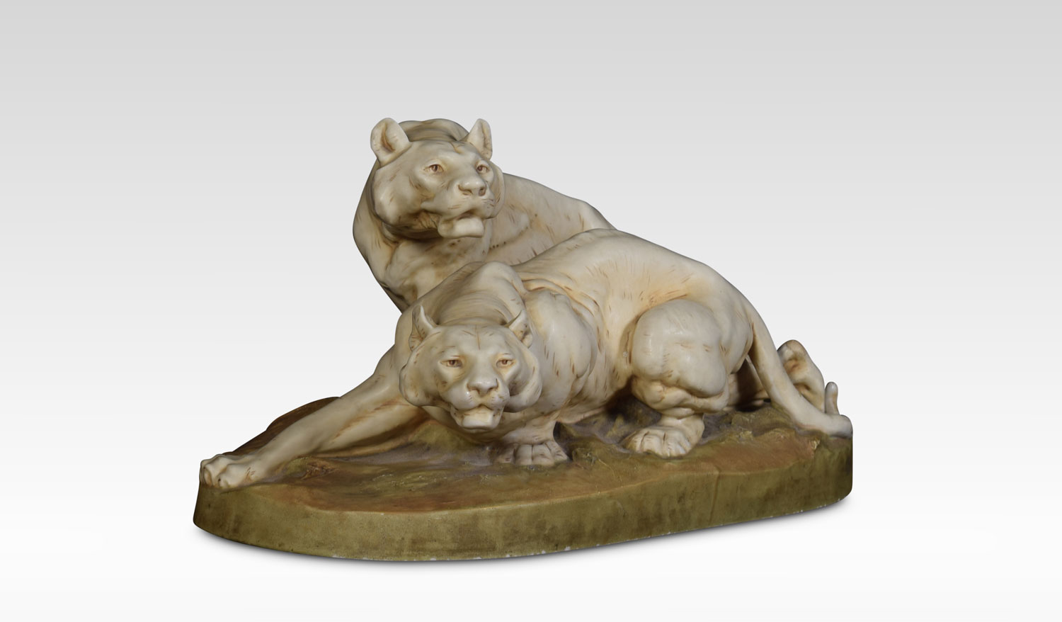 Royal Dux Figure of two lionesses raised up on naturalistic base. Applied pink triangle makers mark to underside of base.