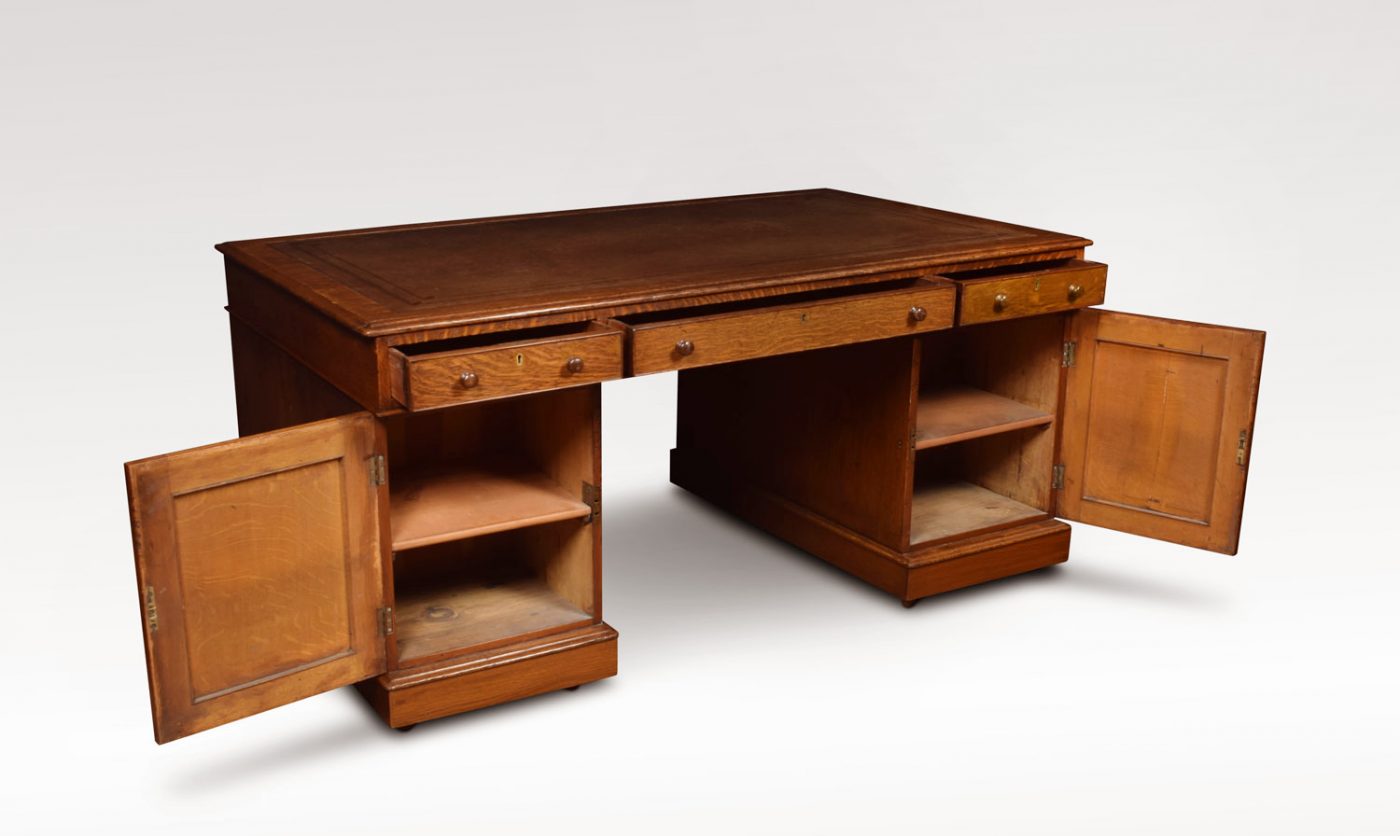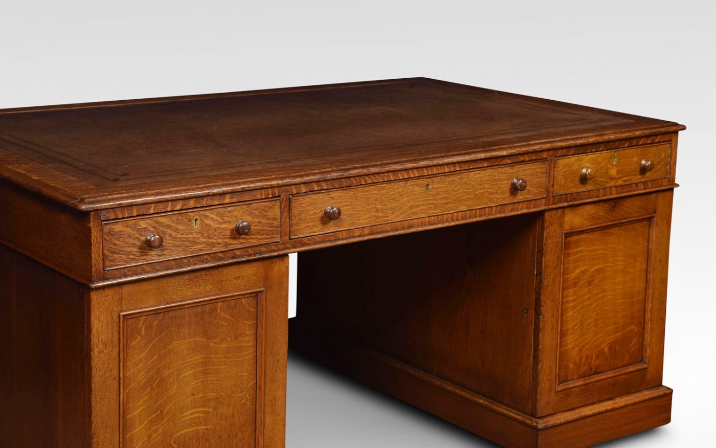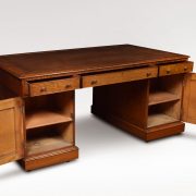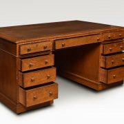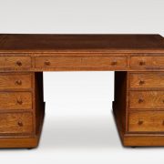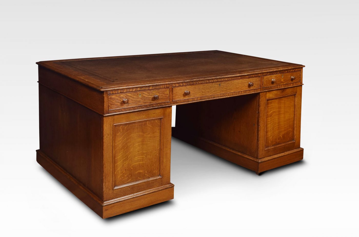 Large Victorian oak partners desk the rectangular top with inset leather having tooled border enclosed by a moulded edge over an arrangement of three freeze drawers. Above two large pedestals one side with two banks of three draws the opposing side fitted with cupboard doors open to reveal large storage area and single fixed shelf. All raised up on plinth bases terminating in castors.