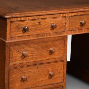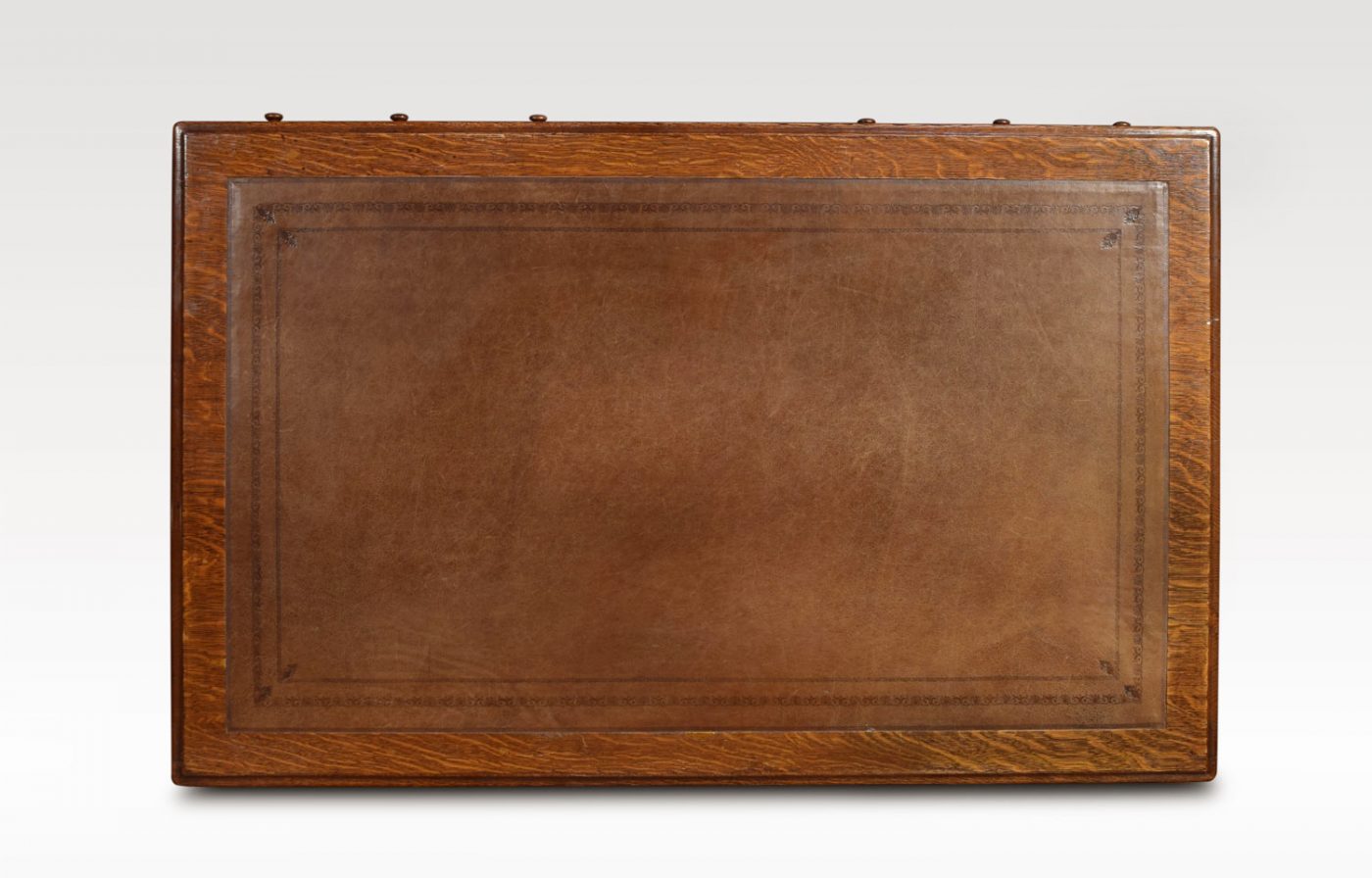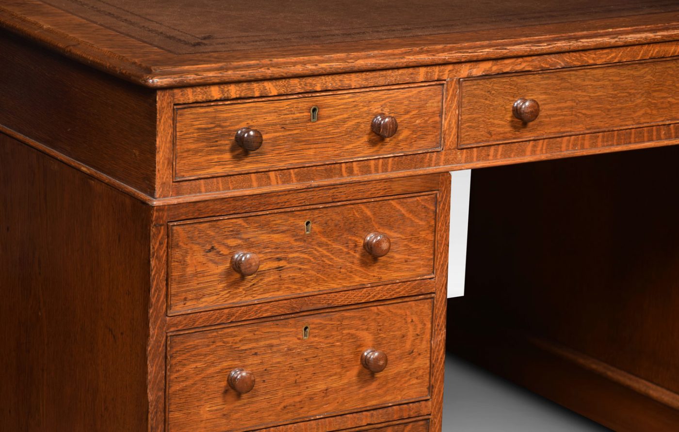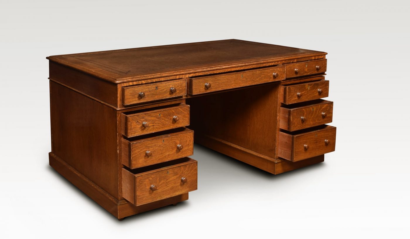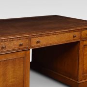 Large Victorian oak partners desk the rectangular top with inset leather having tooled border enclosed by a moulded edge over an arrangement of three freeze drawers. Above two large pedestals one side with two banks of three draws the opposing side fitted with cupboard doors open to reveal large storage area and single fixed shelf. All raised up on plinth bases terminating in castors.