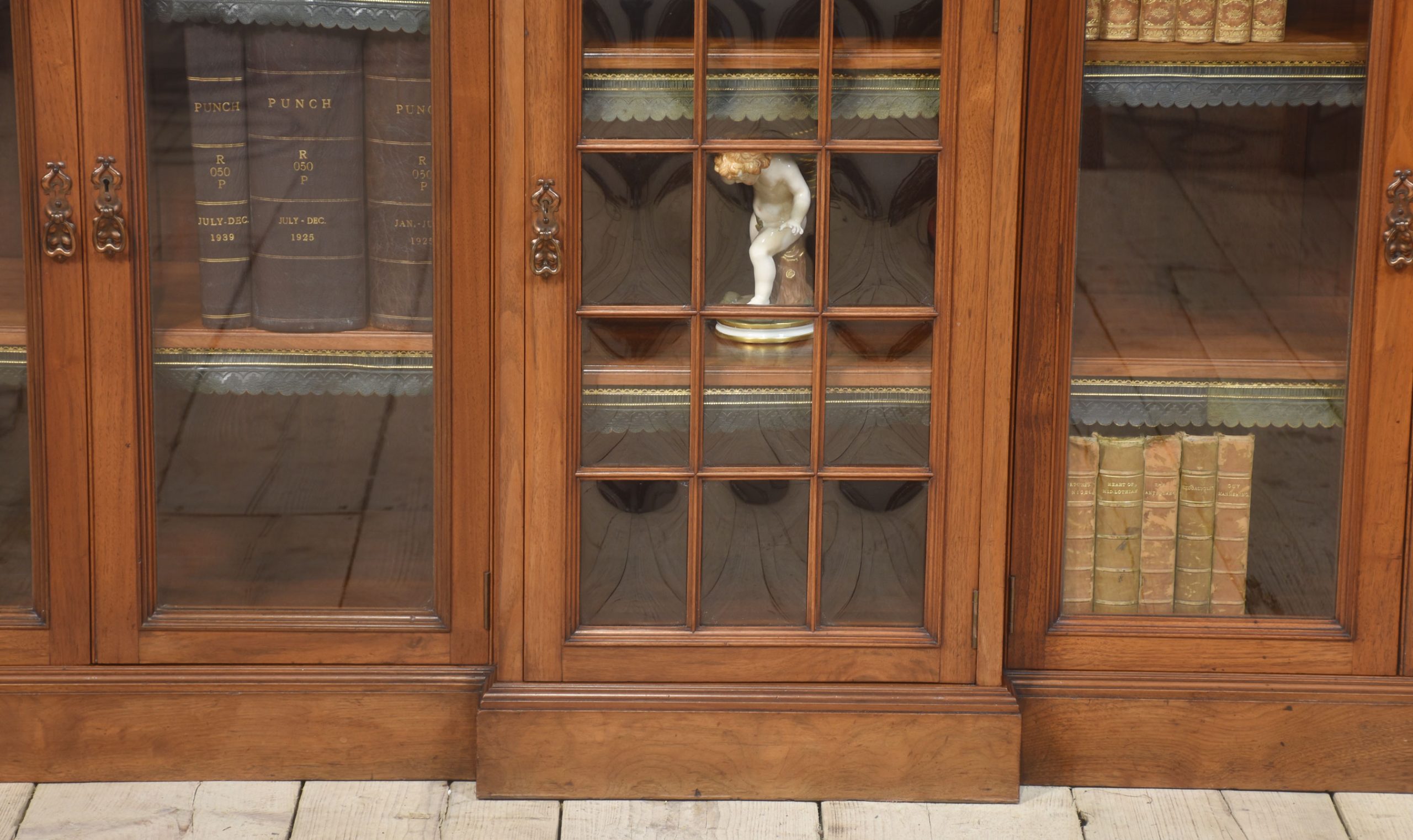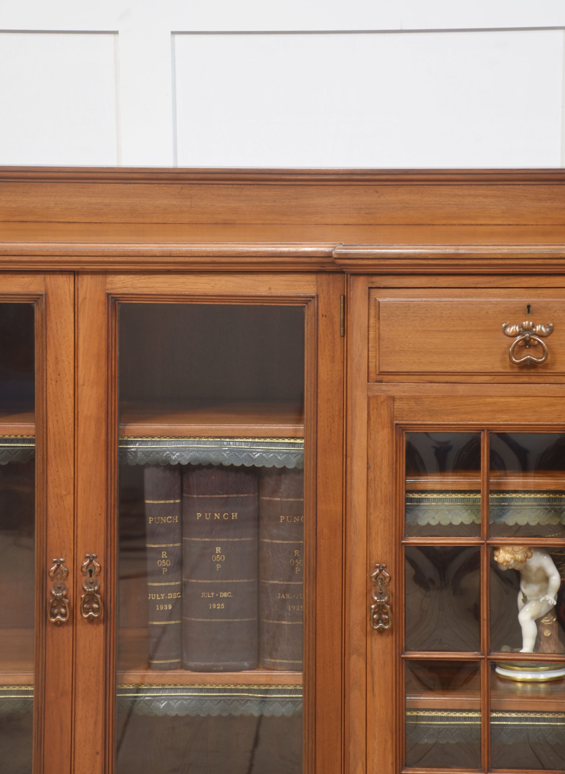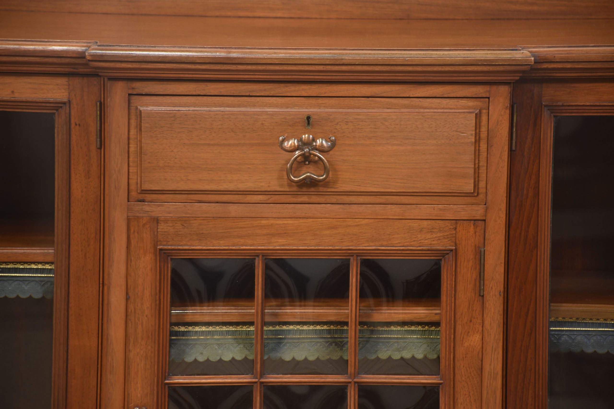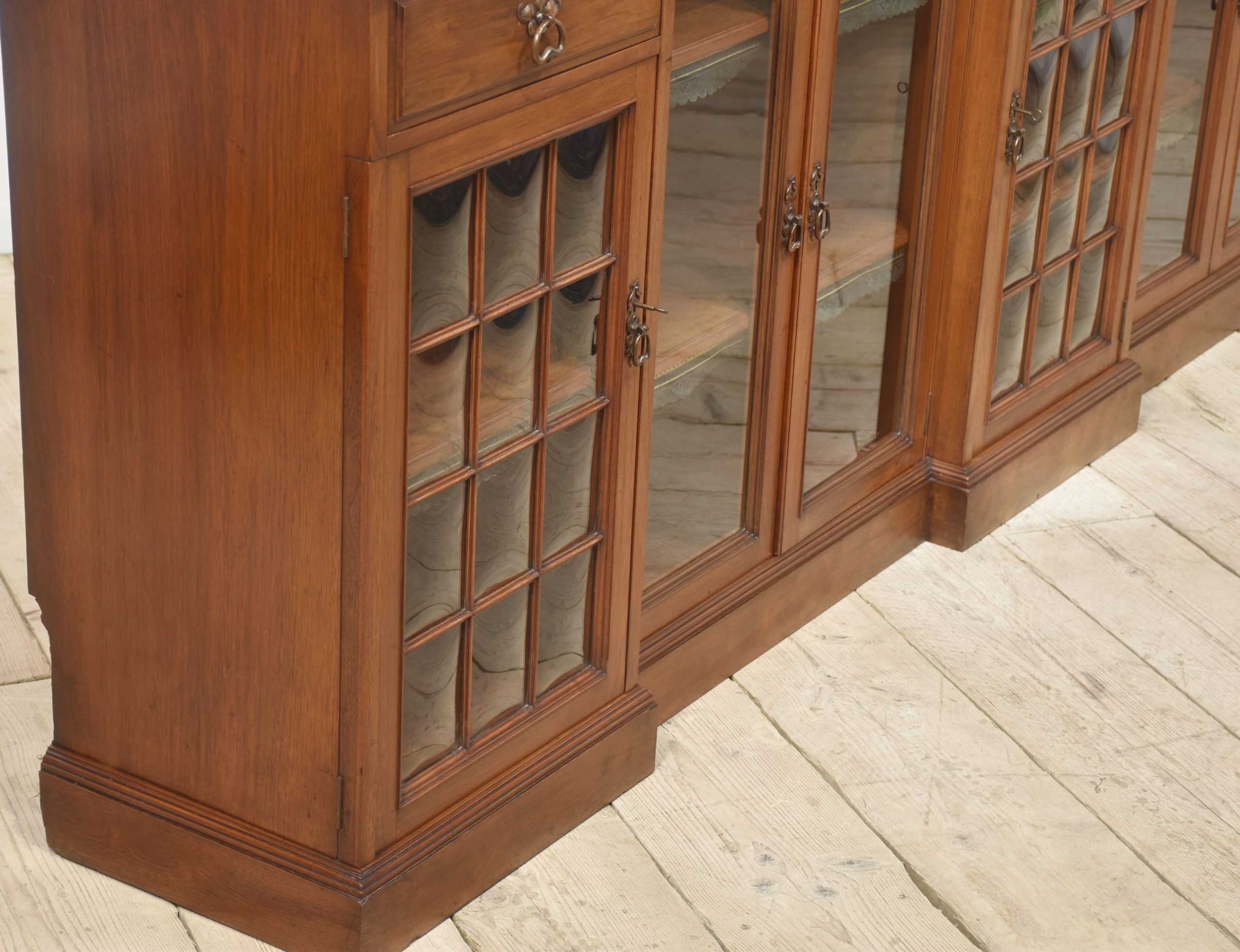 Arts and crafts walnut bookcase, the rectangular breakfront top having a raised gallery back, above three frieze drawers with stylised handles. supported on an arrangement of glazed doors opening to reveal an adjustable shelved interior. All raised on a plinth base.