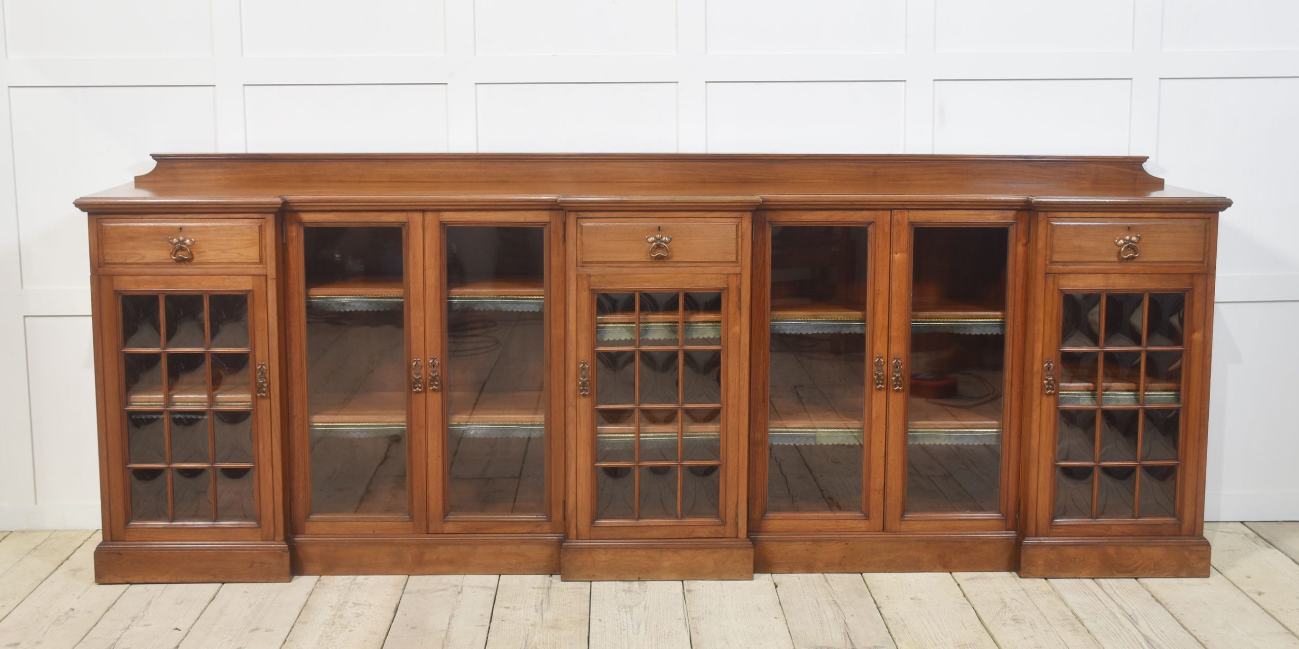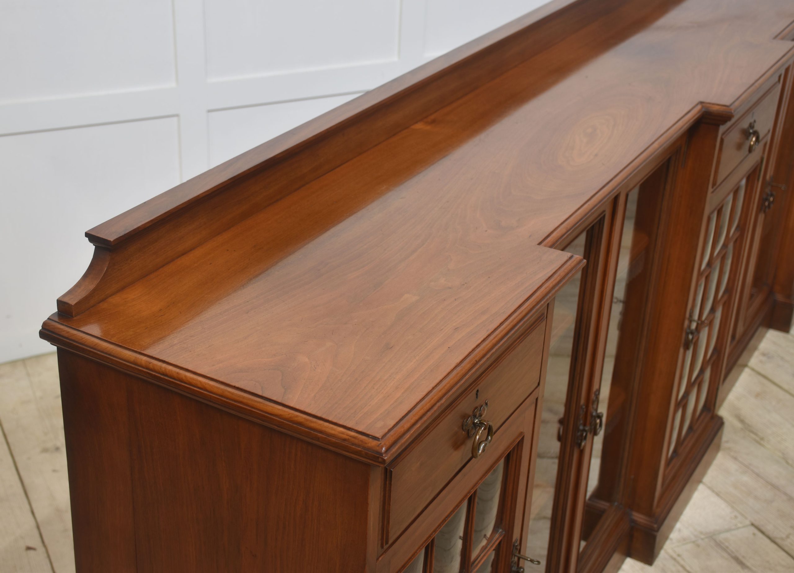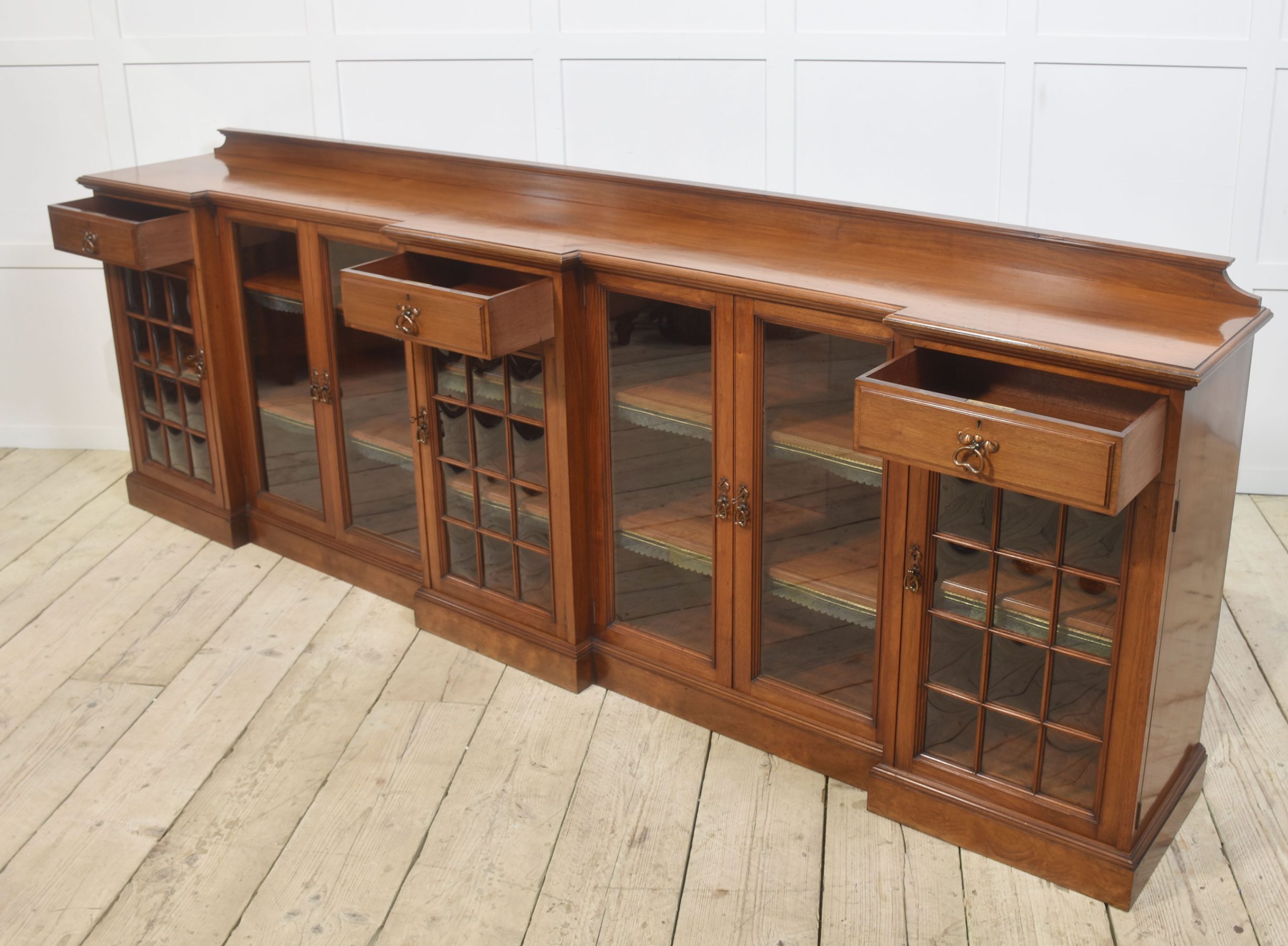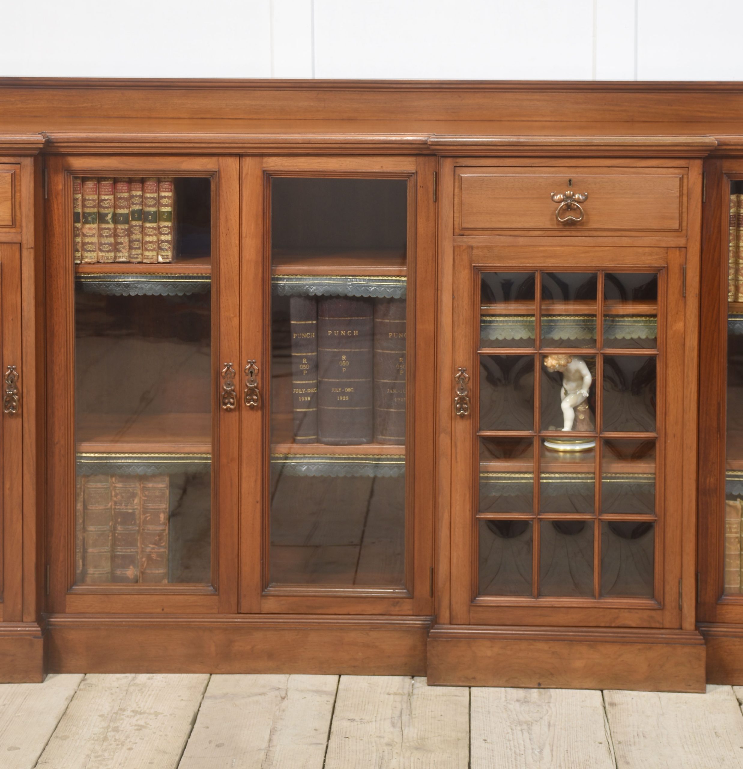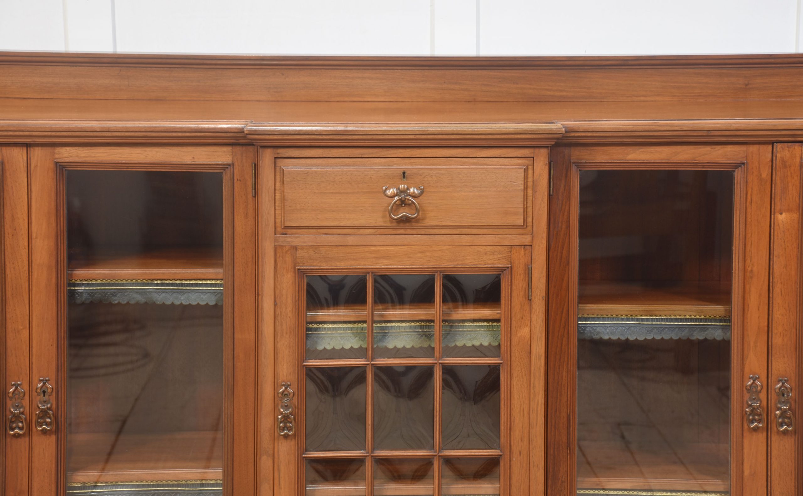 Arts and crafts walnut bookcase, the rectangular breakfront top having a raised gallery back, above three frieze drawers with stylised handles. supported on an arrangement of glazed doors opening to reveal an adjustable shelved interior. All raised on a plinth base.