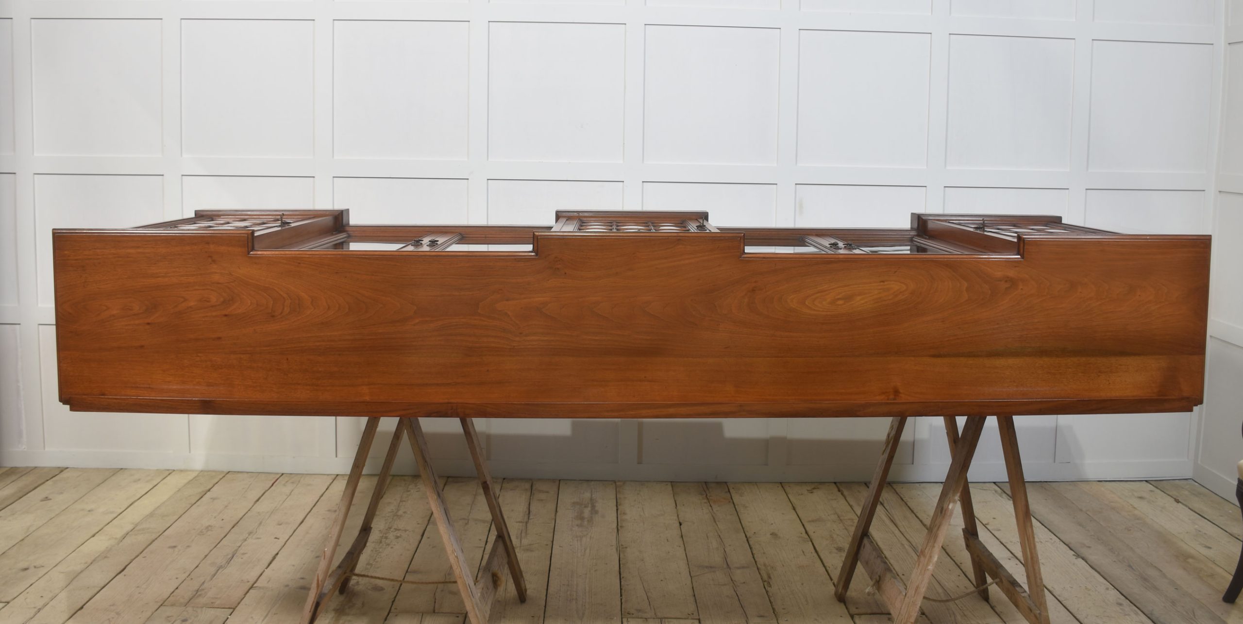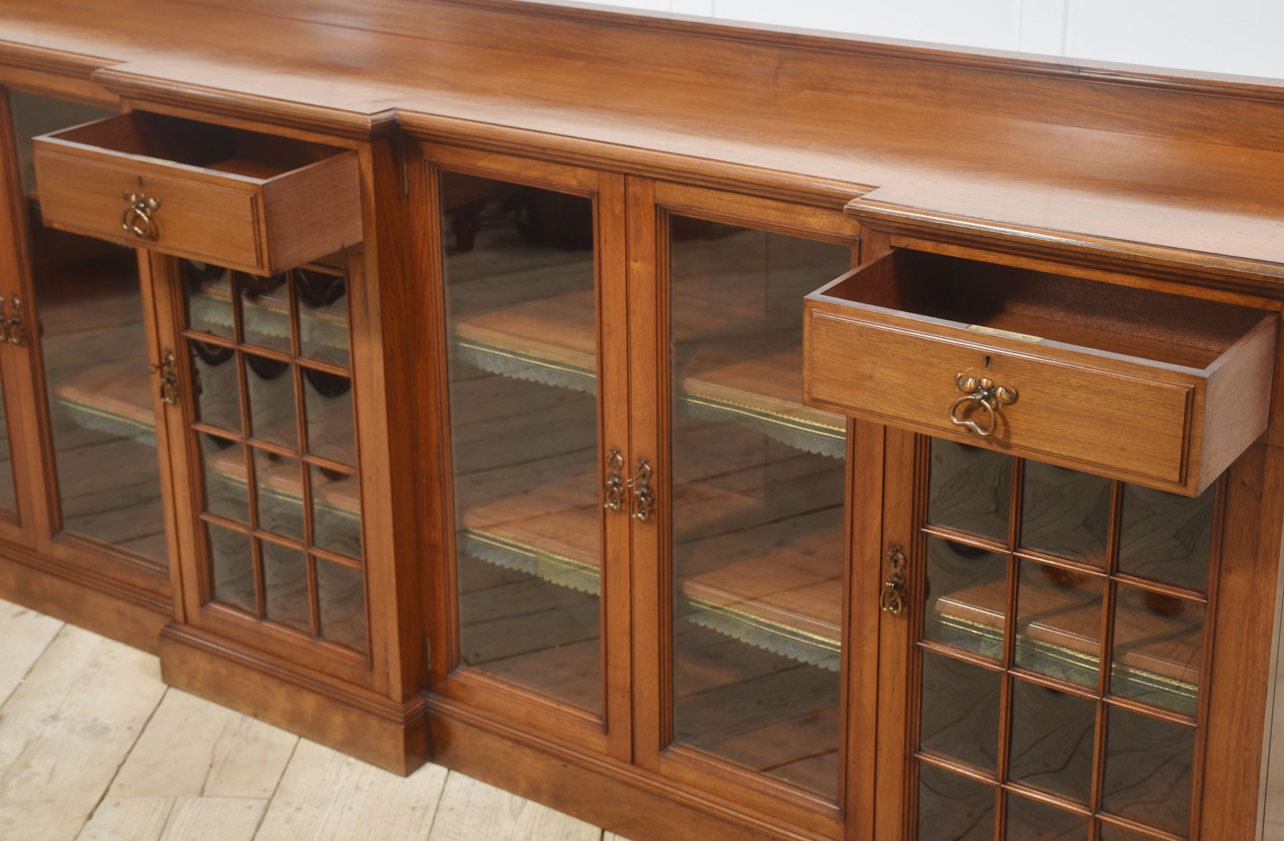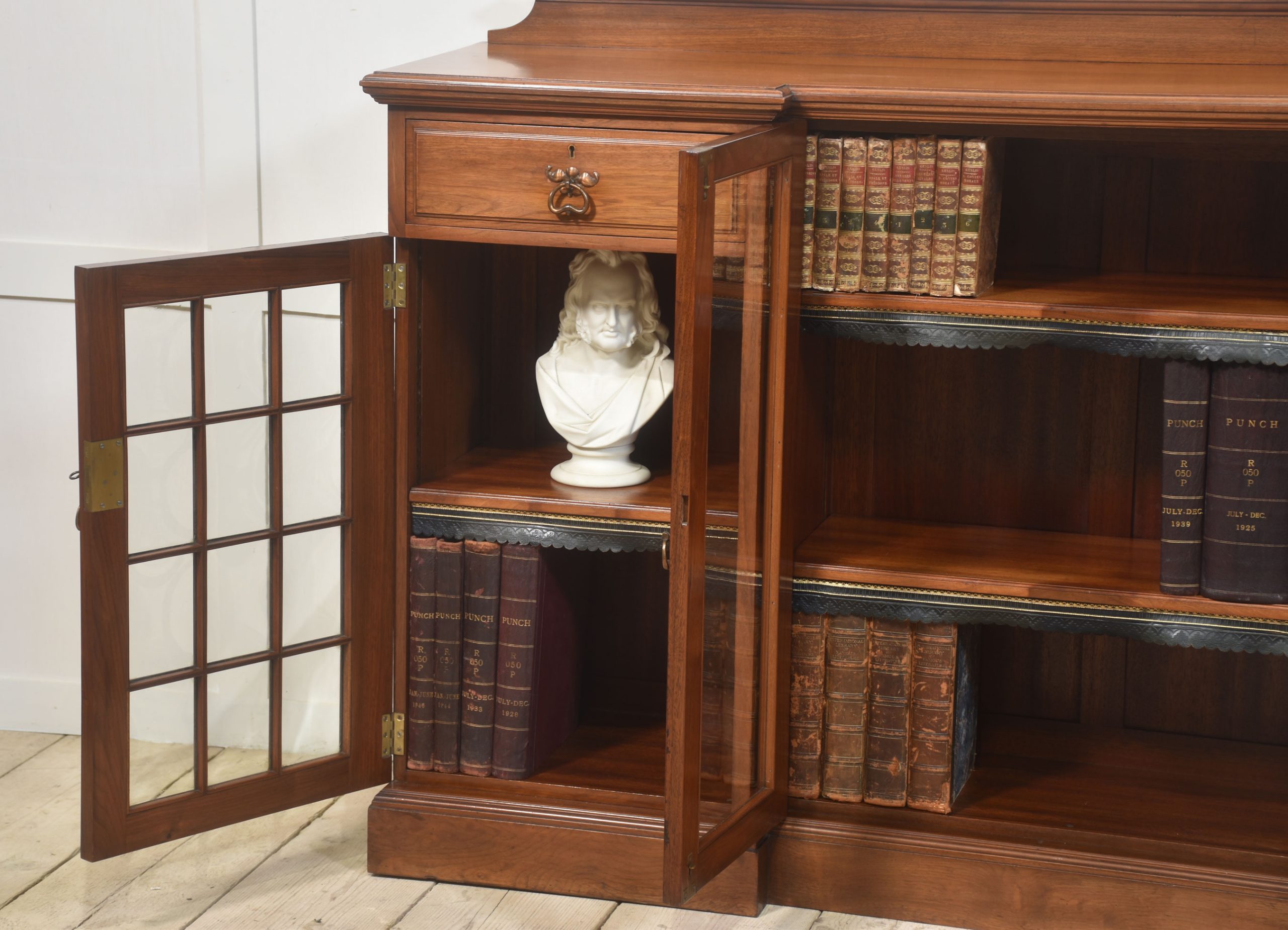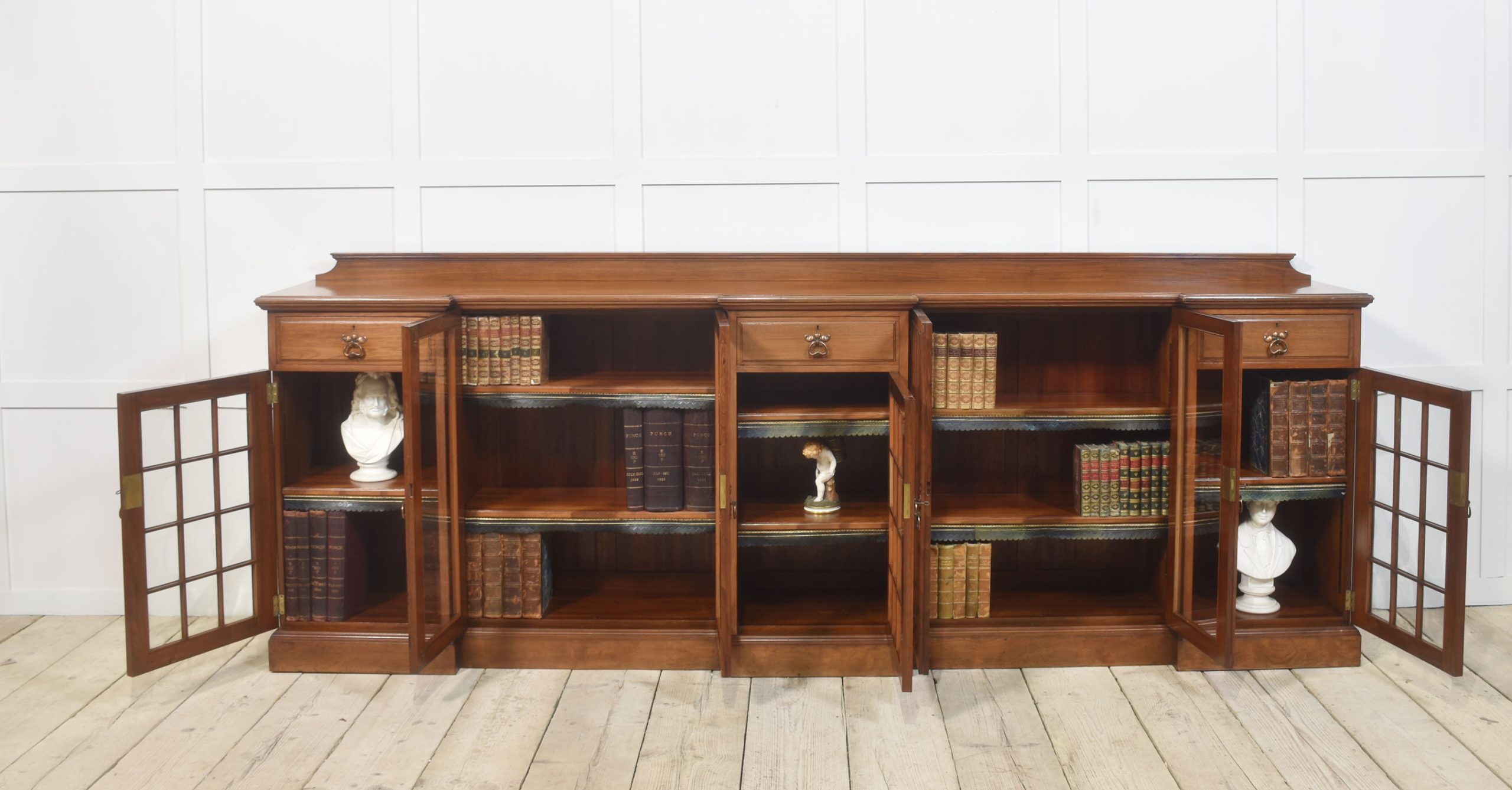 Arts and crafts walnut bookcase, the rectangular breakfront top having a raised gallery back, above three frieze drawers with stylised handles. supported on an arrangement of glazed doors opening to reveal an adjustable shelved interior. All raised on a plinth base.