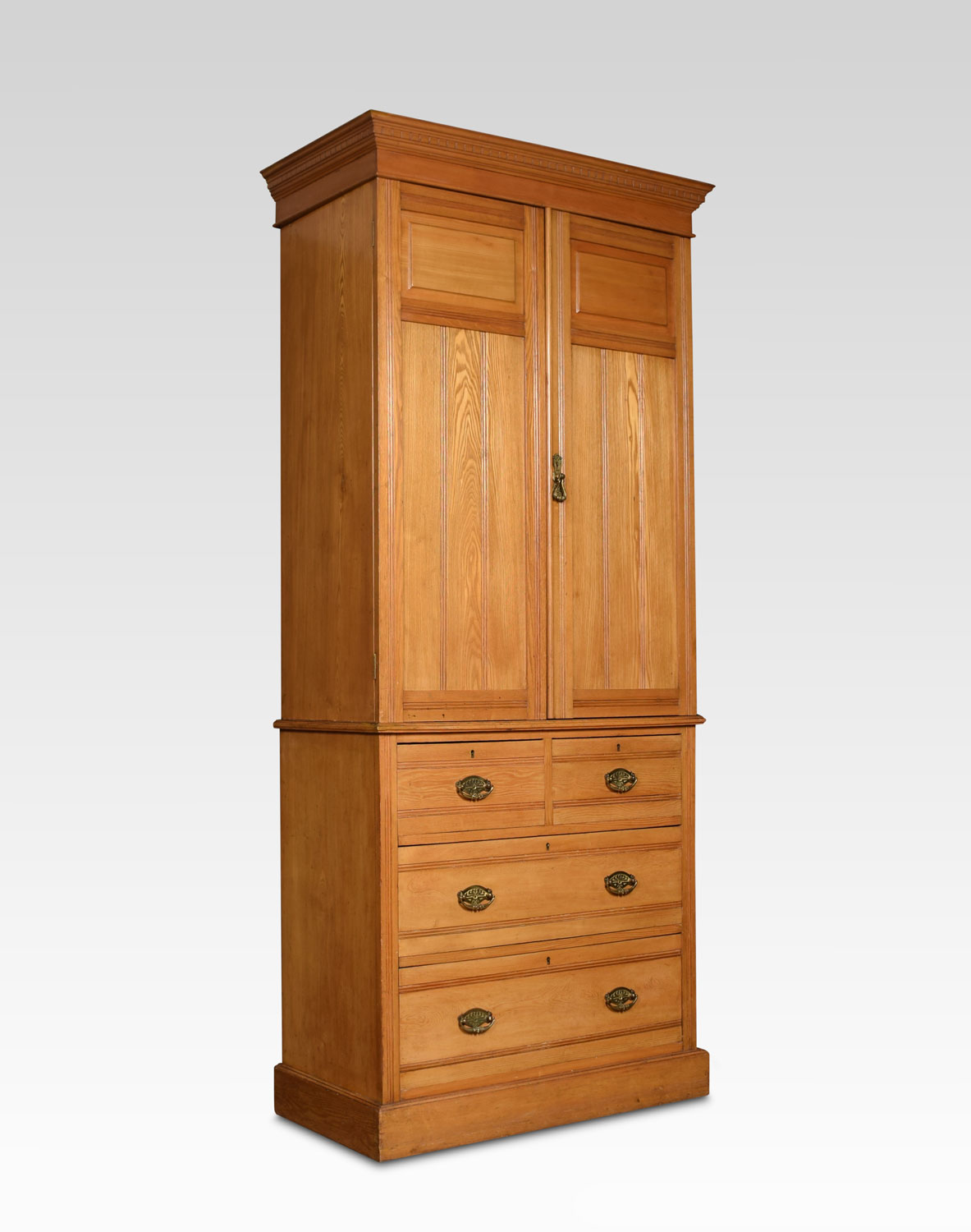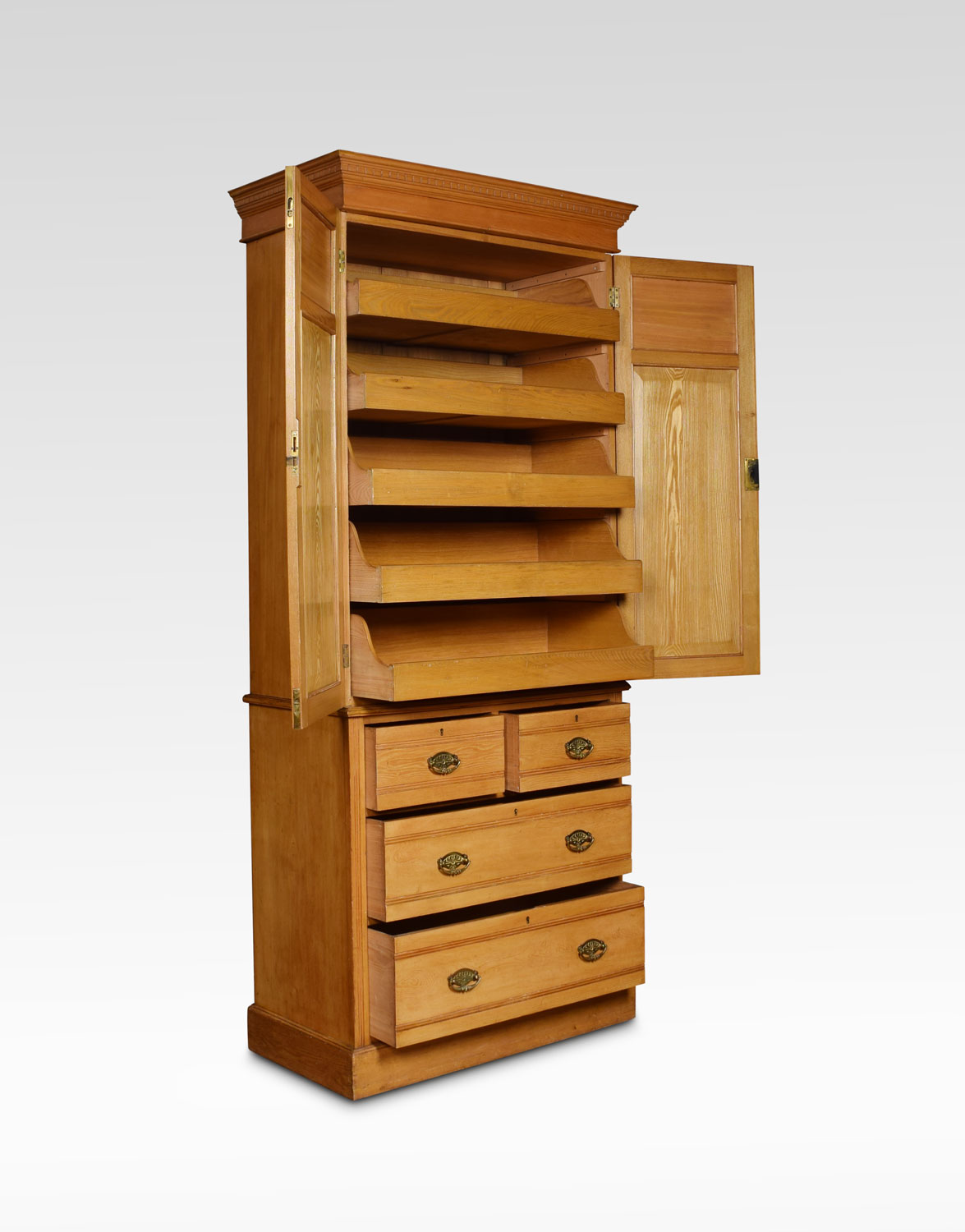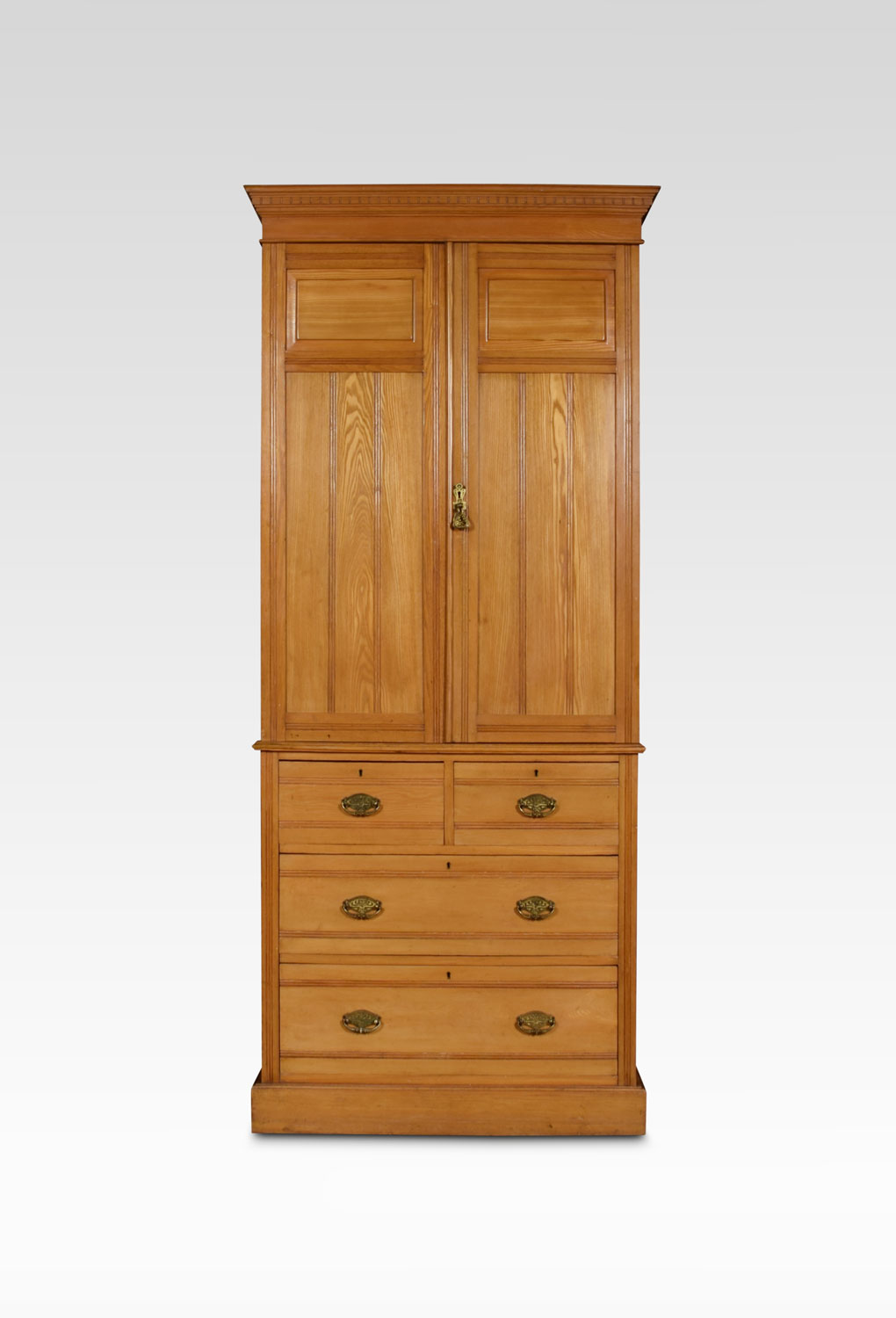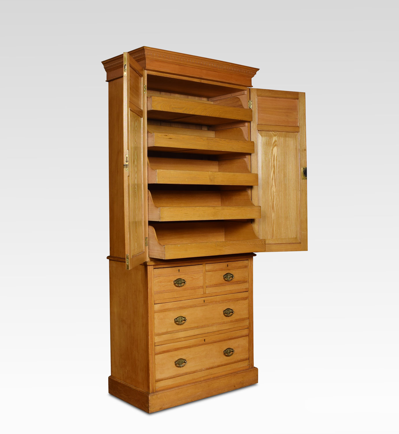 Late Victorian ash linen press of narrow proportions. The dentil moulded cornice above a pair of panelled doors enclosing five slides. The base section fitted with two short and two long drawers with original brass handles. All raised up on plinth base.