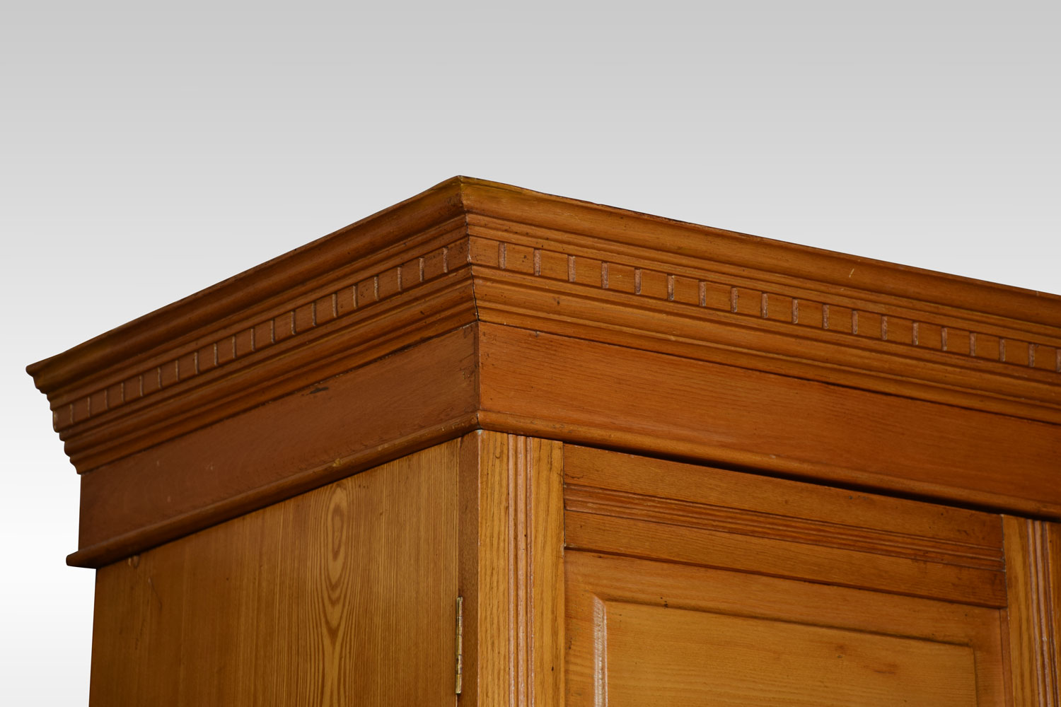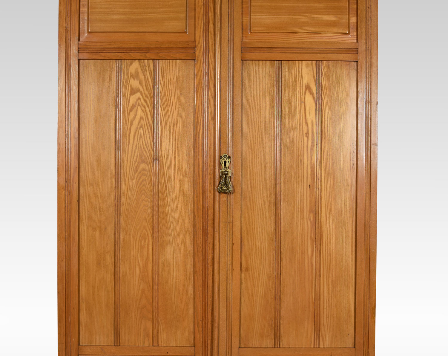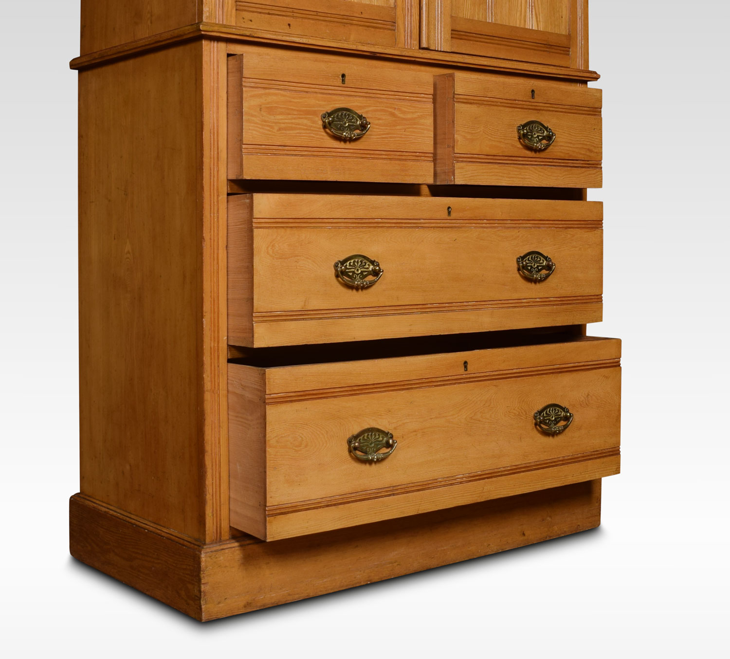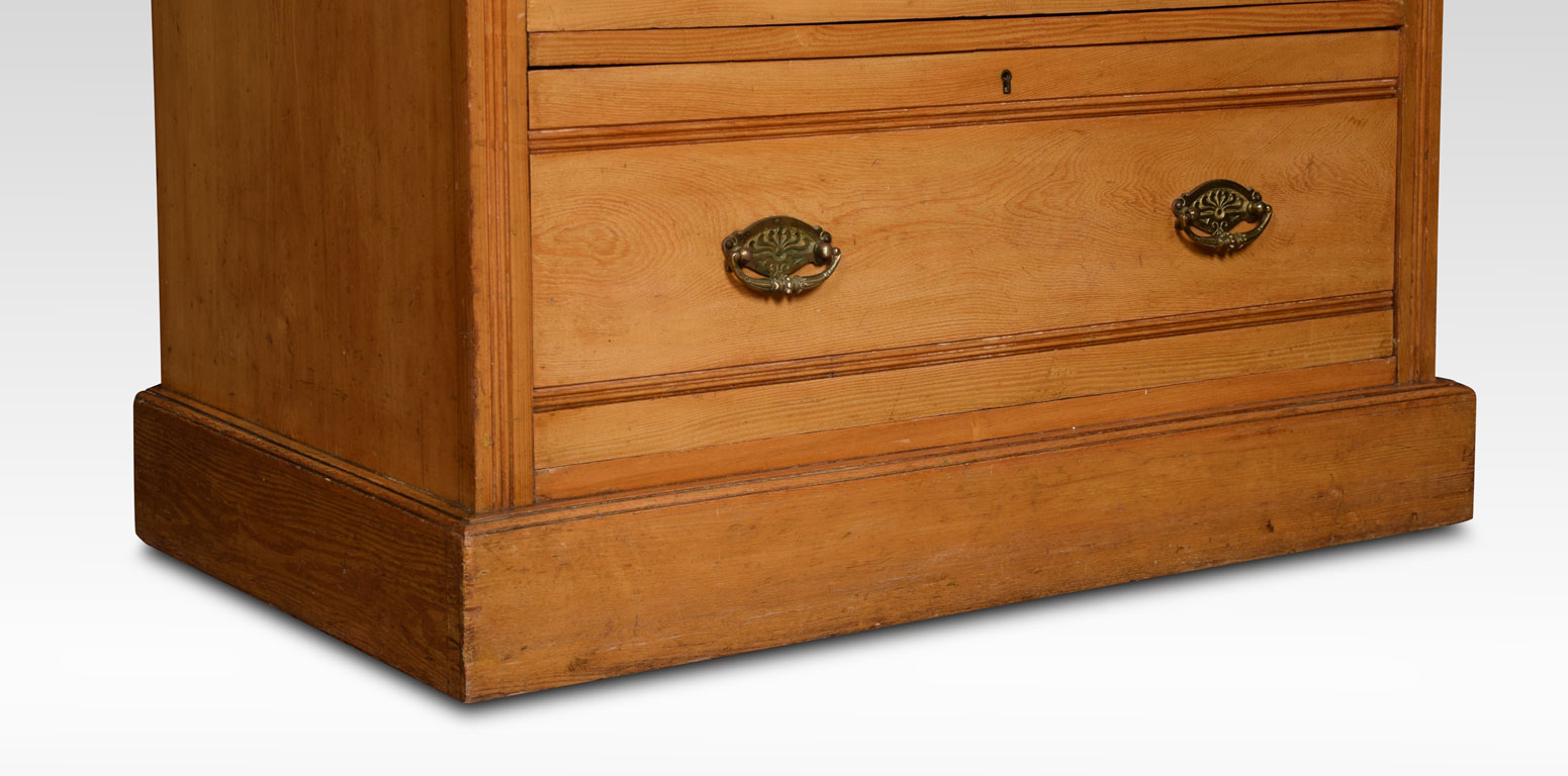 Late Victorian ash linen press of narrow proportions. The dentil moulded cornice above a pair of panelled doors enclosing five slides. The base section fitted with two short and two long drawers with original brass handles. All raised up on plinth base.