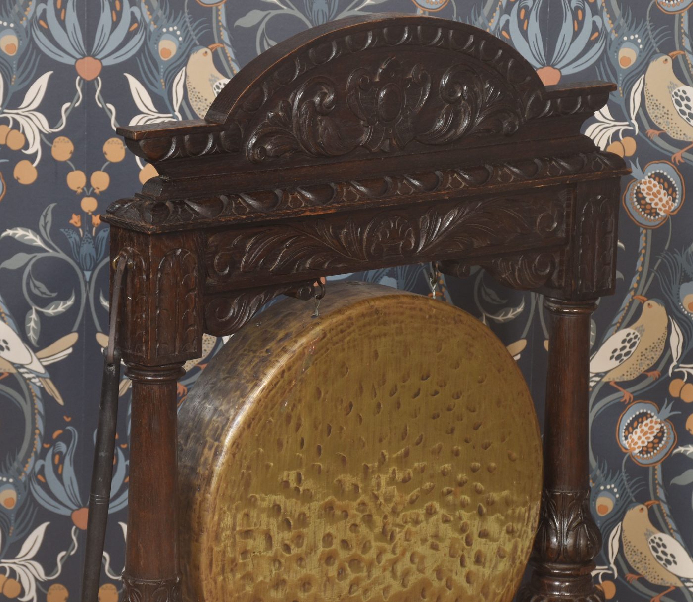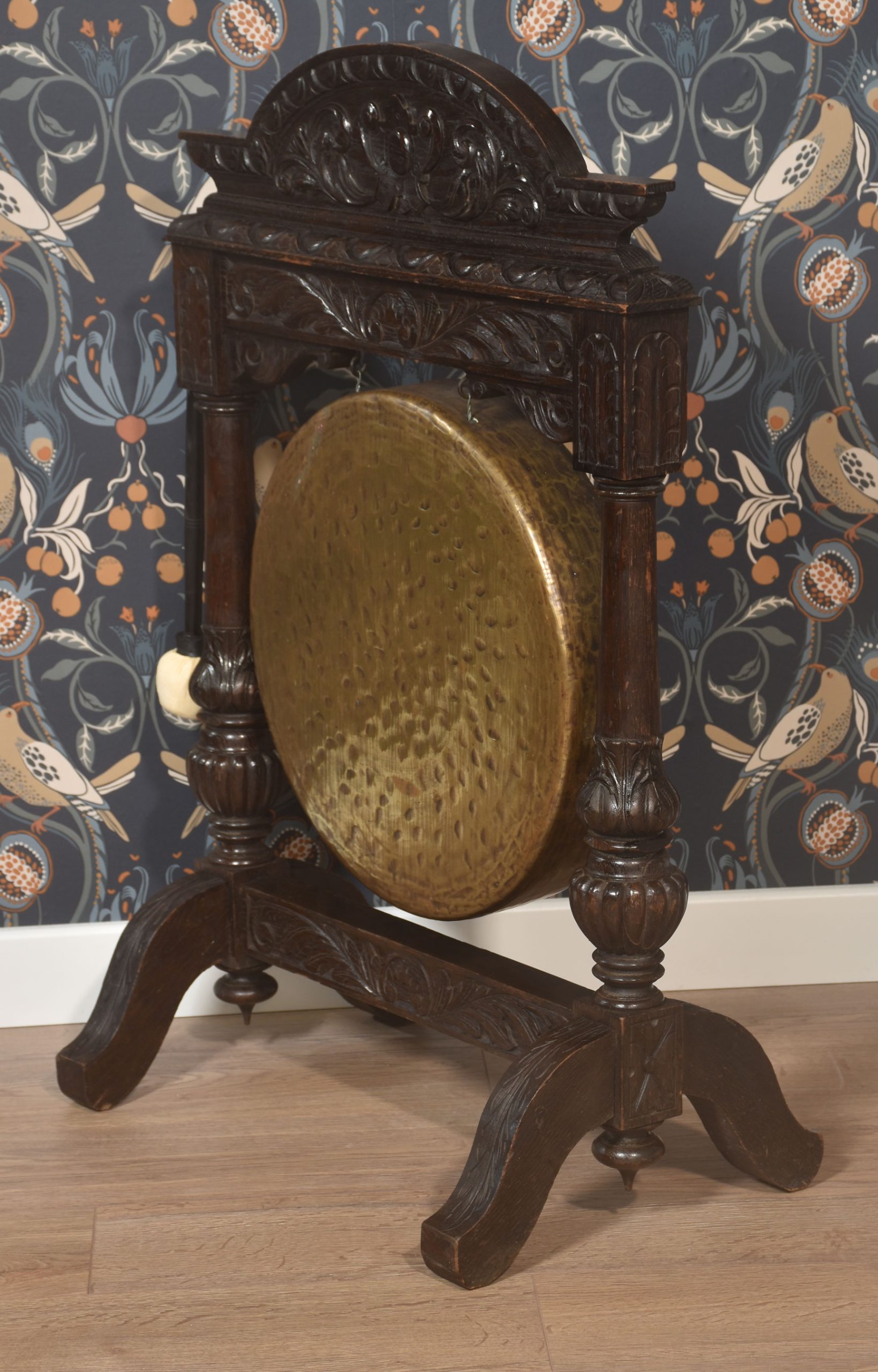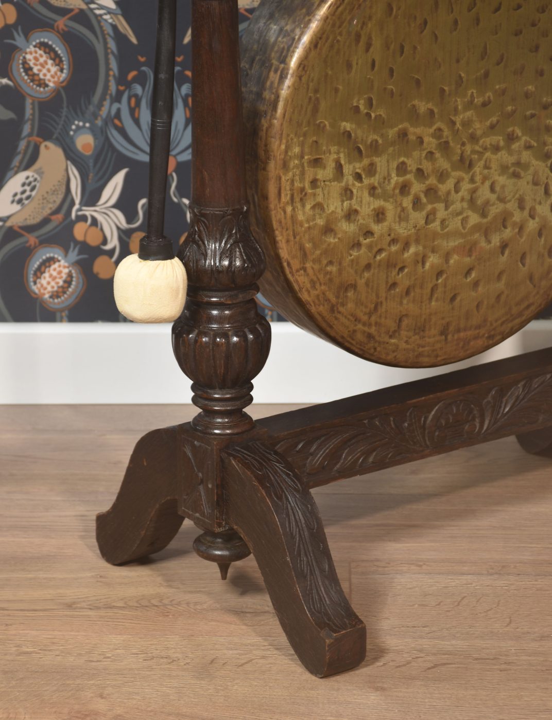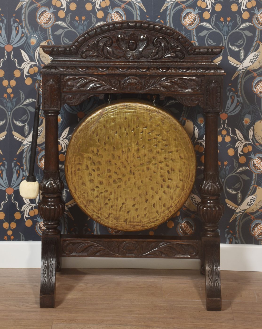 19th Century oak dinner gong and beater. the shaped top with carved decoration above turned supports. Having suspended brass gong to centre. All raised on splayed legs.