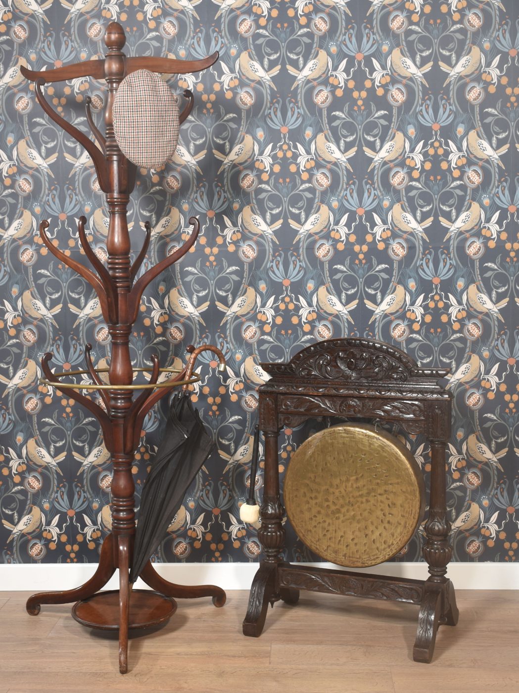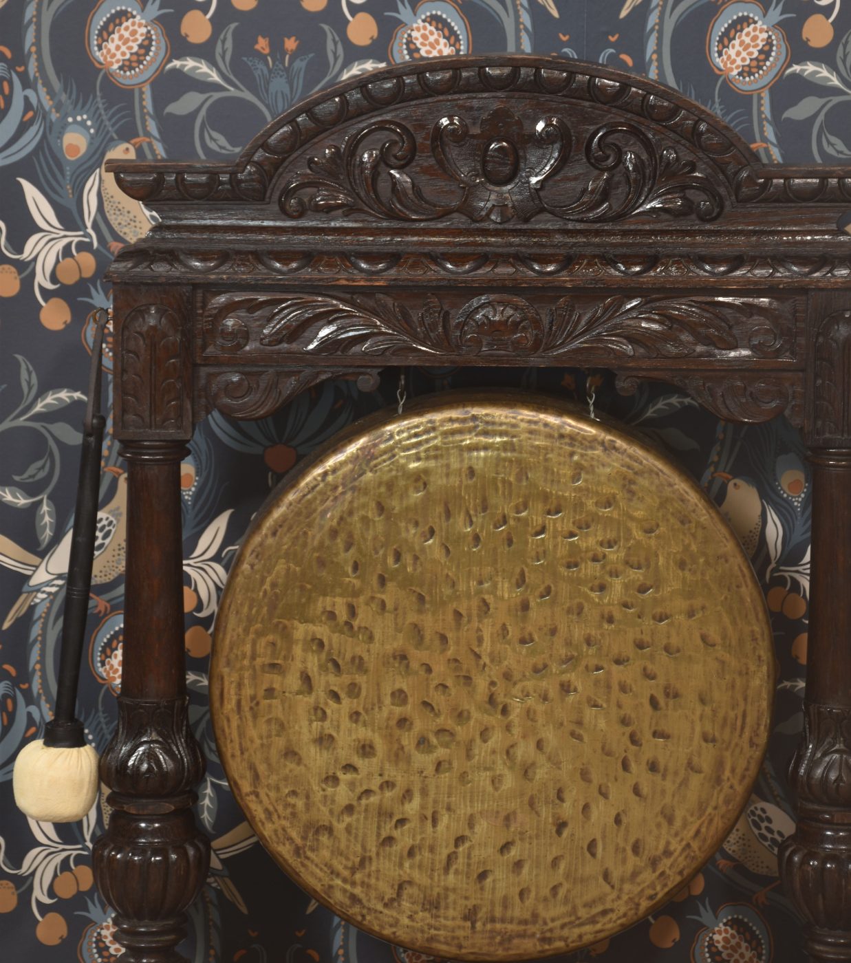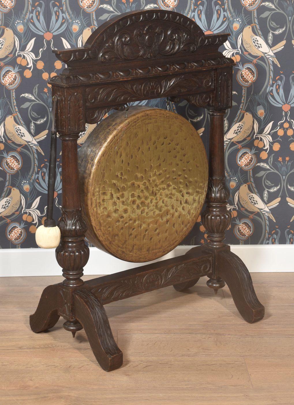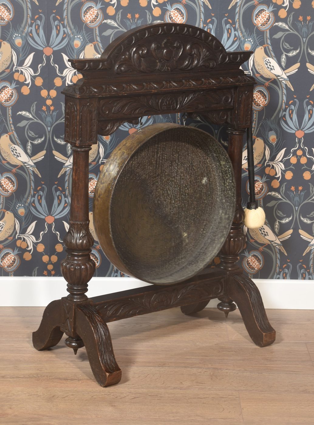 19th Century oak dinner gong and beater. the shaped top with carved decoration above turned supports. Having suspended brass gong to centre. All raised on splayed legs.