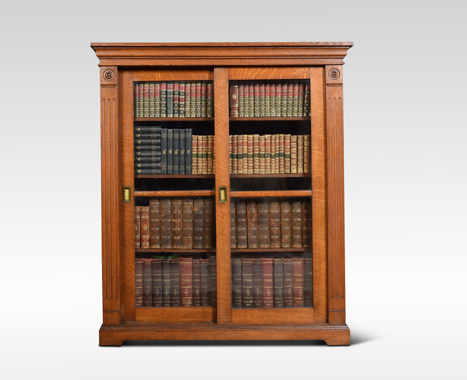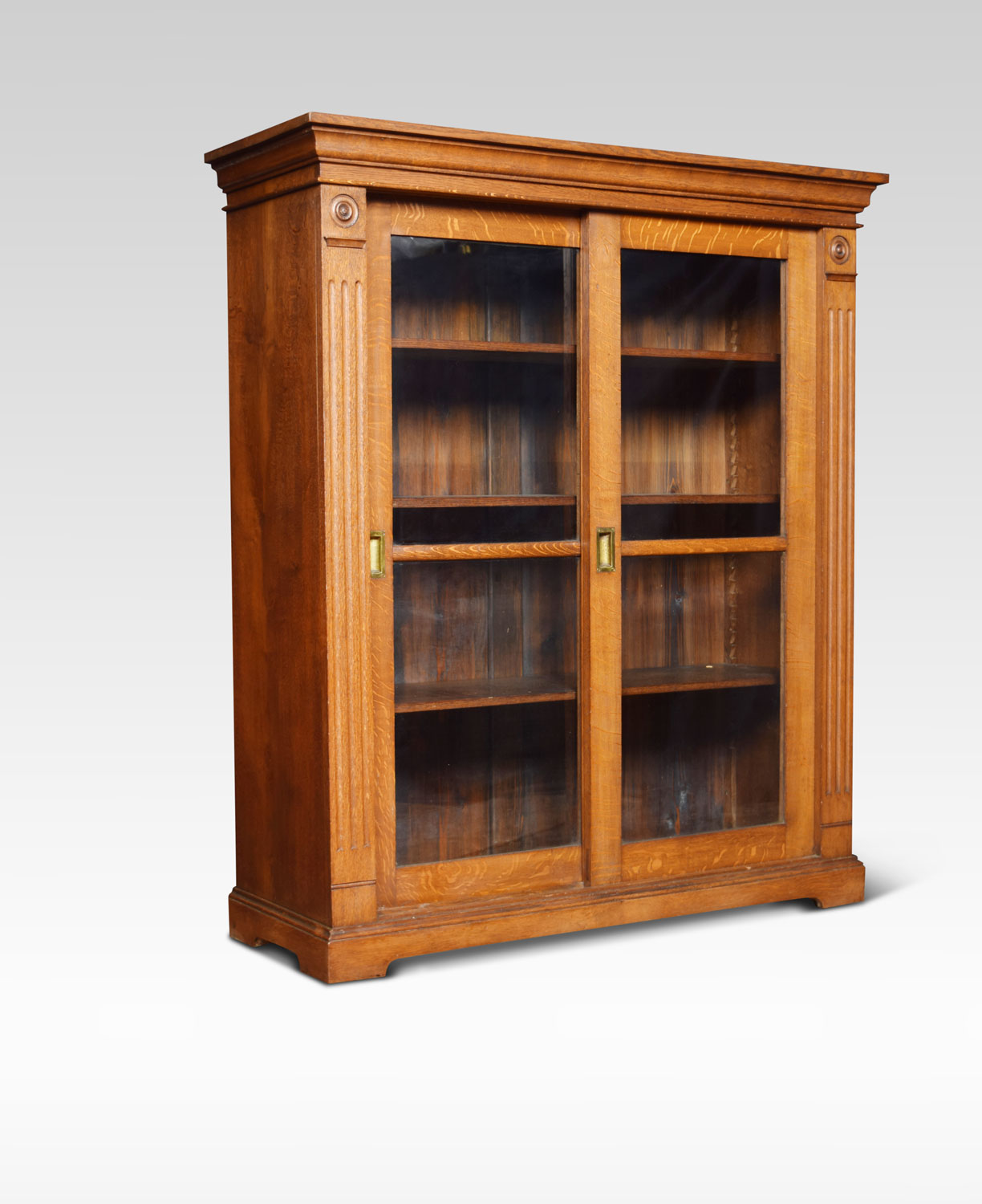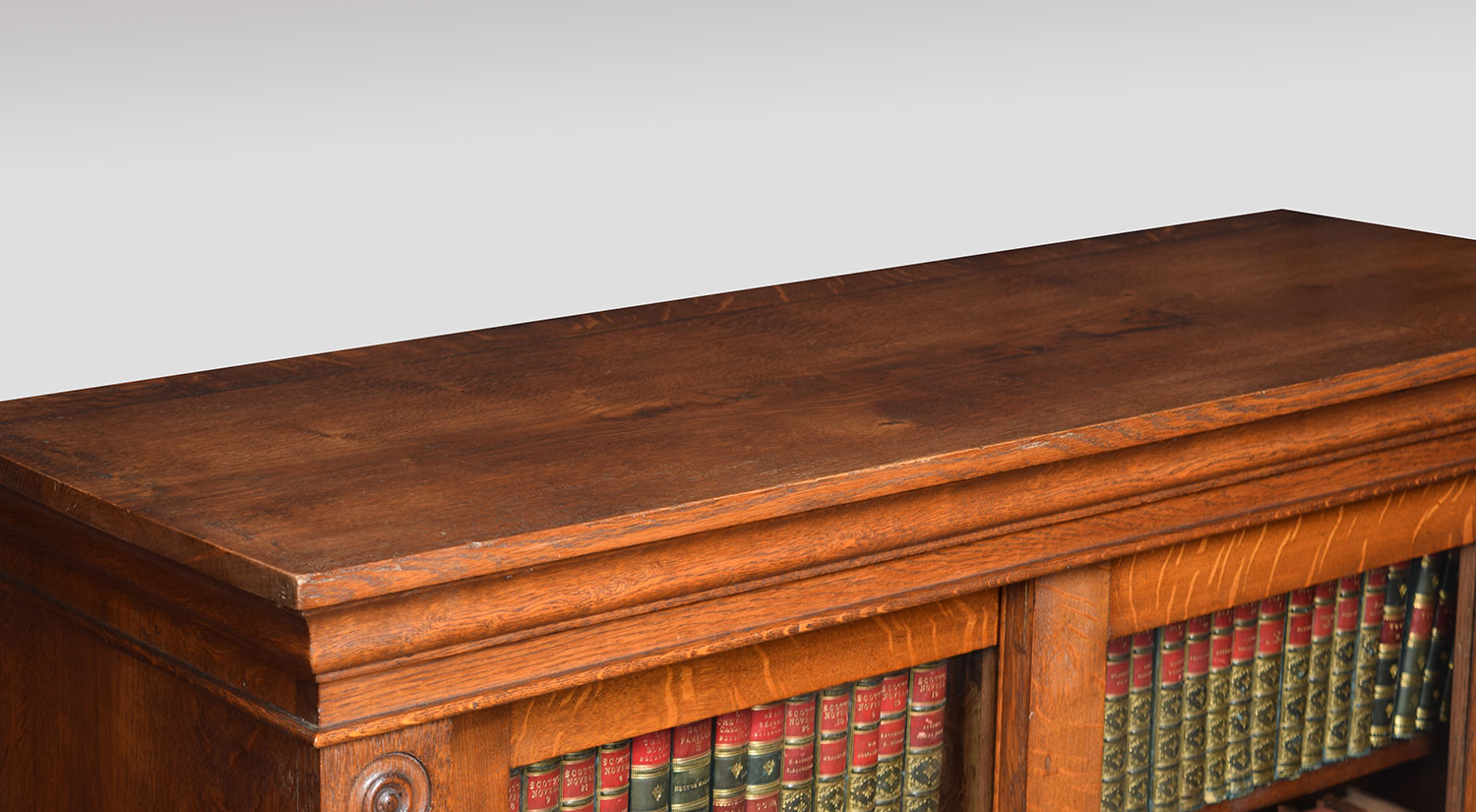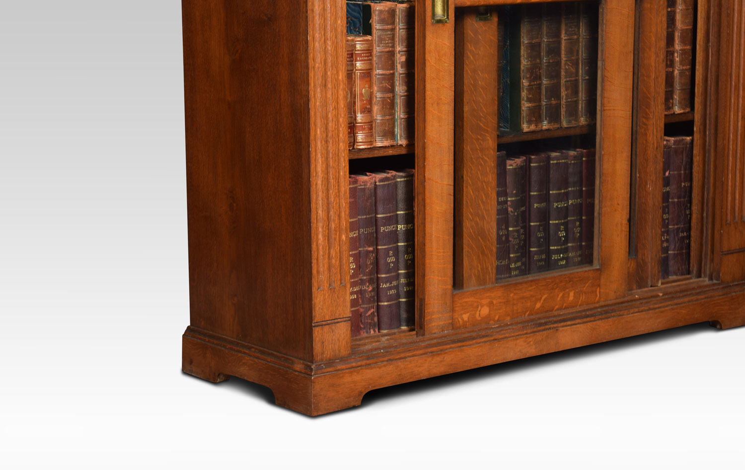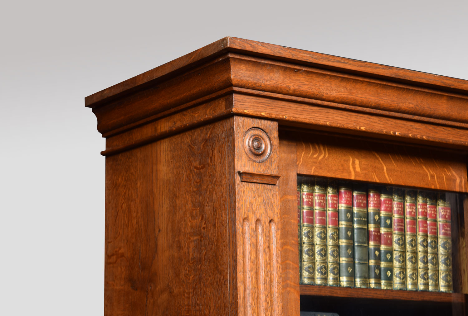 19th century oak bookcase, the large rectangular moulded top above a pair of unusual glazed doors enclosing three adjustable shelves. all raised up on shaped plinth base