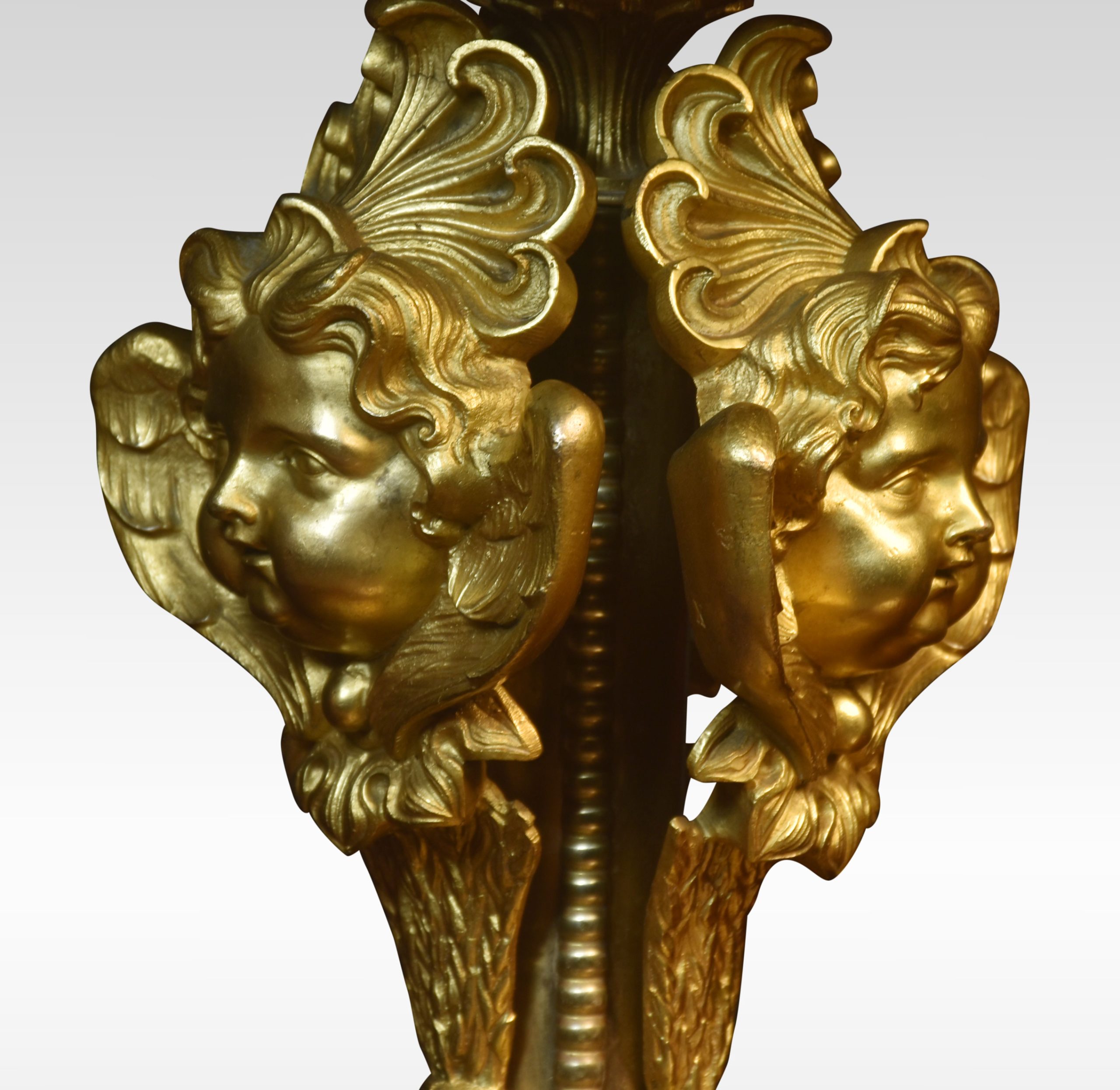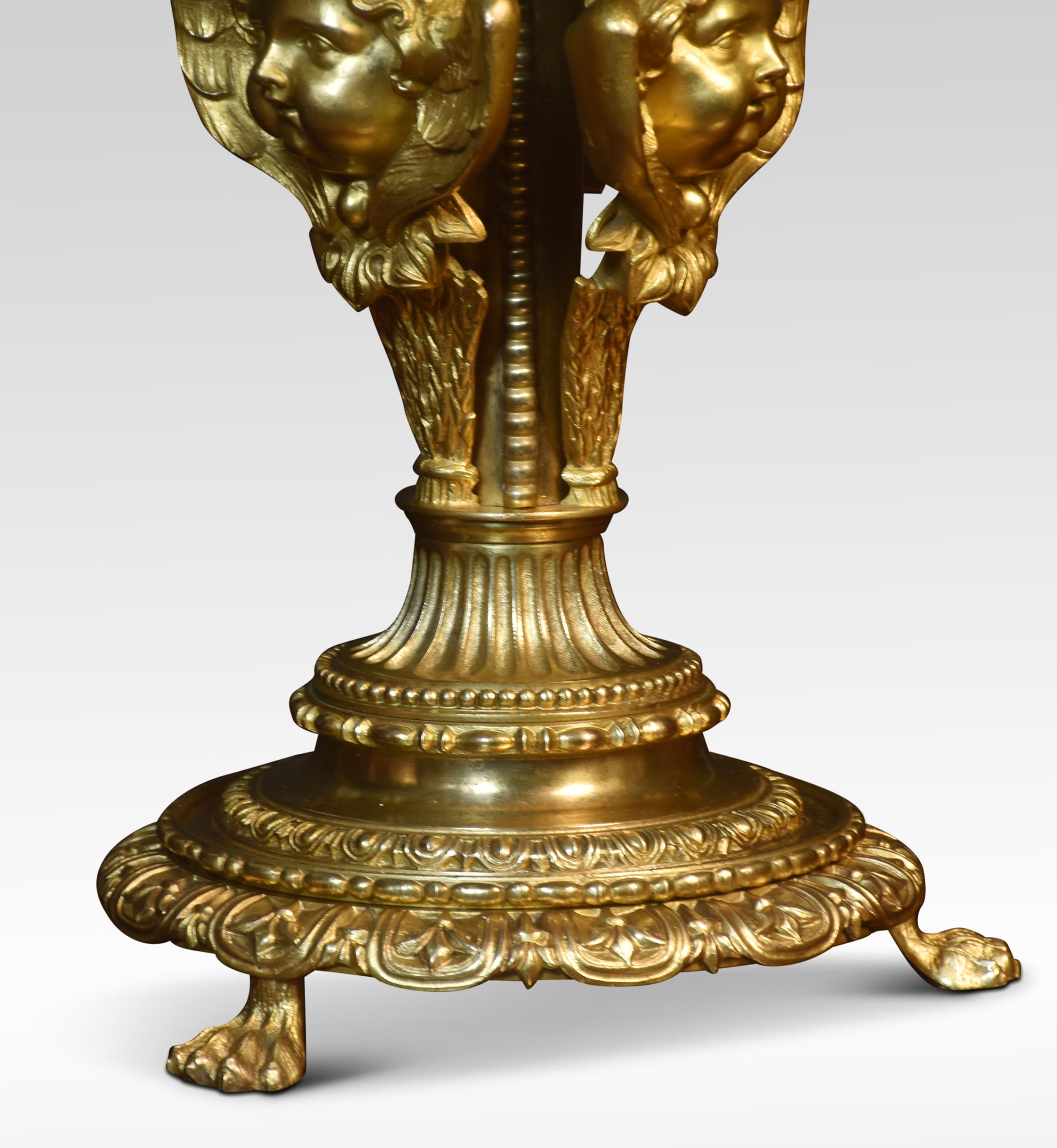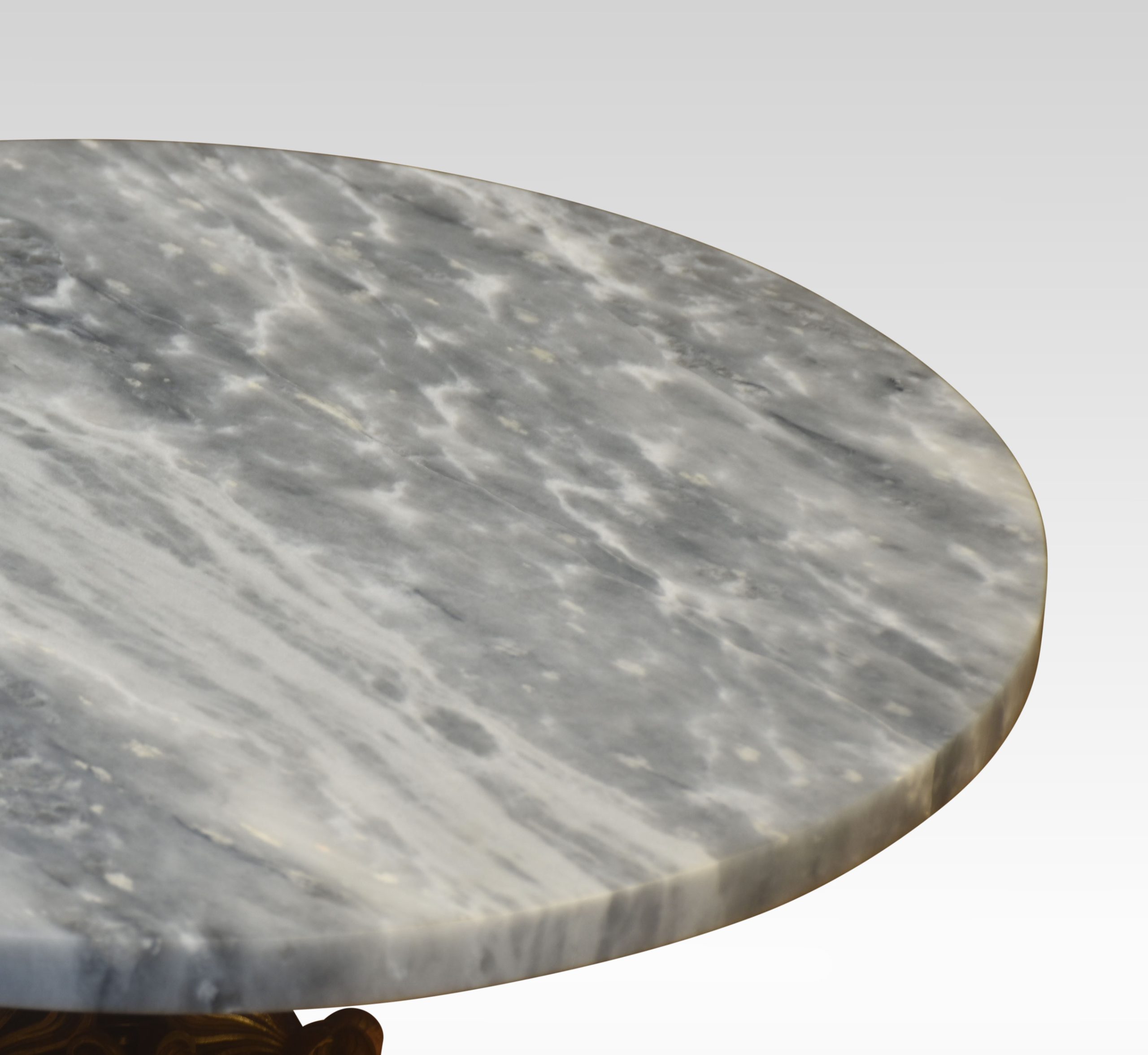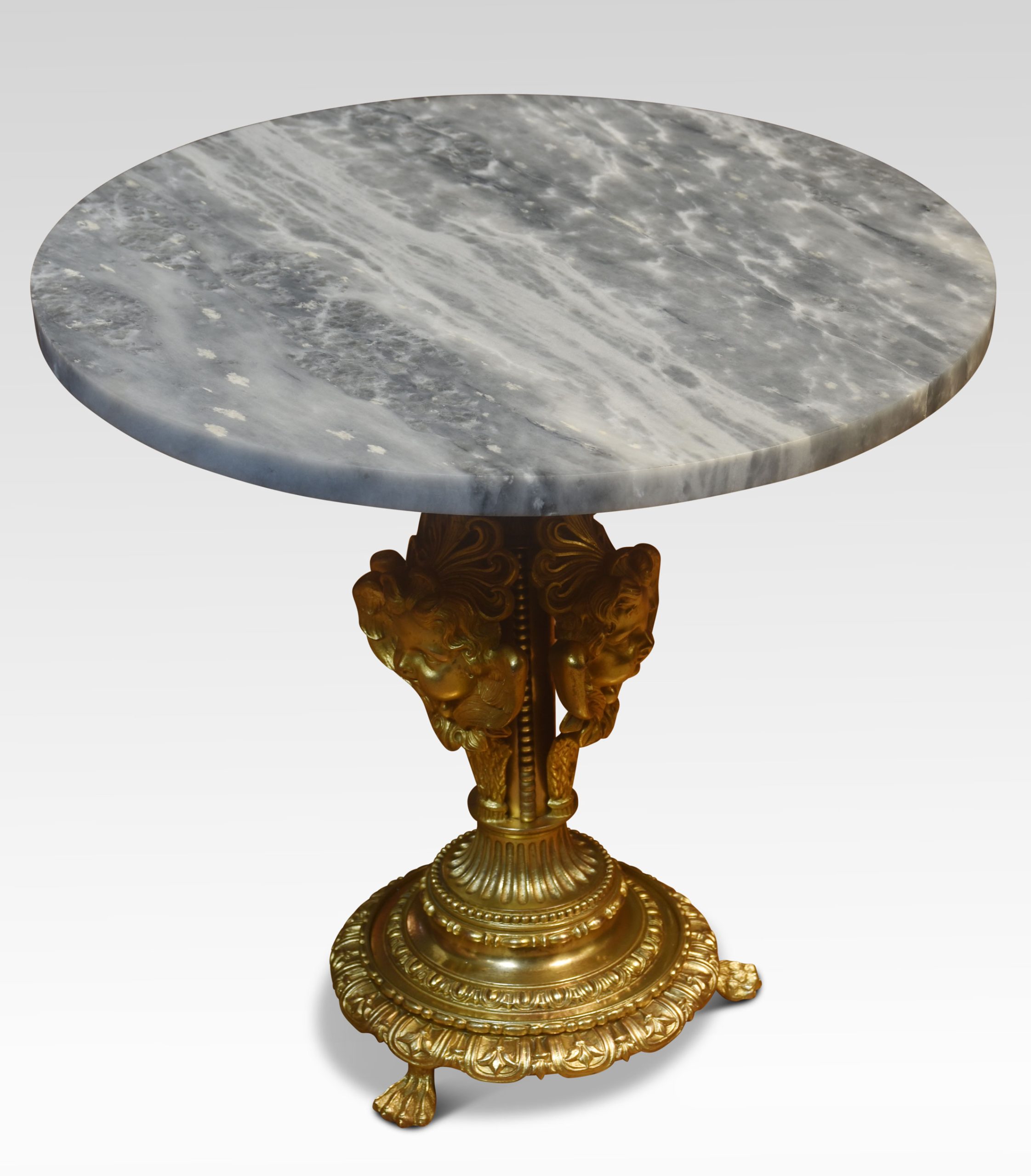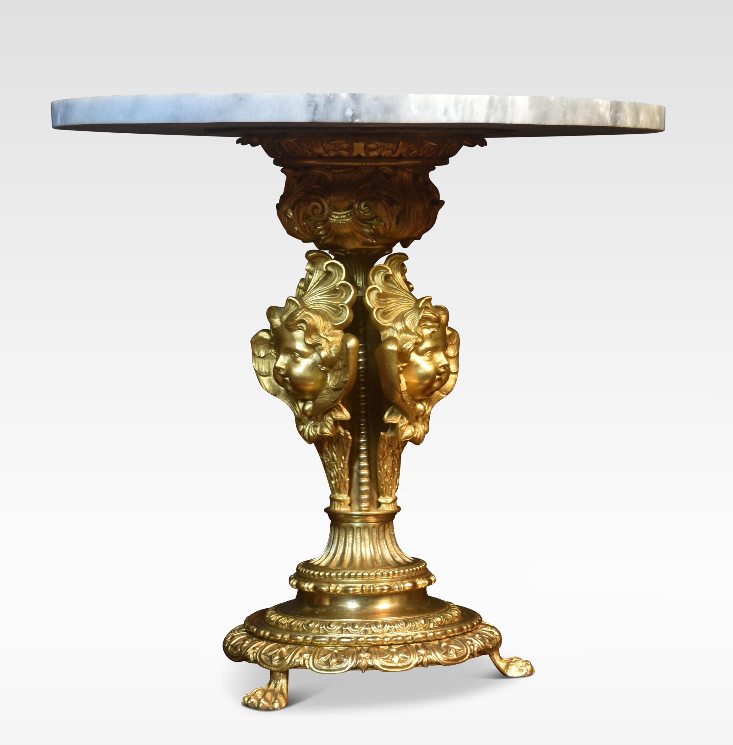 Late 19th century side table, the circular marble top raised on ornate cherub brass stand. All raised on three paw feet.