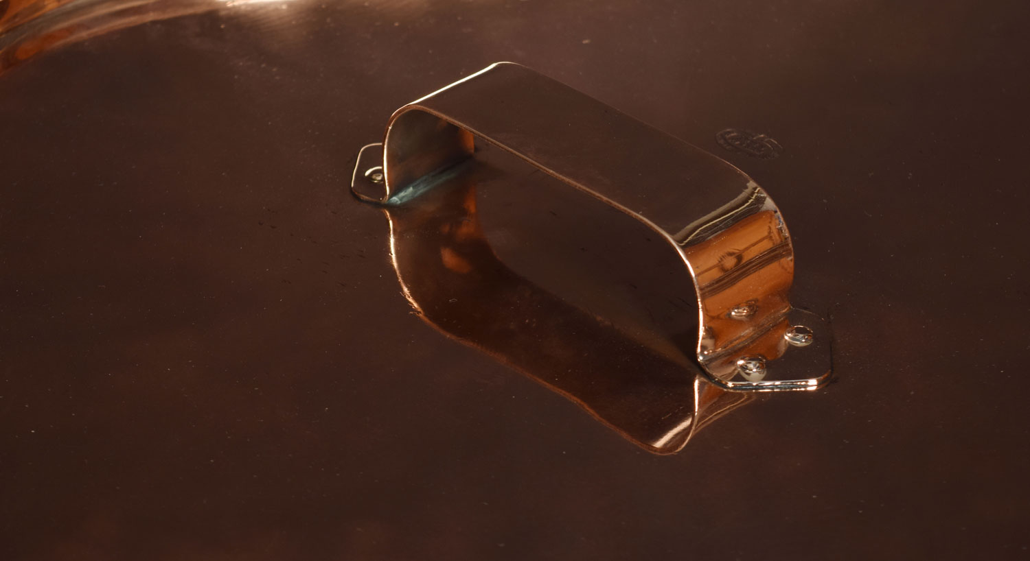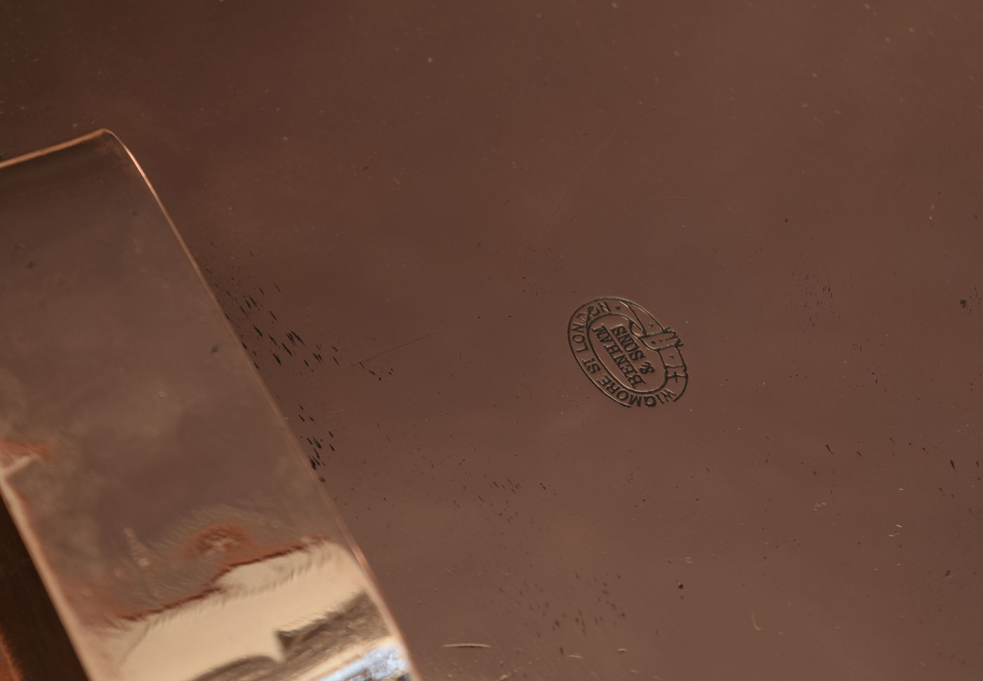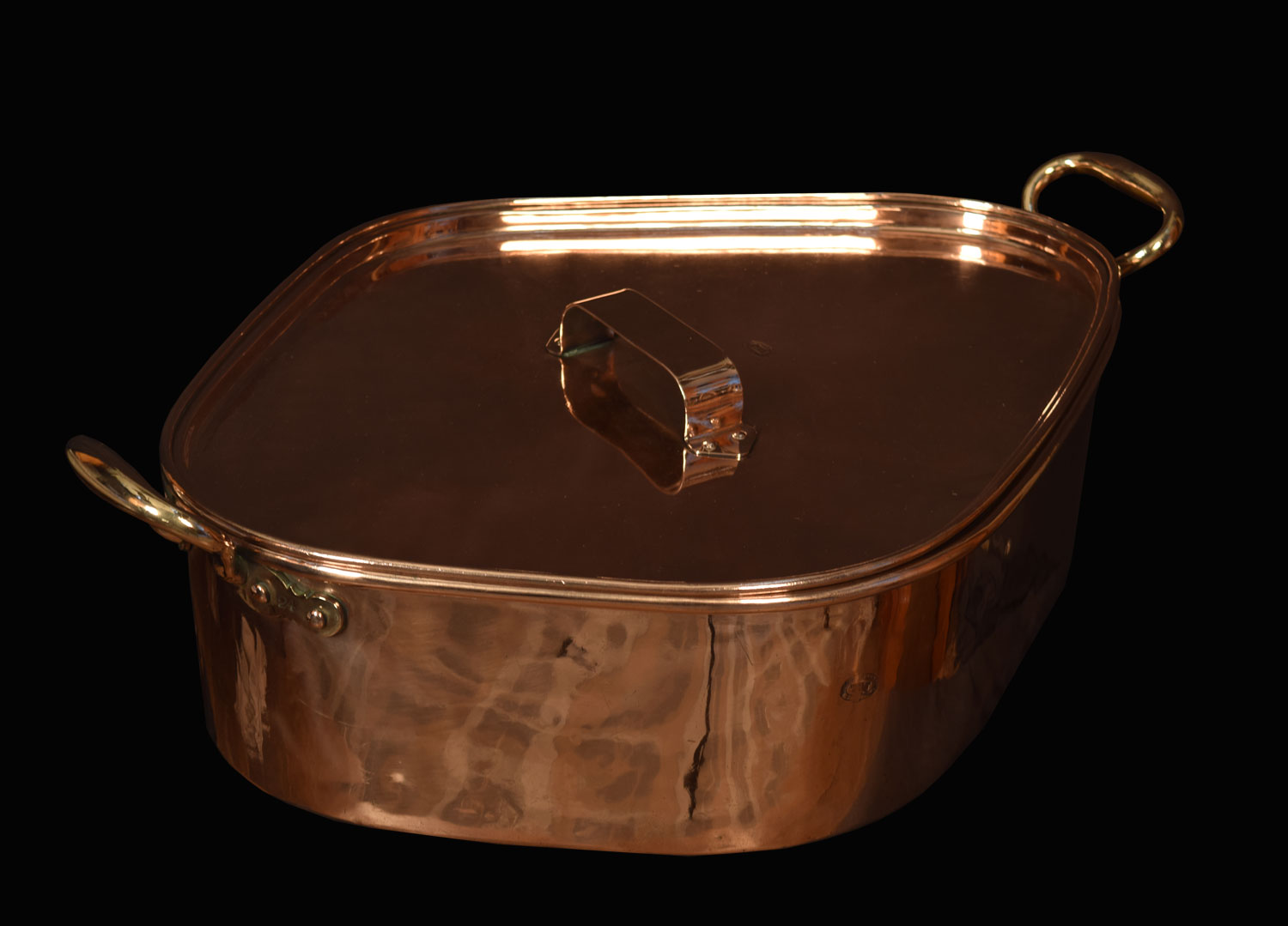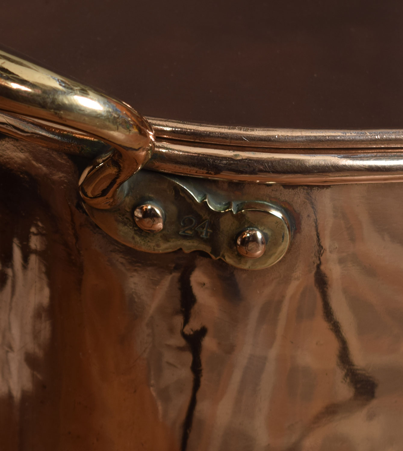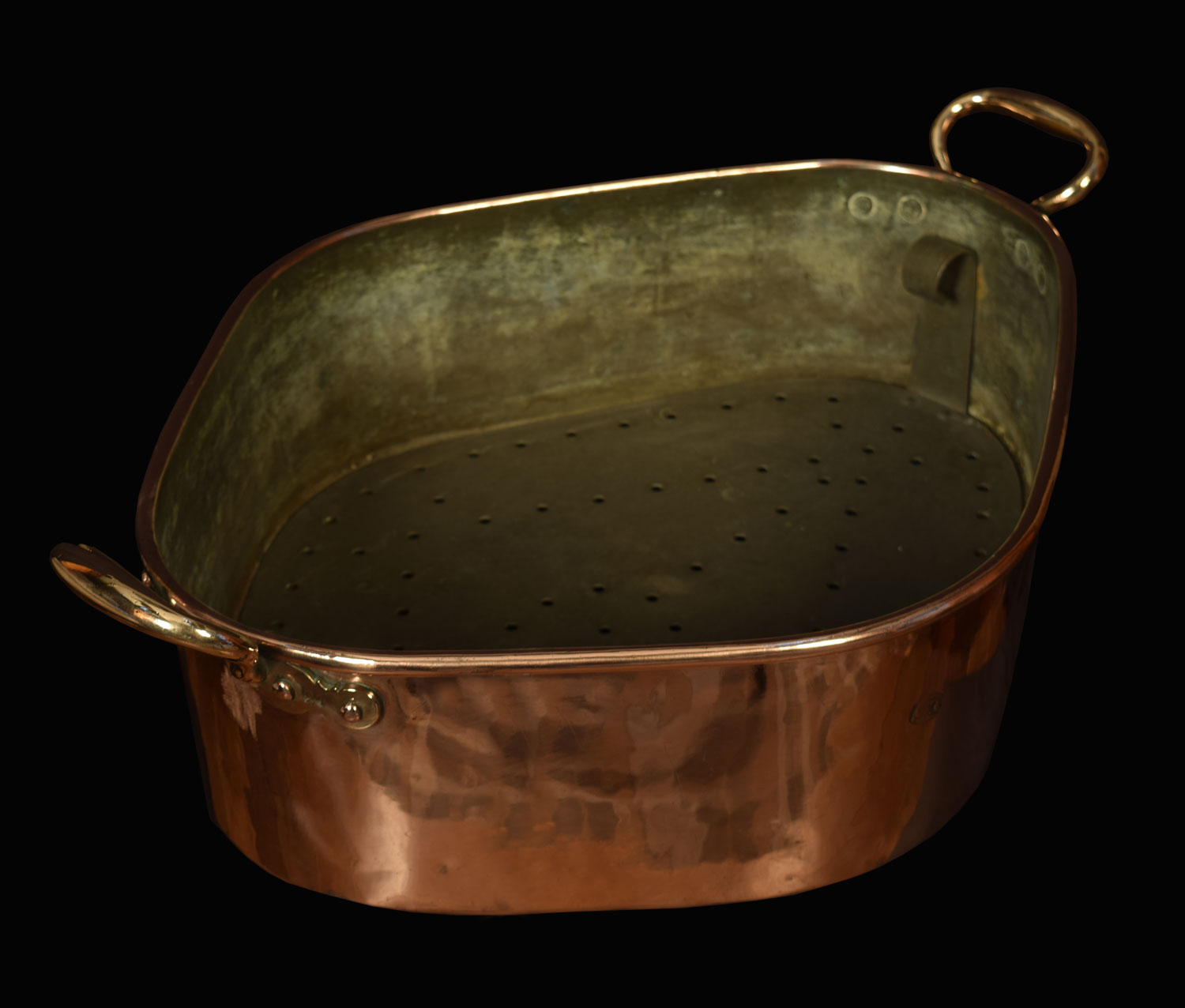 This one of a kind English turbotiere made from a substantial gauge of copper features its original lifting rack, thick rolled rim, very heavy detailed brass handles-each held with four large copper rivets and the number “24” impressed onto both handles-and an extra wide copper strap handle to the lid. Both the kettle and lid are stamped with the Benham and Sons belt buckle maker’s mark.