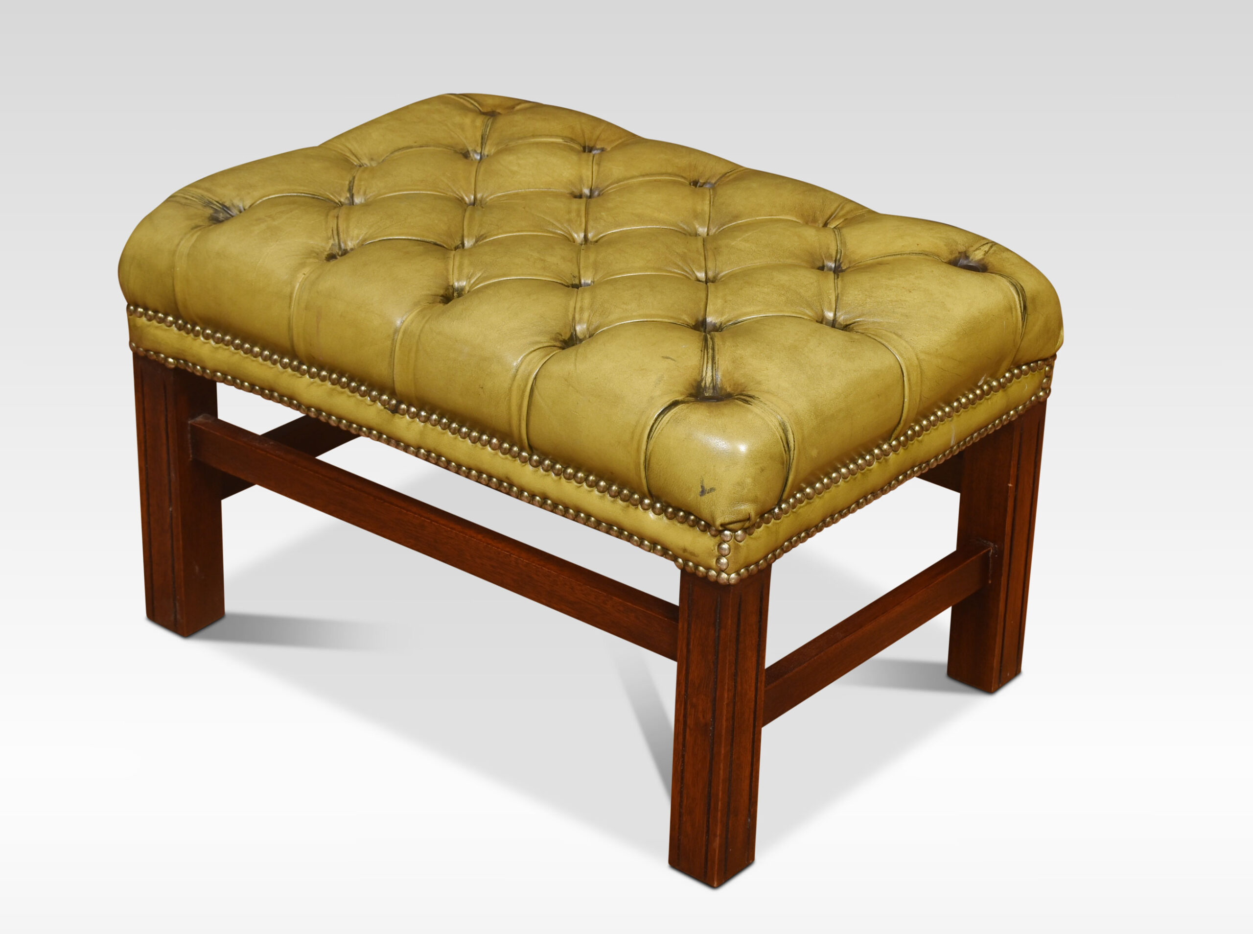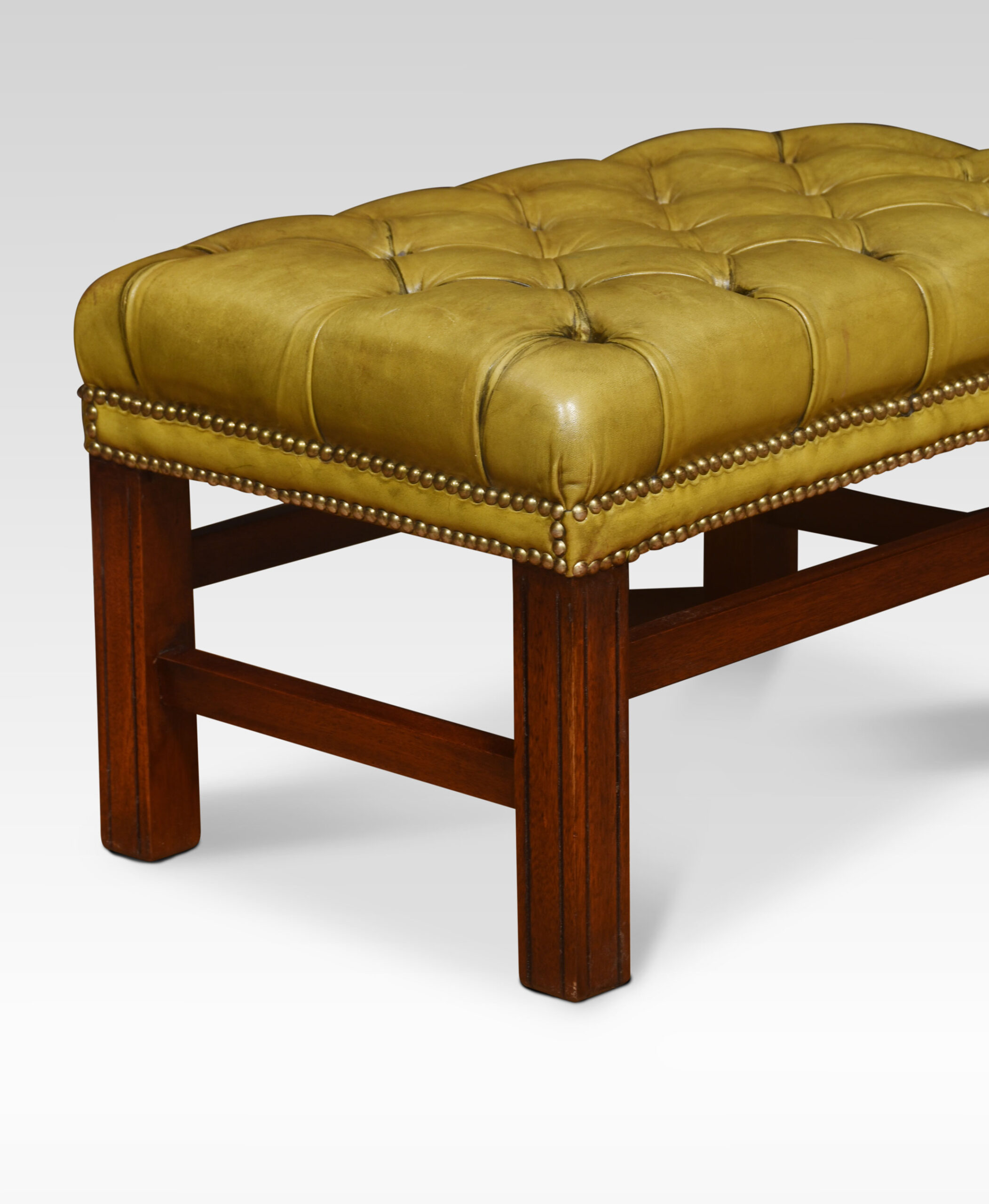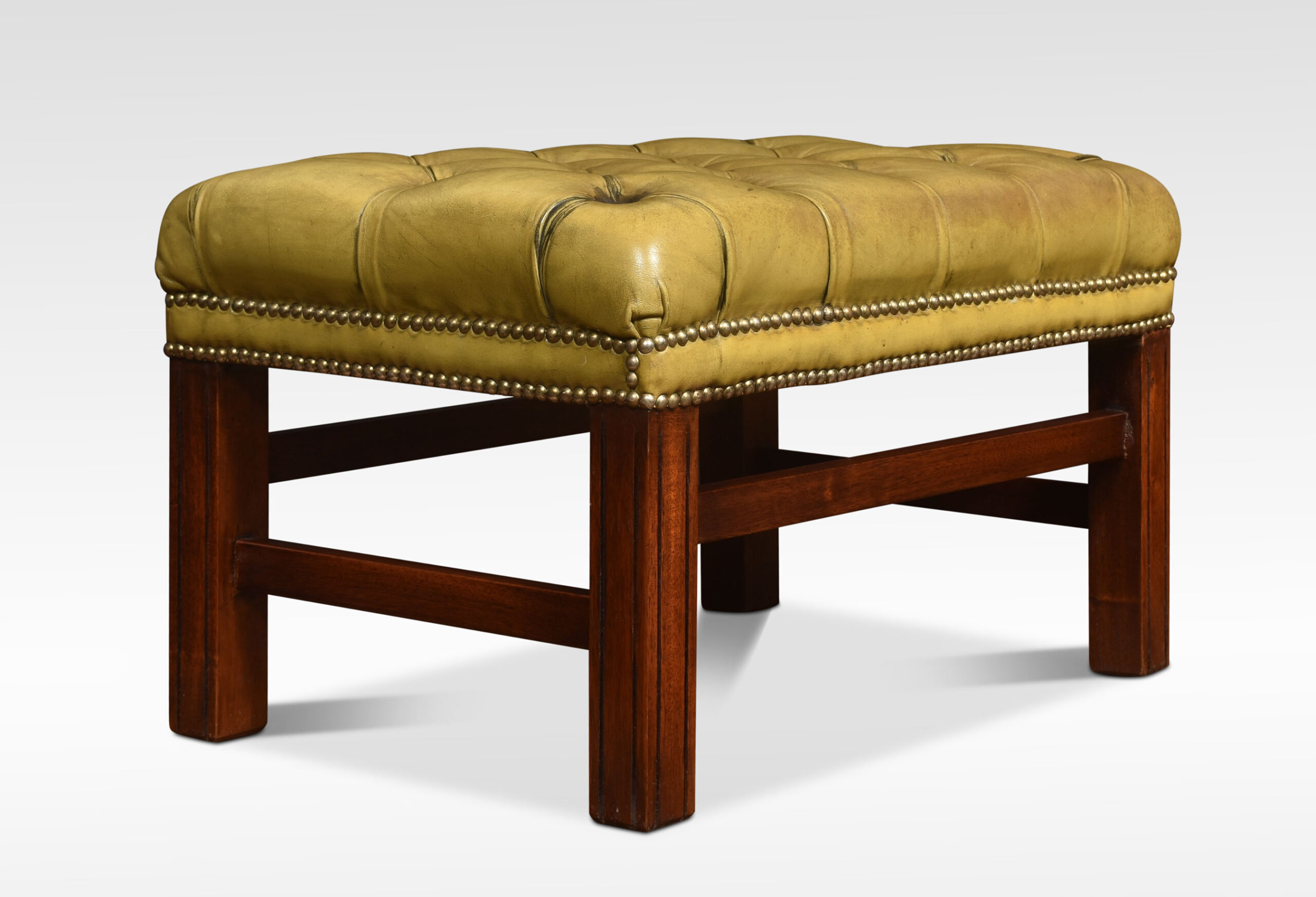 Leather stool, the rectangular green leather deep buttoned seat, raised up on four mhogany square supports untied by stretchers.
