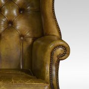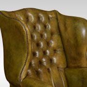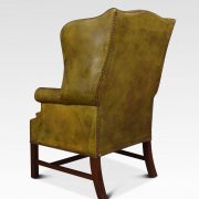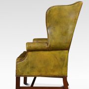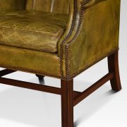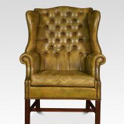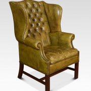 Mahogany framed wing armchair of generous proportions, the arched top above deep buttoned back, upholstered arms and seat in green leather, raised up on square supports united by a stretcher.