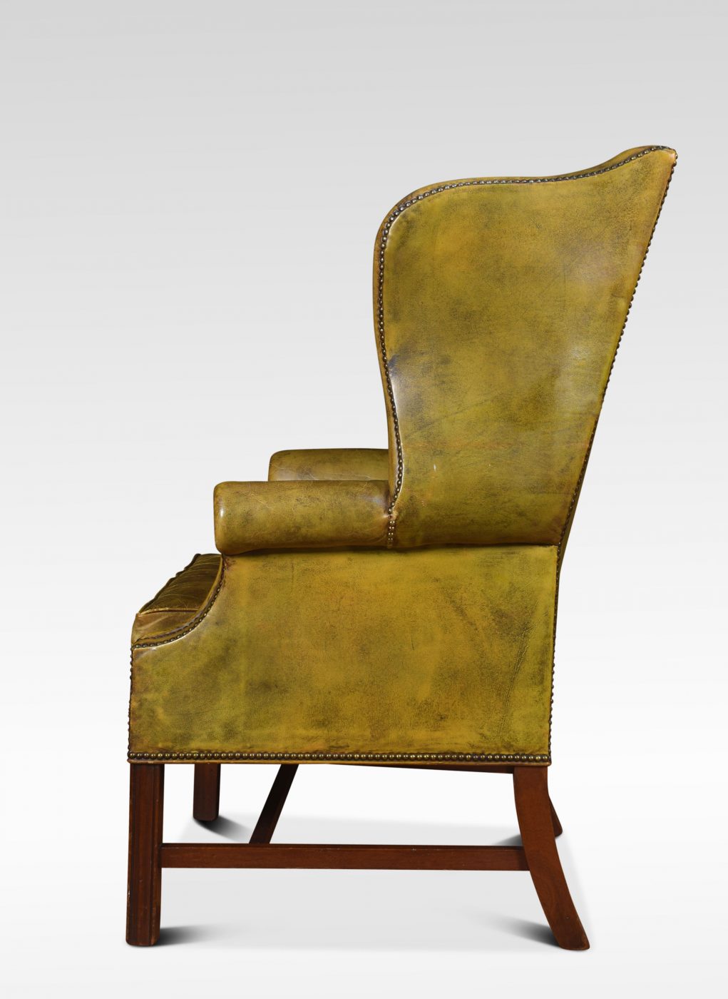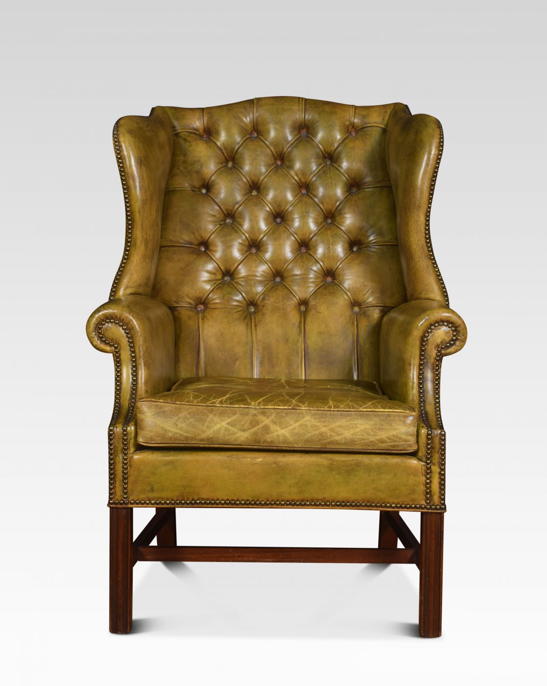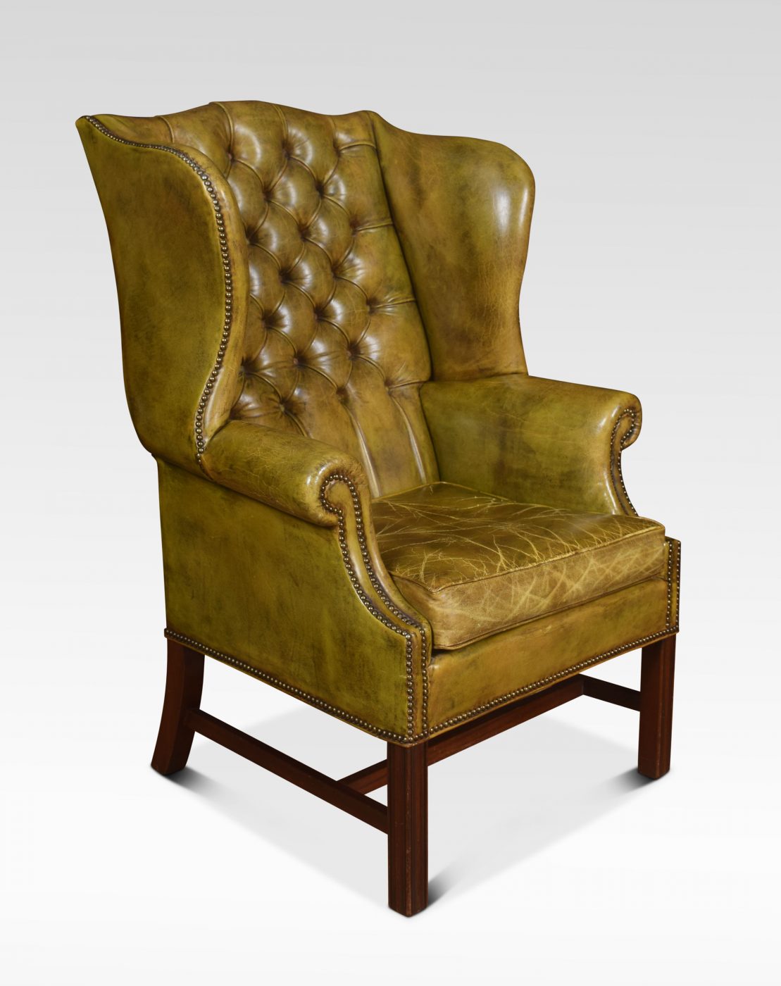 Mahogany framed wing armchair of generous proportions, the arched top above deep buttoned back, upholstered arms and seat in green leather, raised up on square supports united by a stretcher.