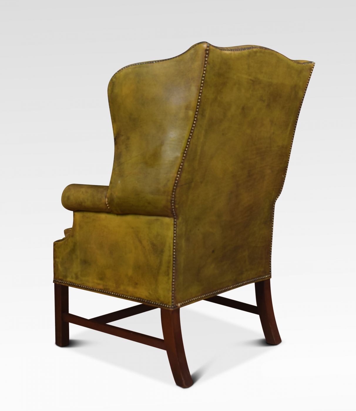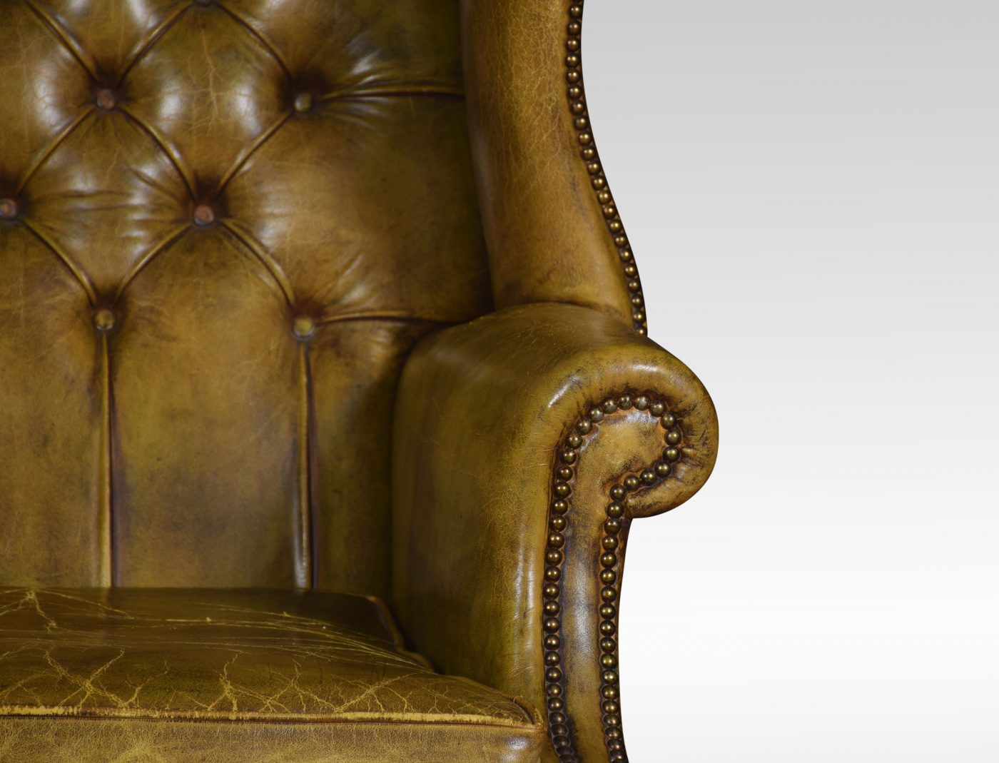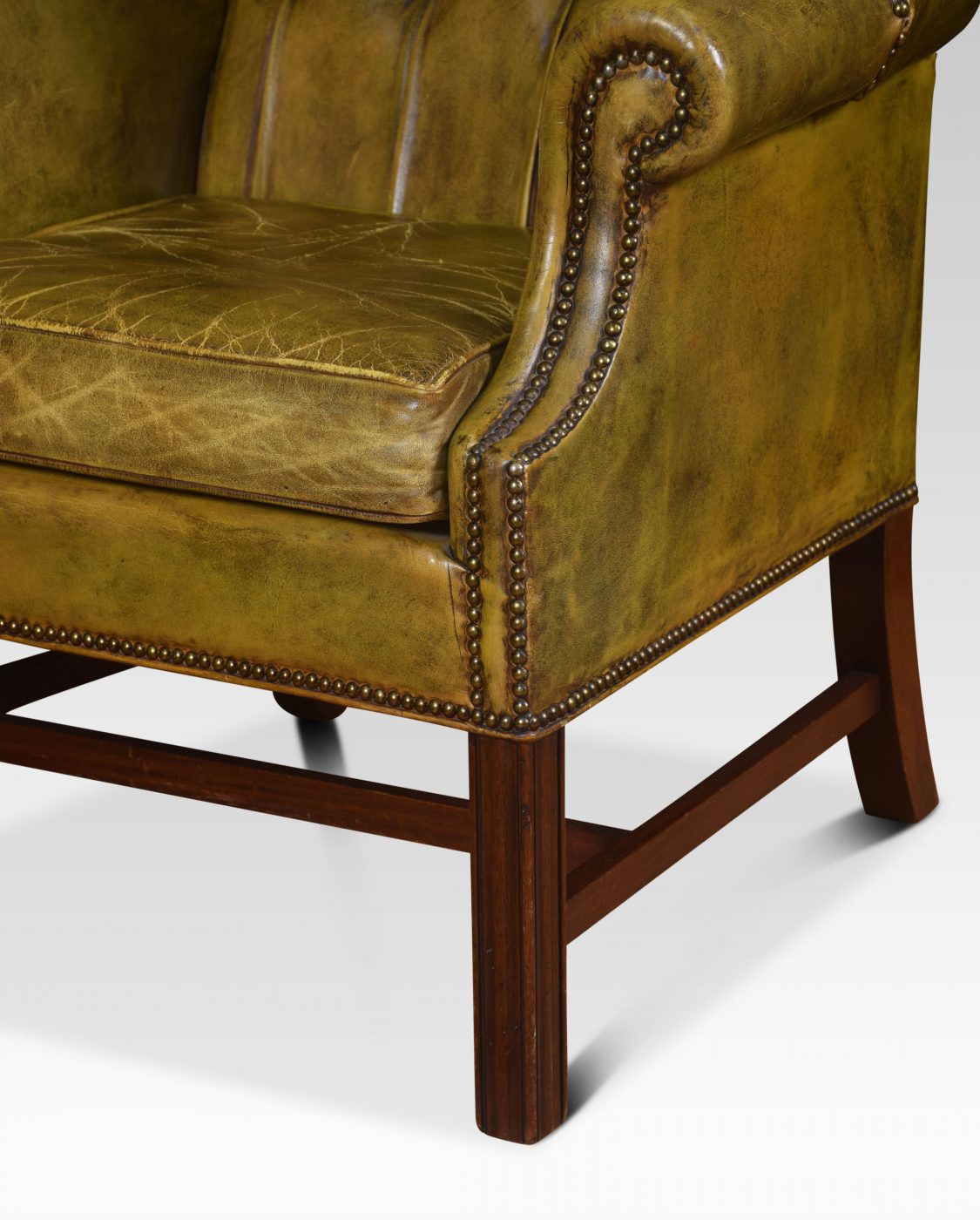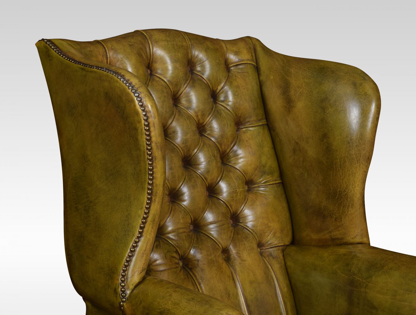 Mahogany framed wing armchair of generous proportions, the arched top above deep buttoned back, upholstered arms and seat in green leather, raised up on square supports united by a stretcher.