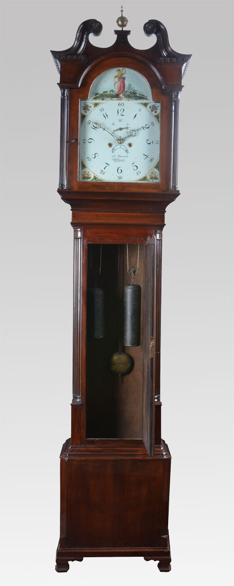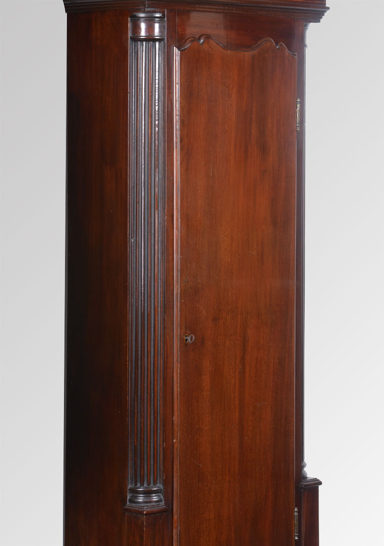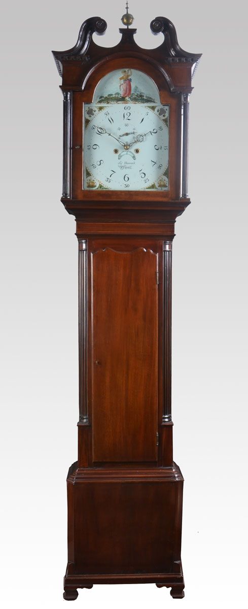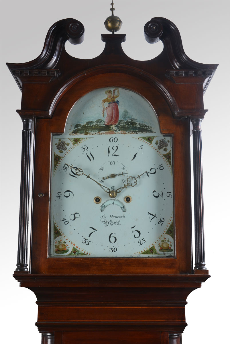 Mahogany case eight-day long case clock, the moulded cornice with central brass finial above a frieze and glazed door flanked by free standing columns, the trunk fitted a long door, the canted base on shaped bracket feet, the painted dial signed S N Hancock Yeovil