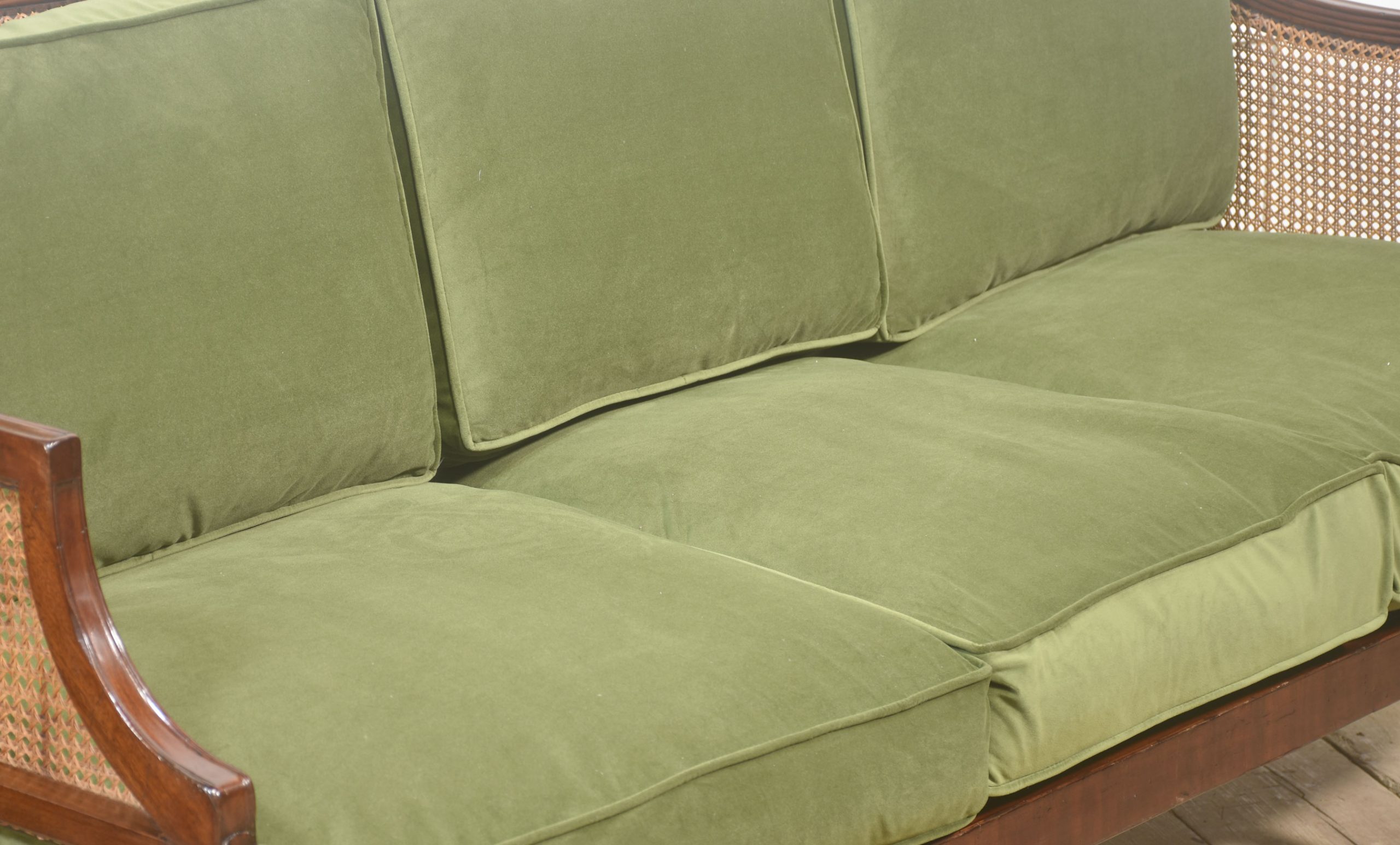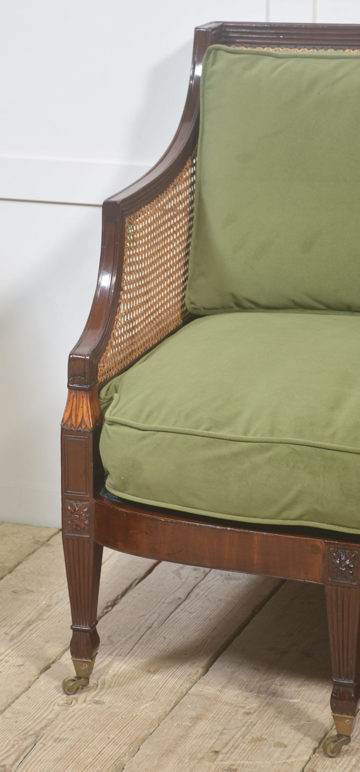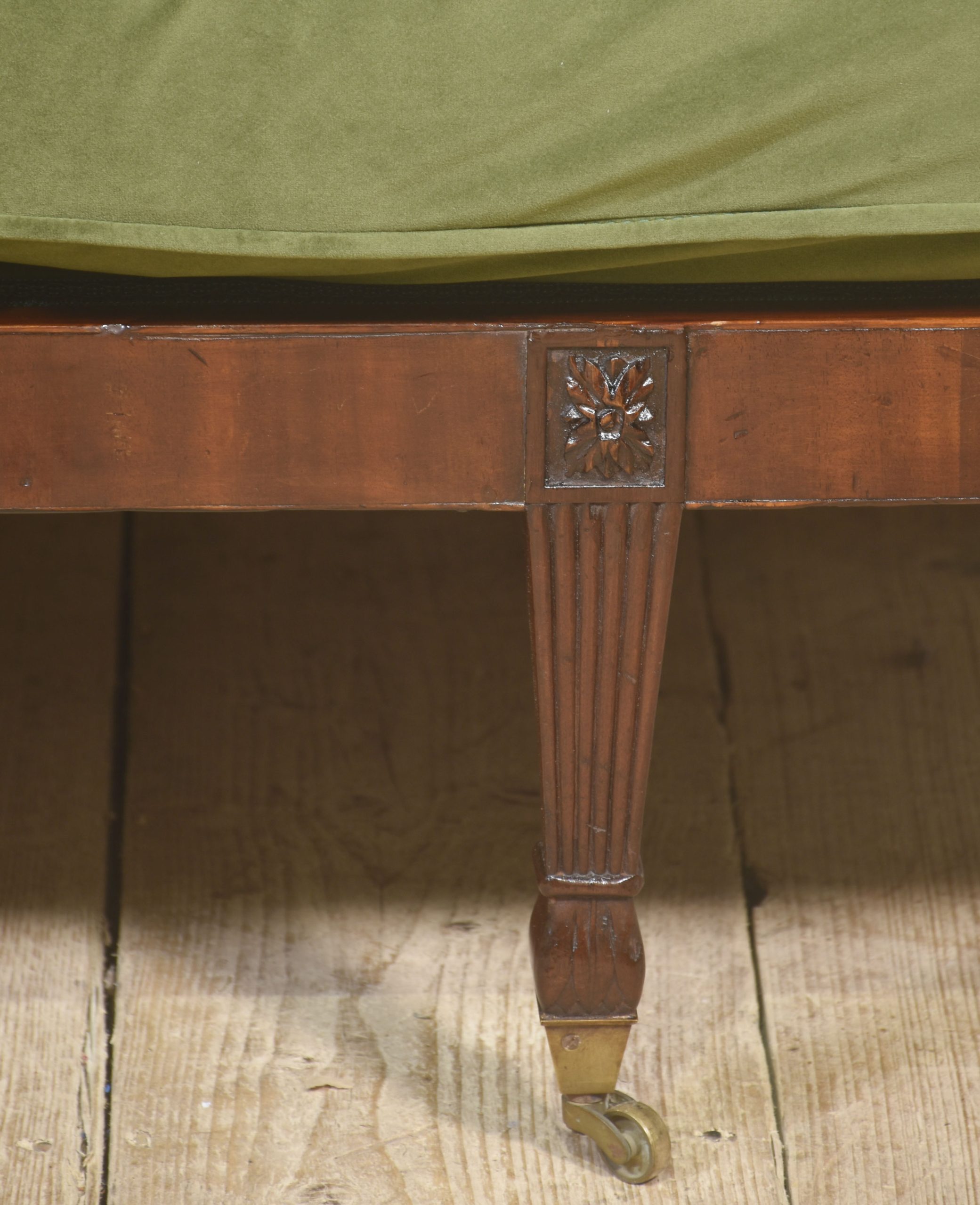 Plush, deep cushions—newly upholstered in a soft olive green fabric—provide exceptional comfort while maintaining a clean, tailored appearance. Carved mahogany details accent the tapering legs and arm supports, and brass castors add both charm and practical mobility.