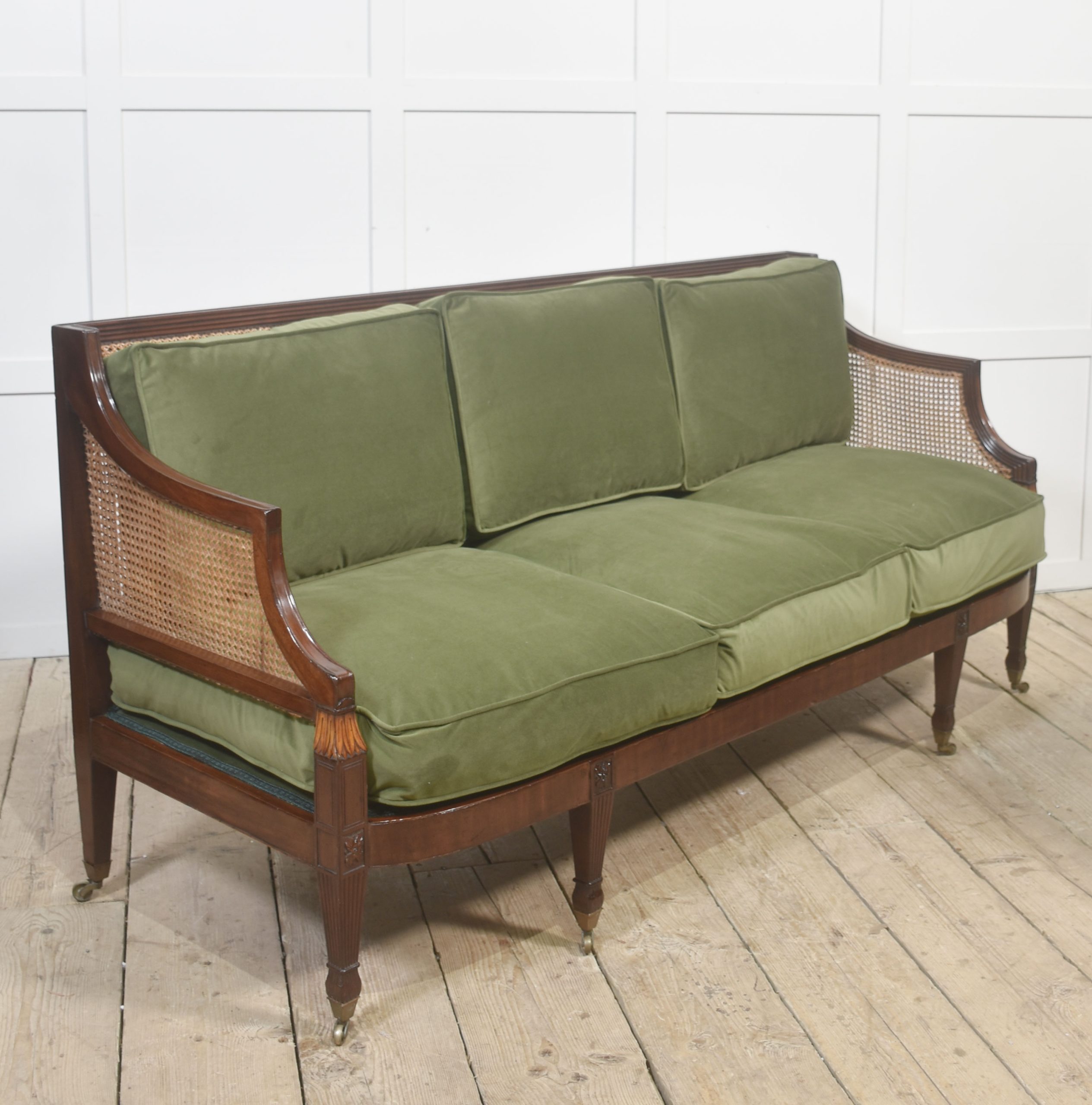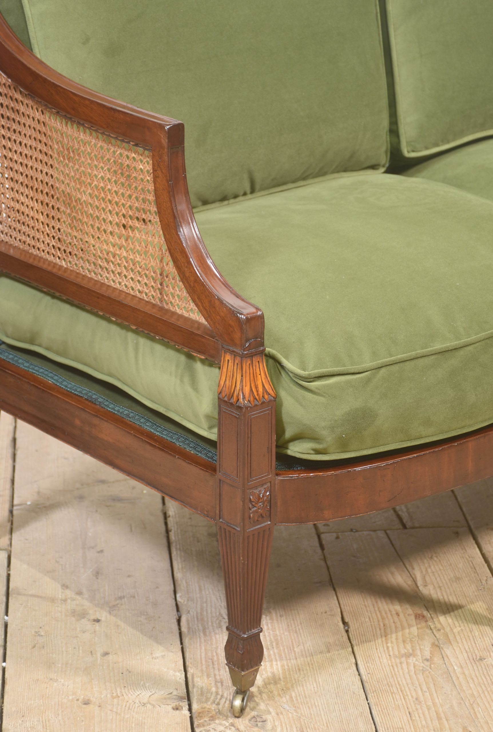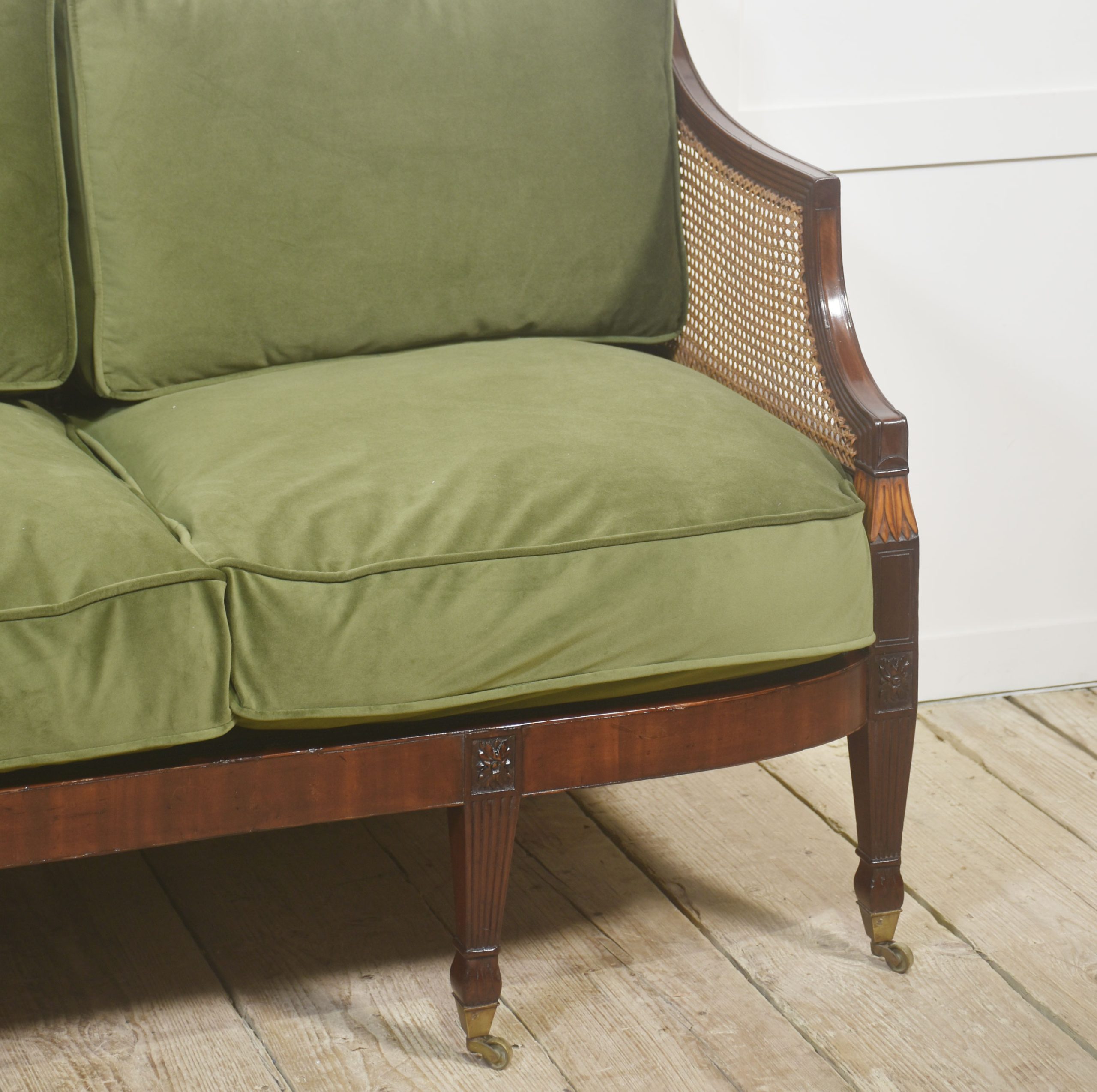 Plush, deep cushions—newly upholstered in a soft olive green fabric—provide exceptional comfort while maintaining a clean, tailored appearance. Carved mahogany details accent the tapering legs and arm supports, and brass castors add both charm and practical mobility.