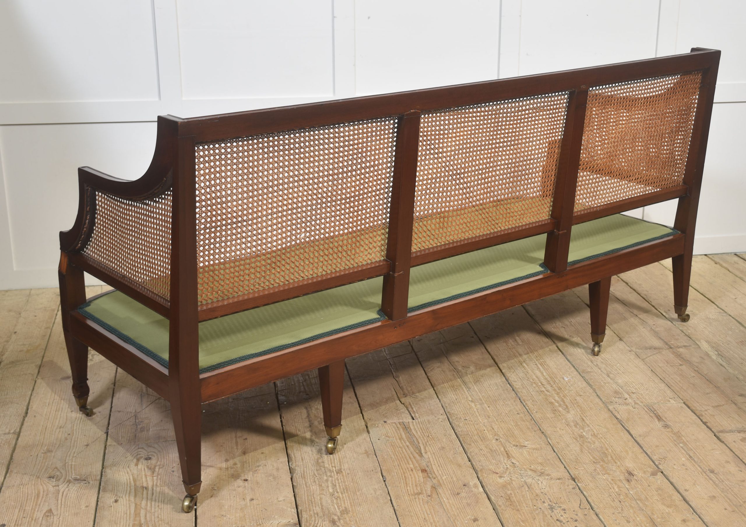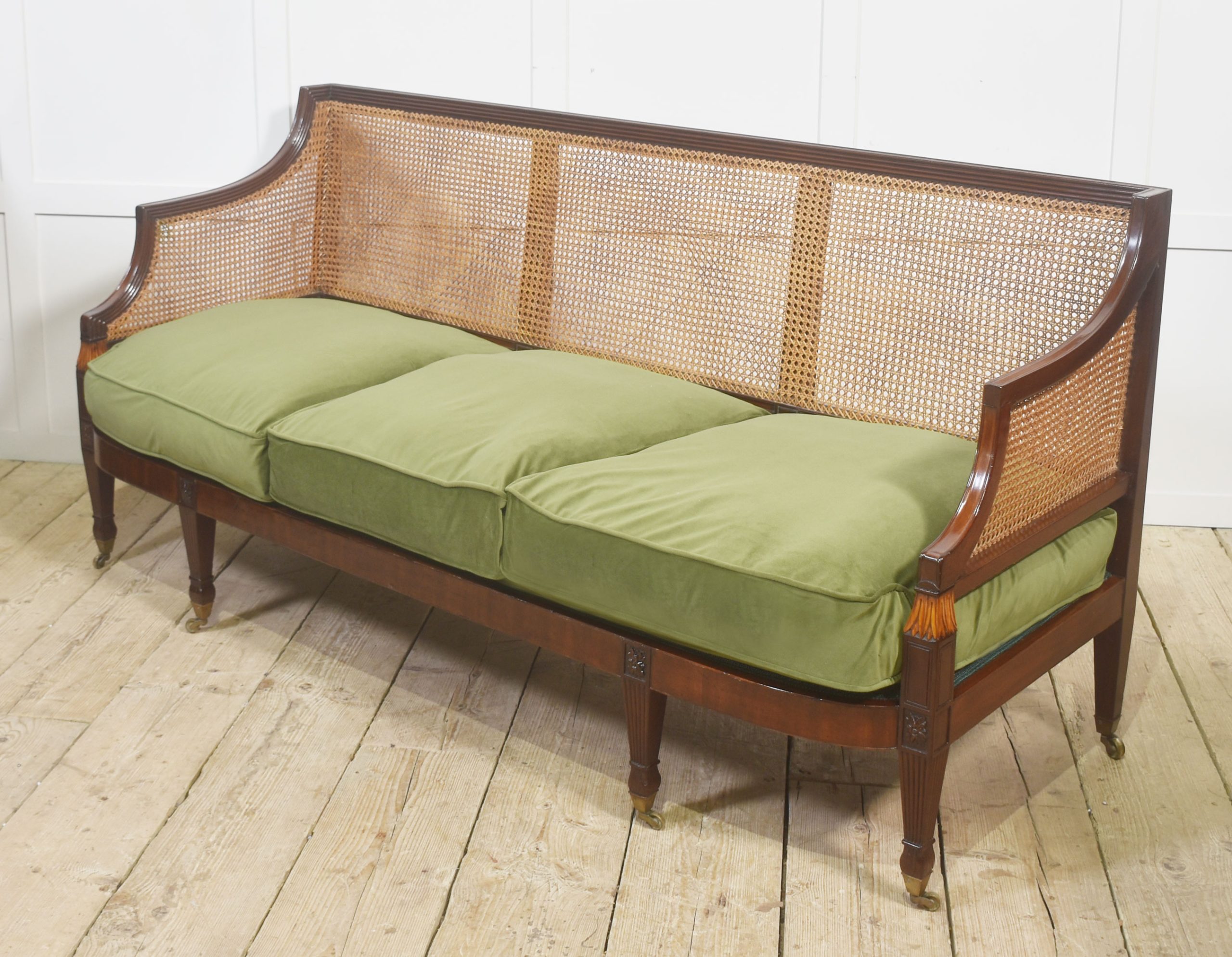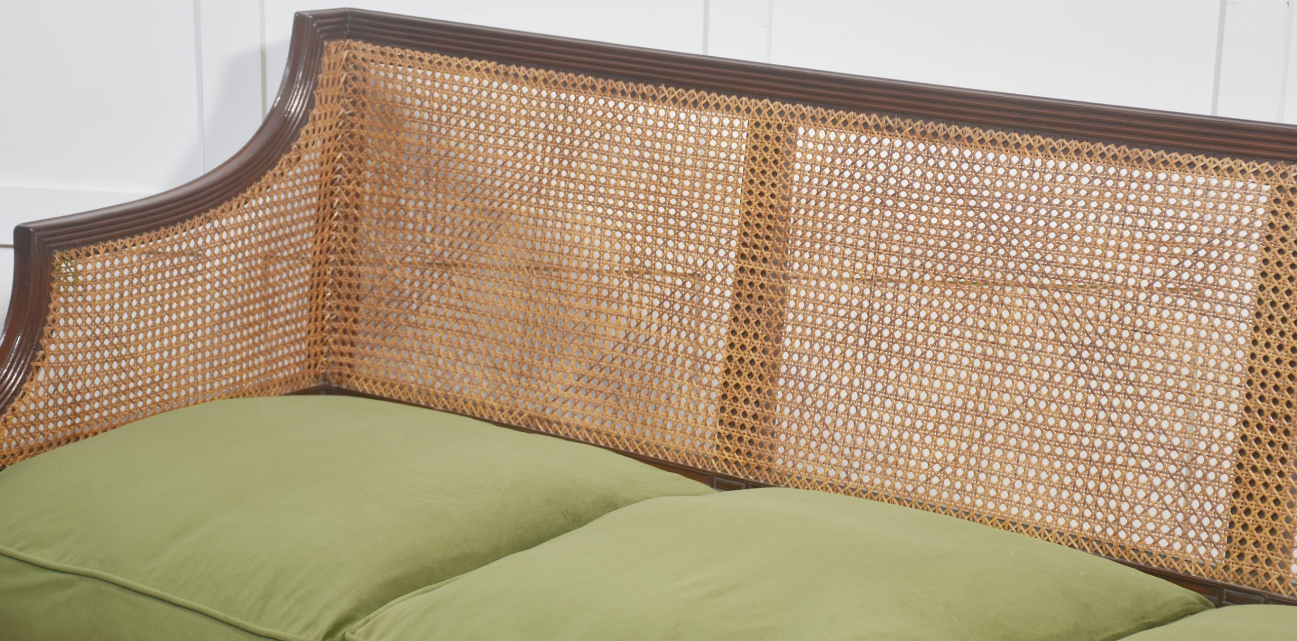 This elegant sofa features a beautifully crafted solid mahogany frame, enriched with a warm, polished finish that highlights its classic lines. Hand-woven cane panels sweep across the back and sides, creating a light, refined silhouette that pairs effortlessly with the richness of the mahogany.