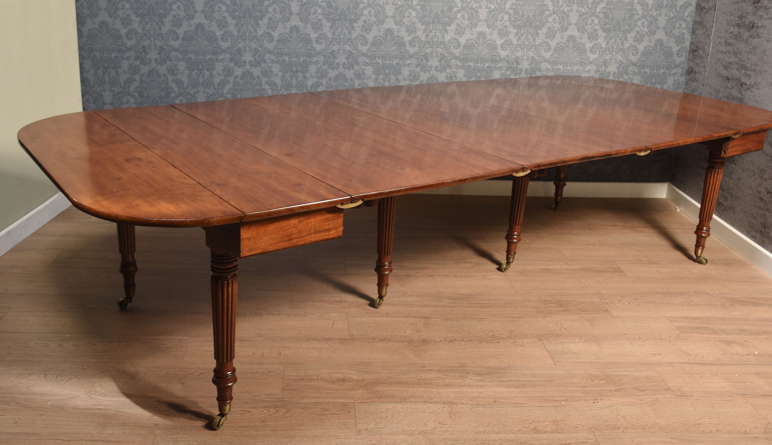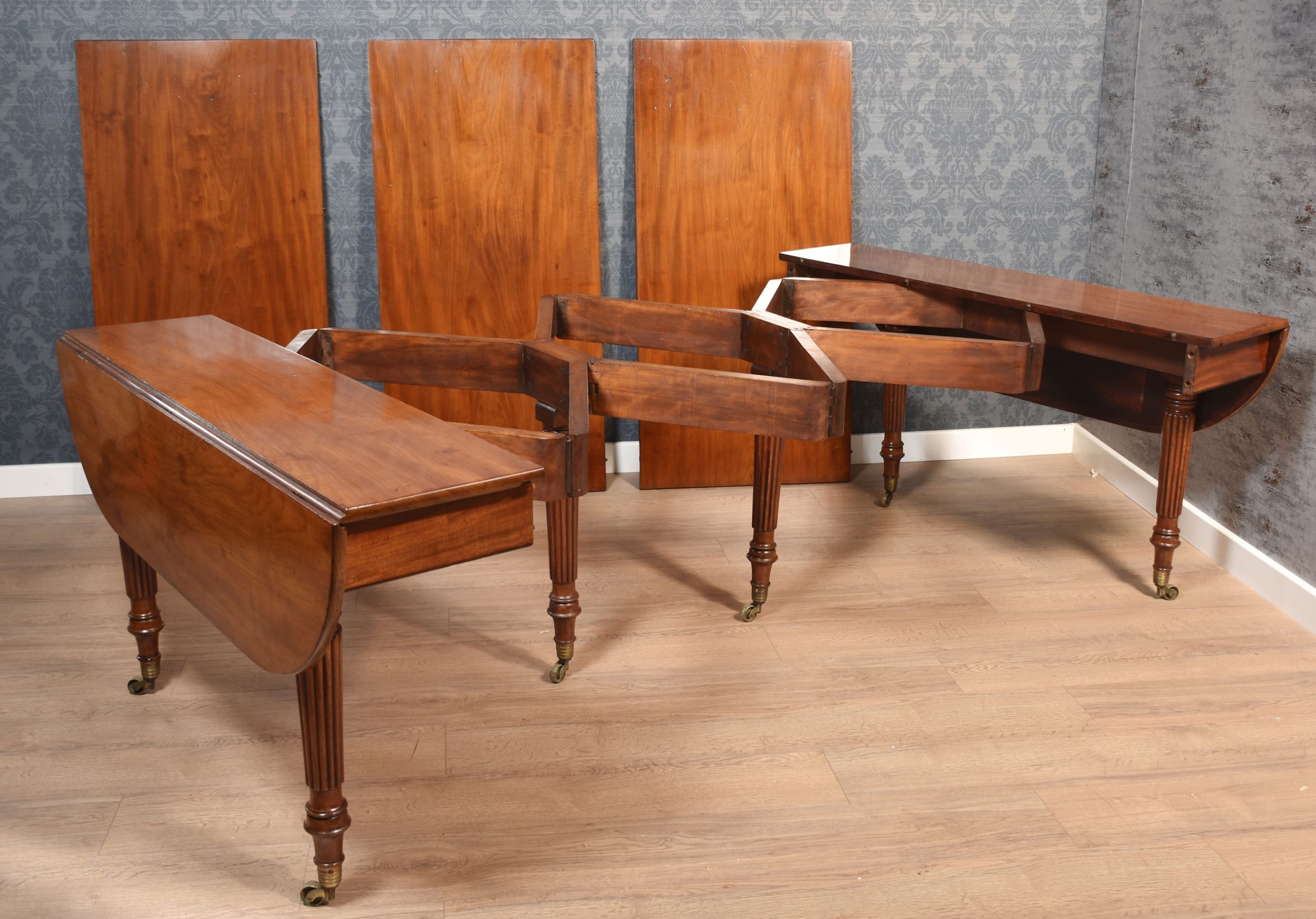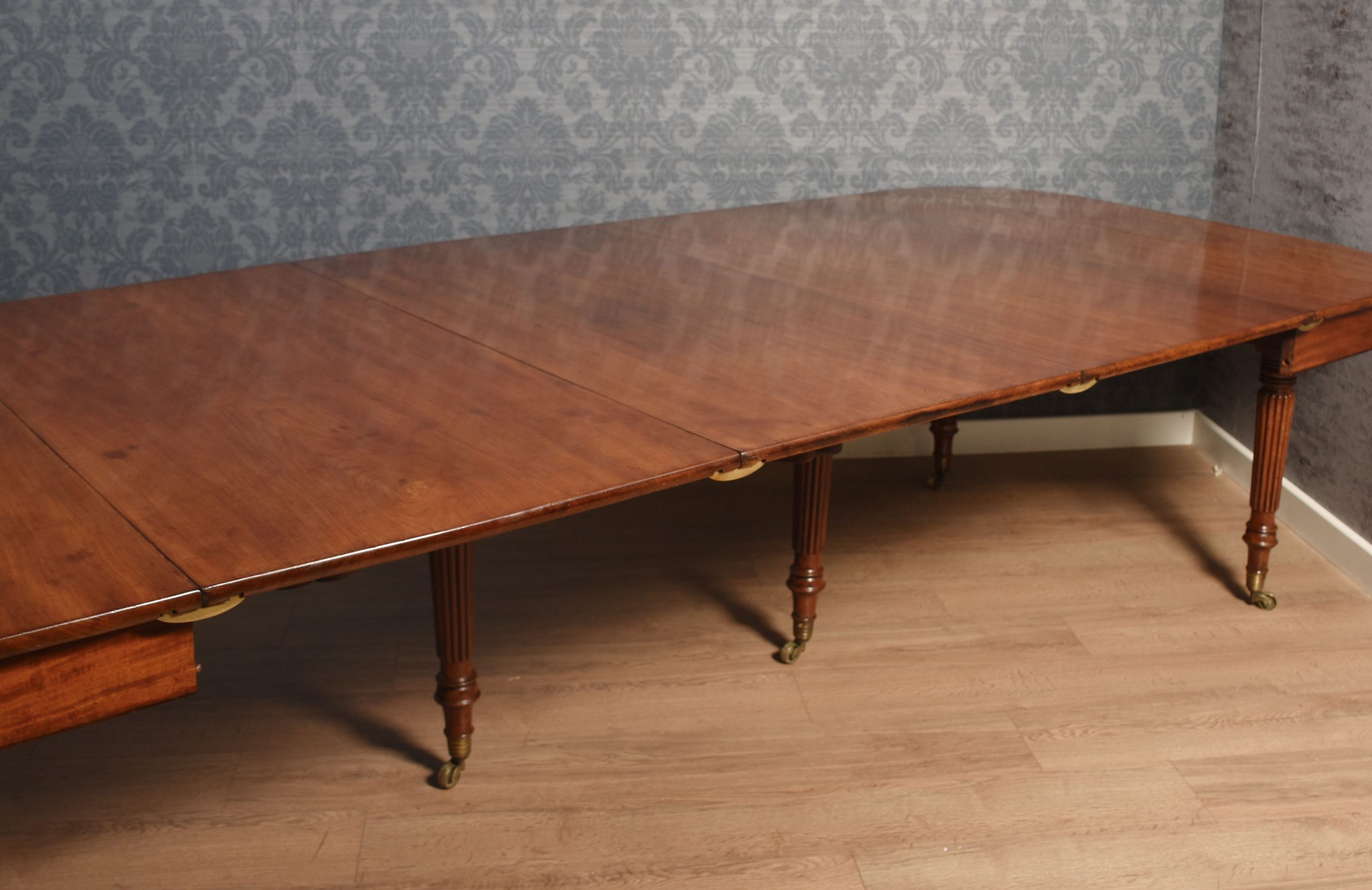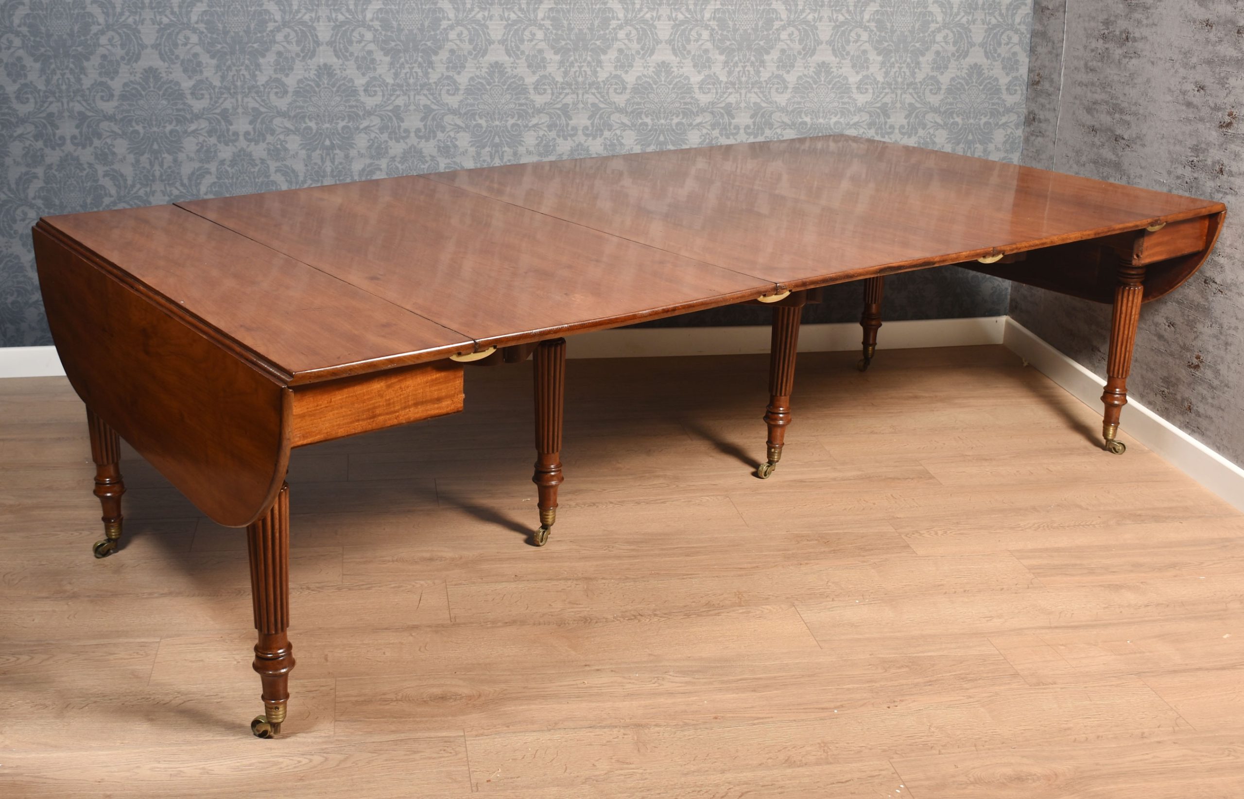 Early 19th Century Mahogany Extending Dining Table, in the manner of Gillows, The large well-figured mahogany top having shaped lift-up ends opening to incorporate three original additional leaves. The concertina action frame on fine-turned and reeded tapering legs with brass-capped toes and castors. This table will seat 10-12 People.