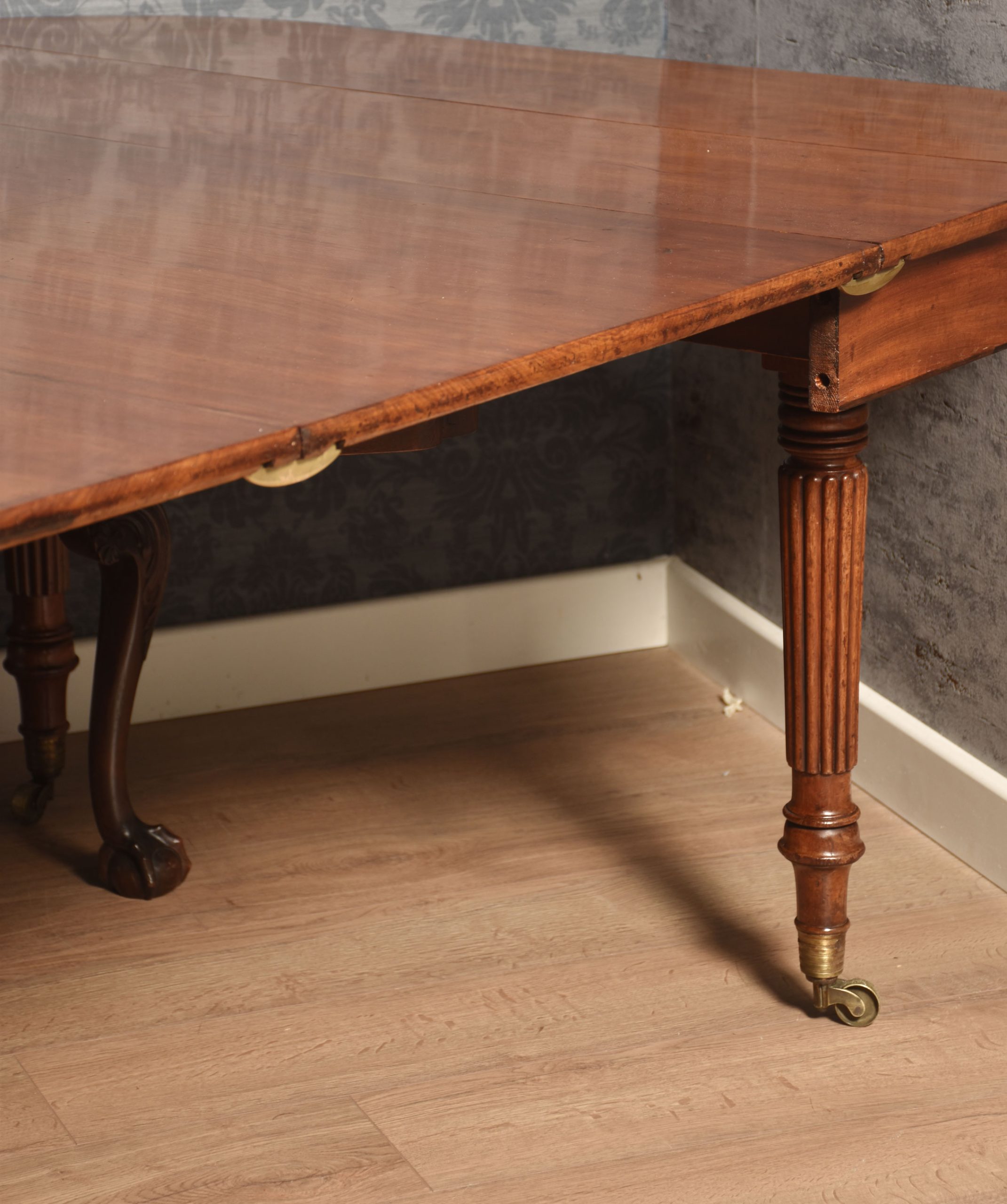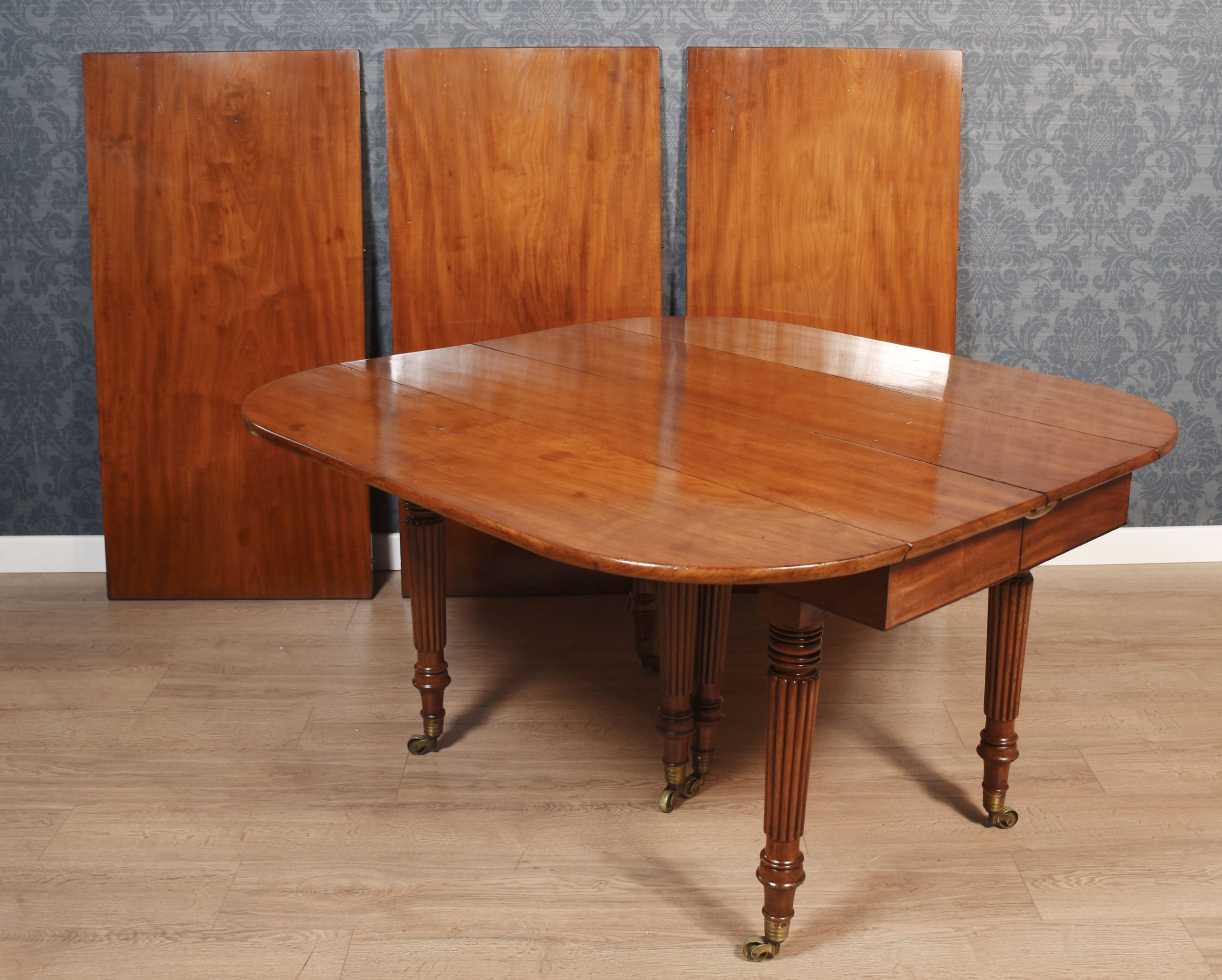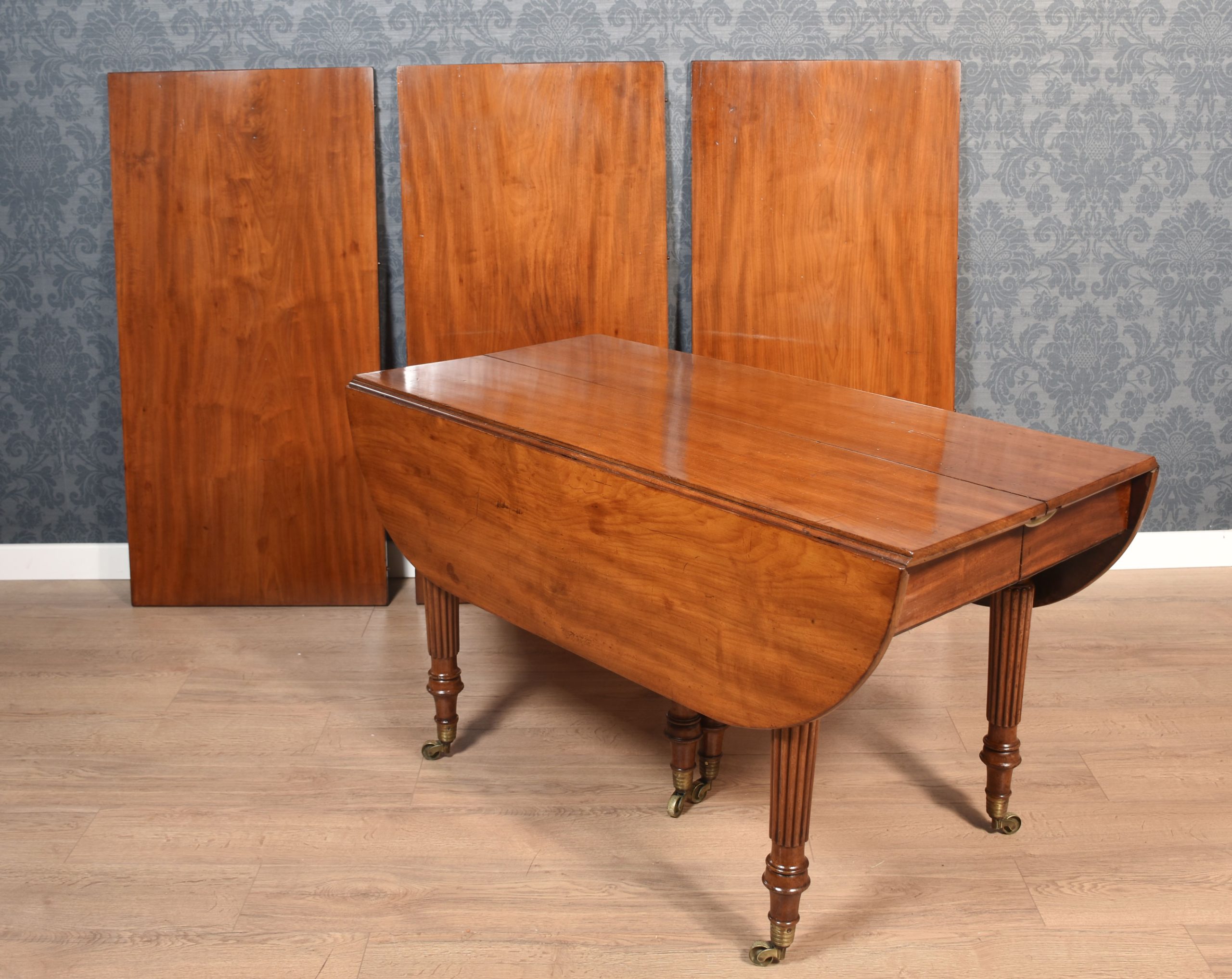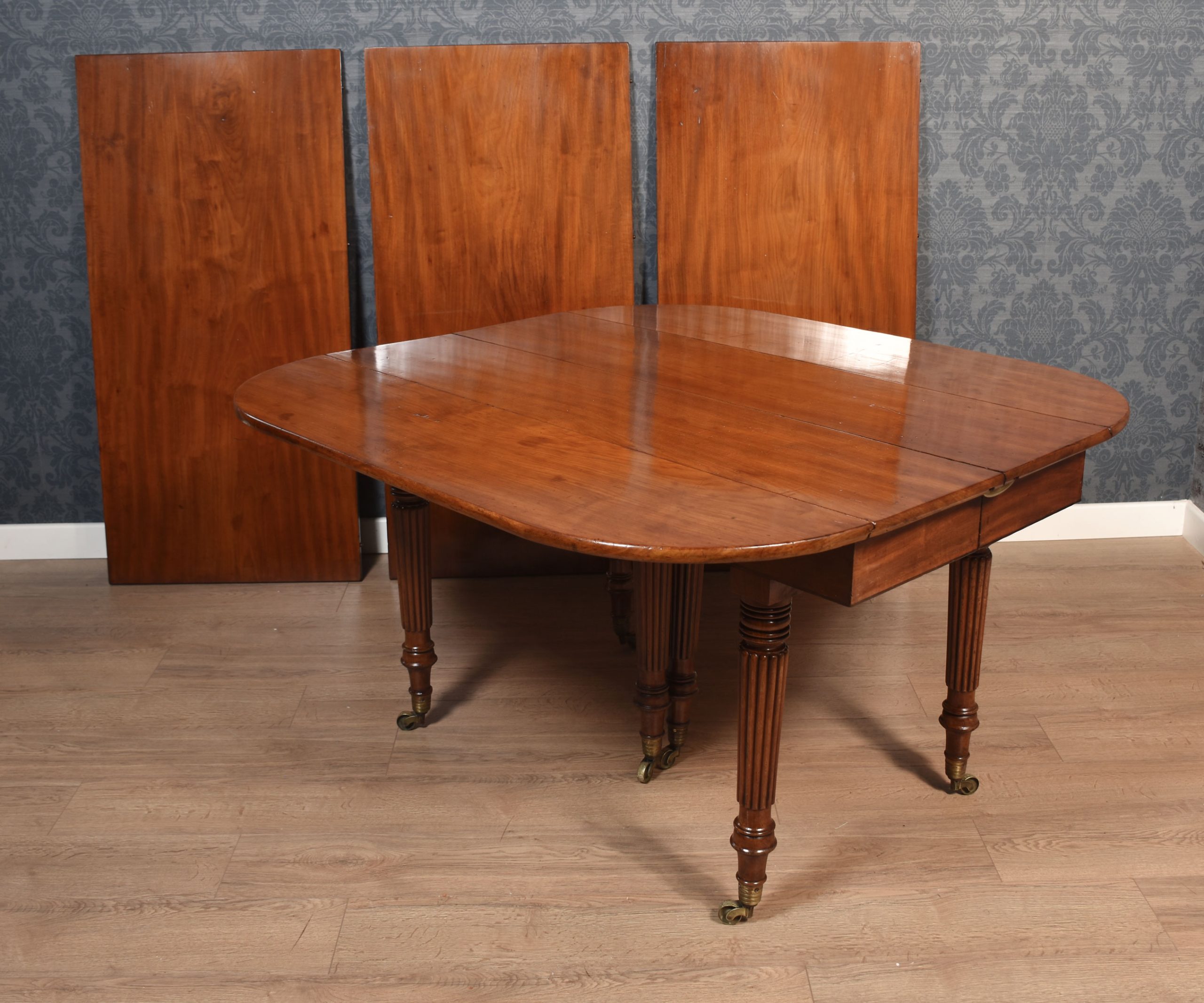 Early 19th Century Mahogany Extending Dining Table, in the manner of Gillows, The large well-figured mahogany top having shaped lift-up ends opening to incorporate three original additional leaves. The concertina action frame on fine-turned and reeded tapering legs with brass-capped toes and castors. This table will seat 10-12 People.
