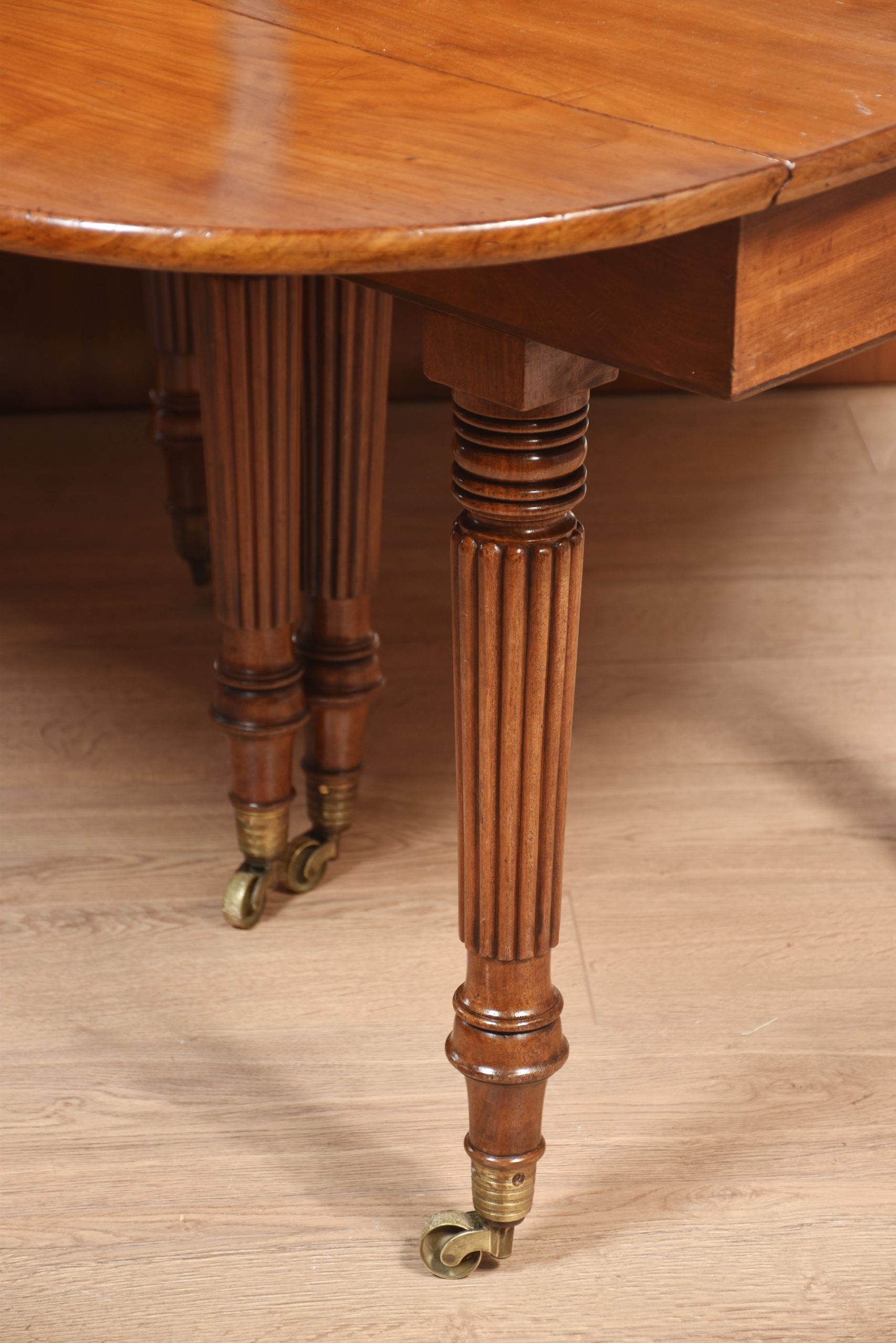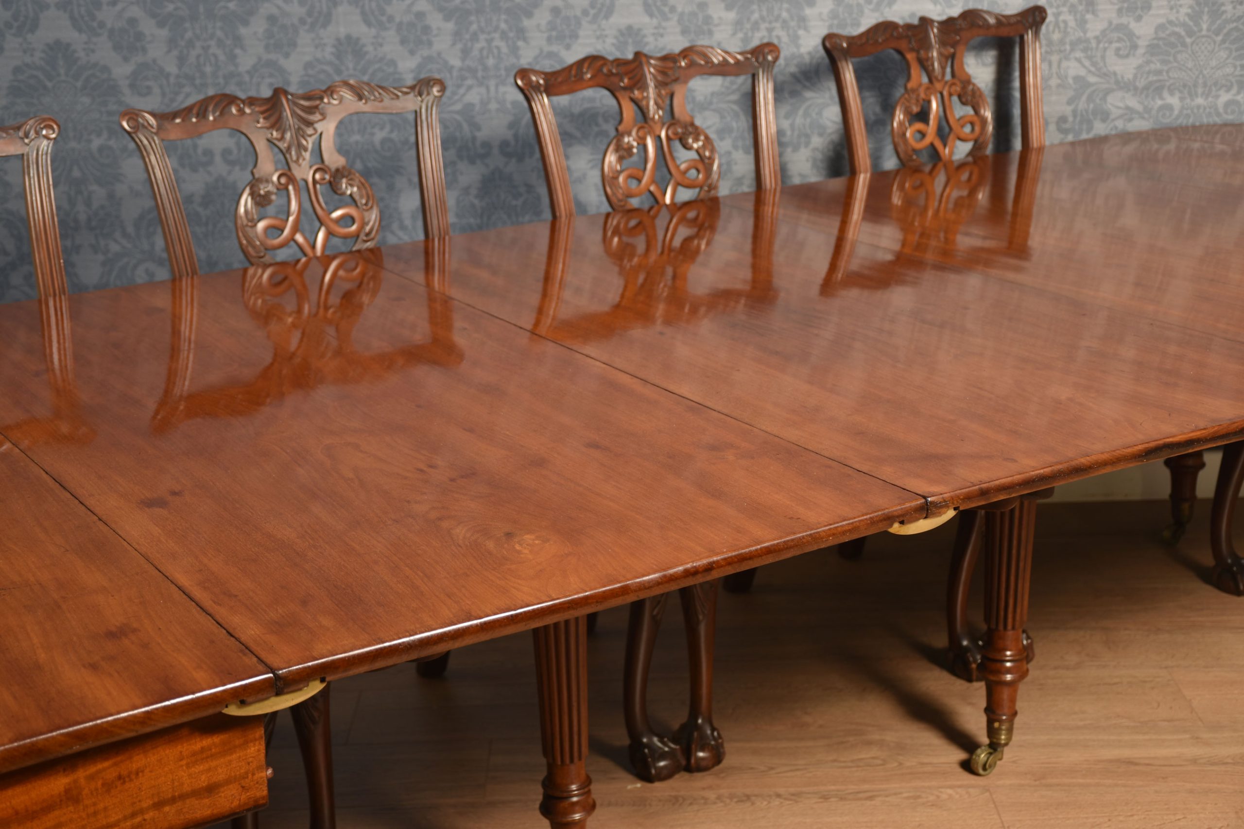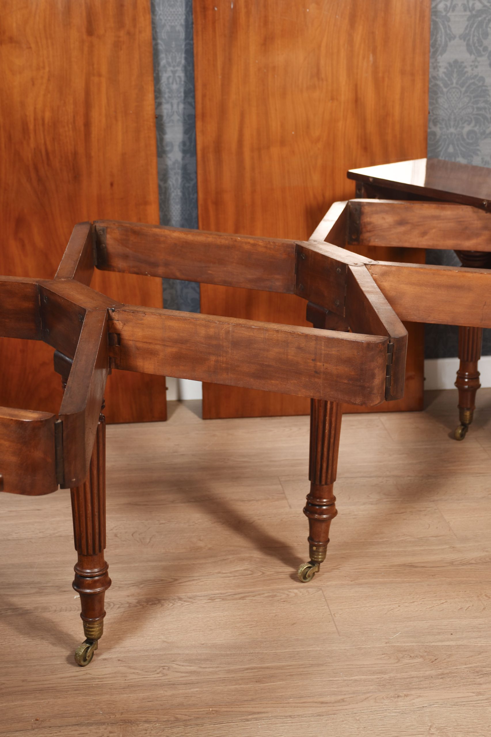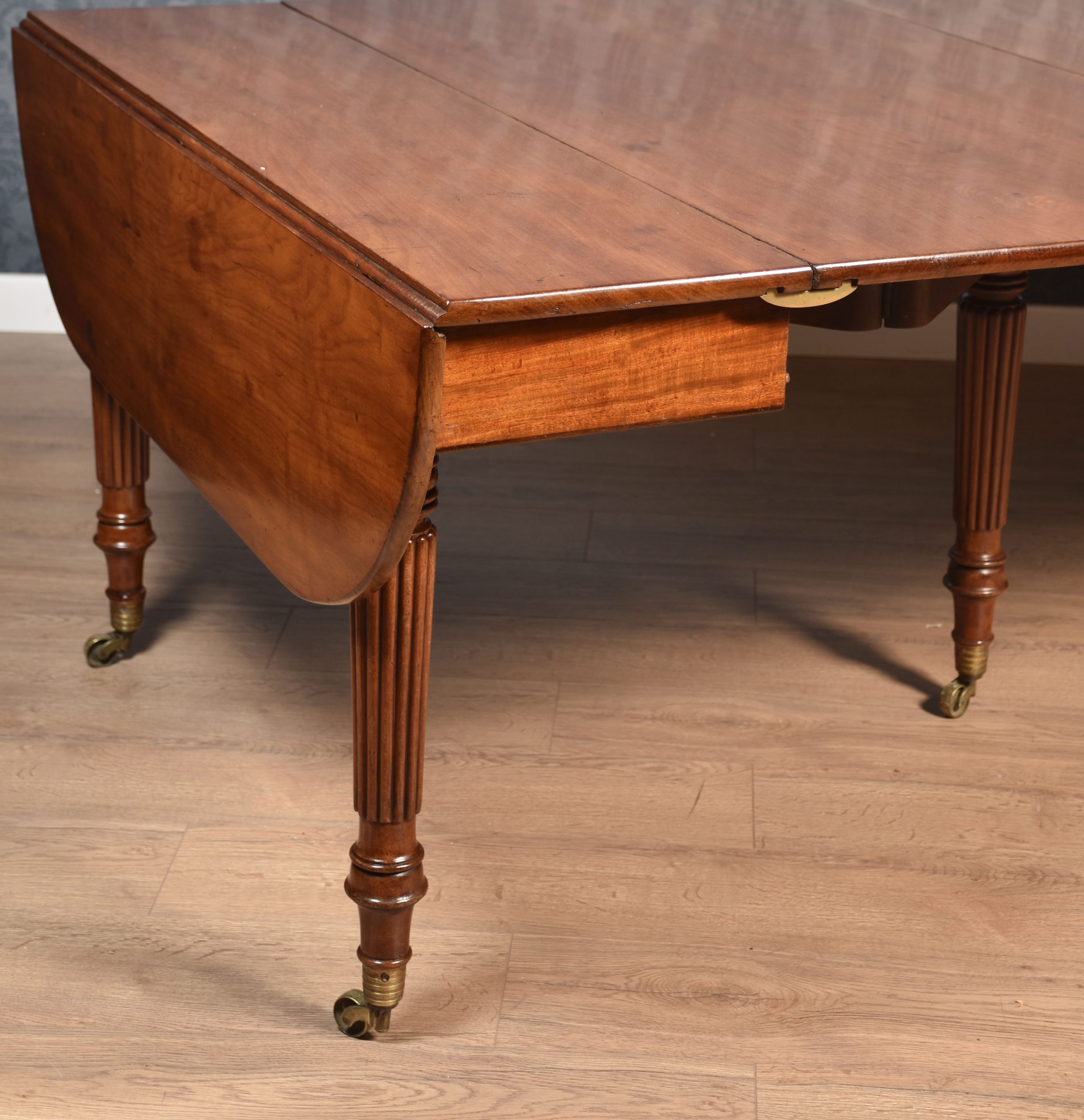 Early 19th Century Mahogany Extending Dining Table, in the manner of Gillows, The large well-figured mahogany top having shaped lift-up ends opening to incorporate three original additional leaves. The concertina action frame on fine-turned and reeded tapering legs with brass-capped toes and castors. This table will seat 10-12 People.