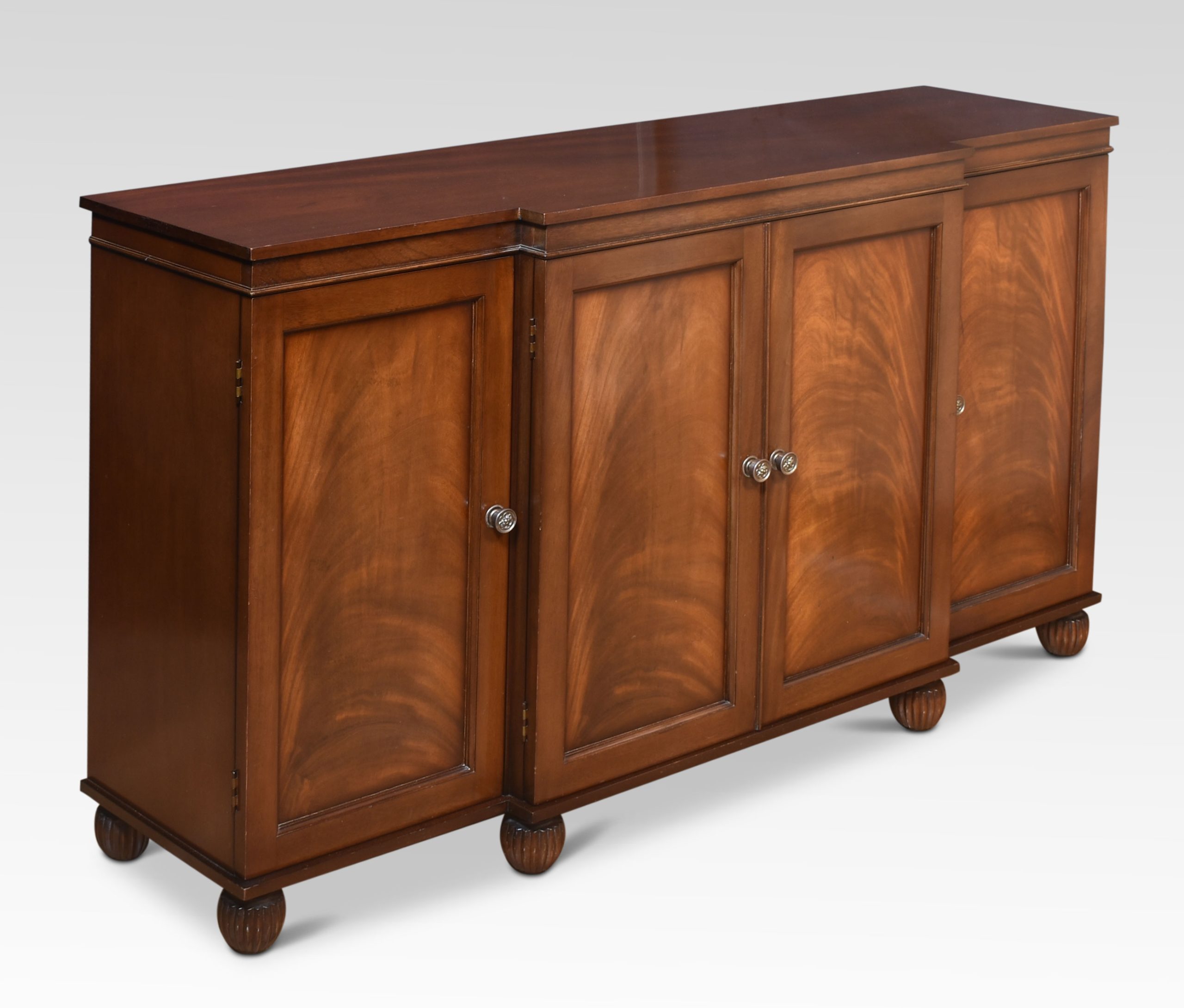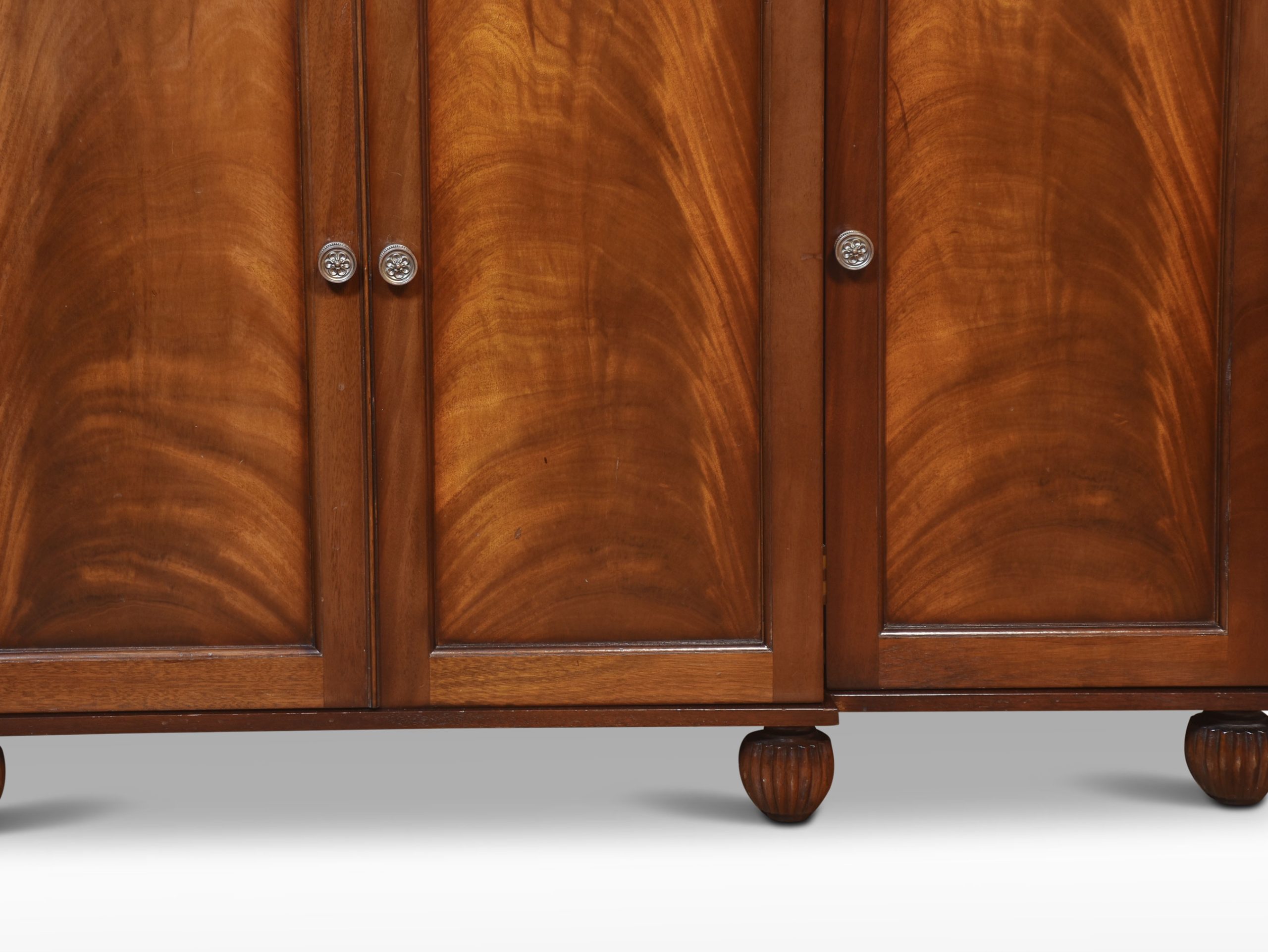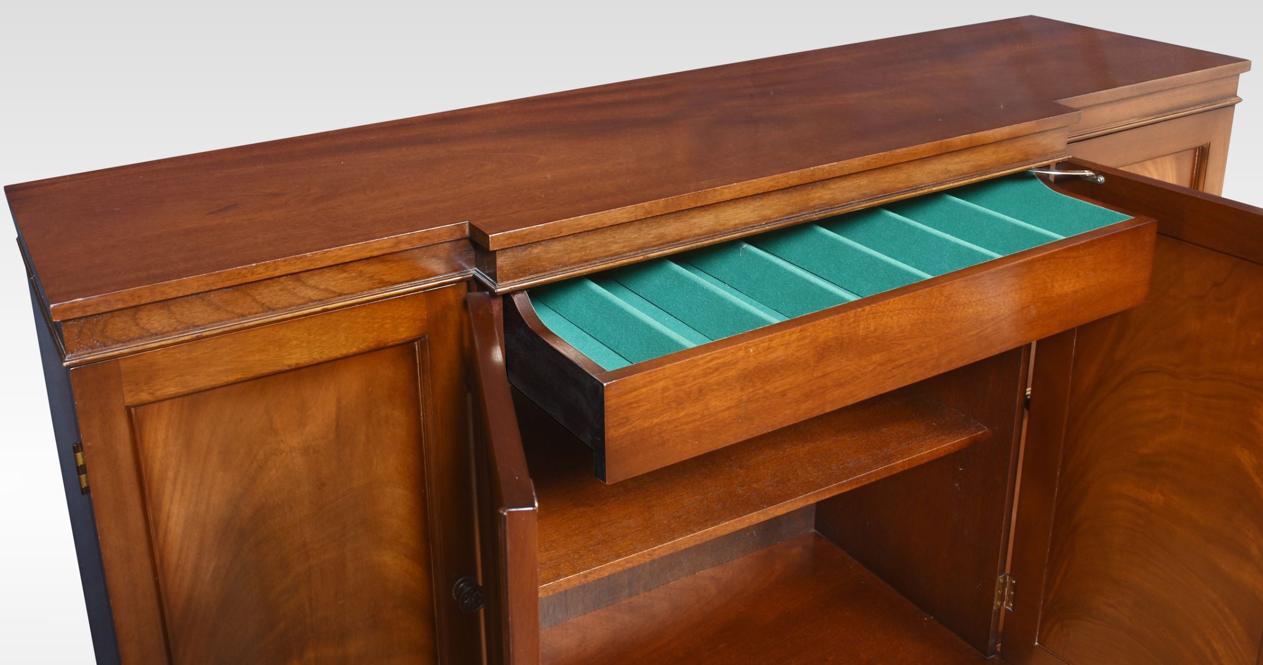 Mahogany side bird the large rectangular mahogany breakfront top above four flame mahogany panelled doors opening to reveal the adjustable shelved interior and baize lined cutlery drawer. All raised up on turned feet.