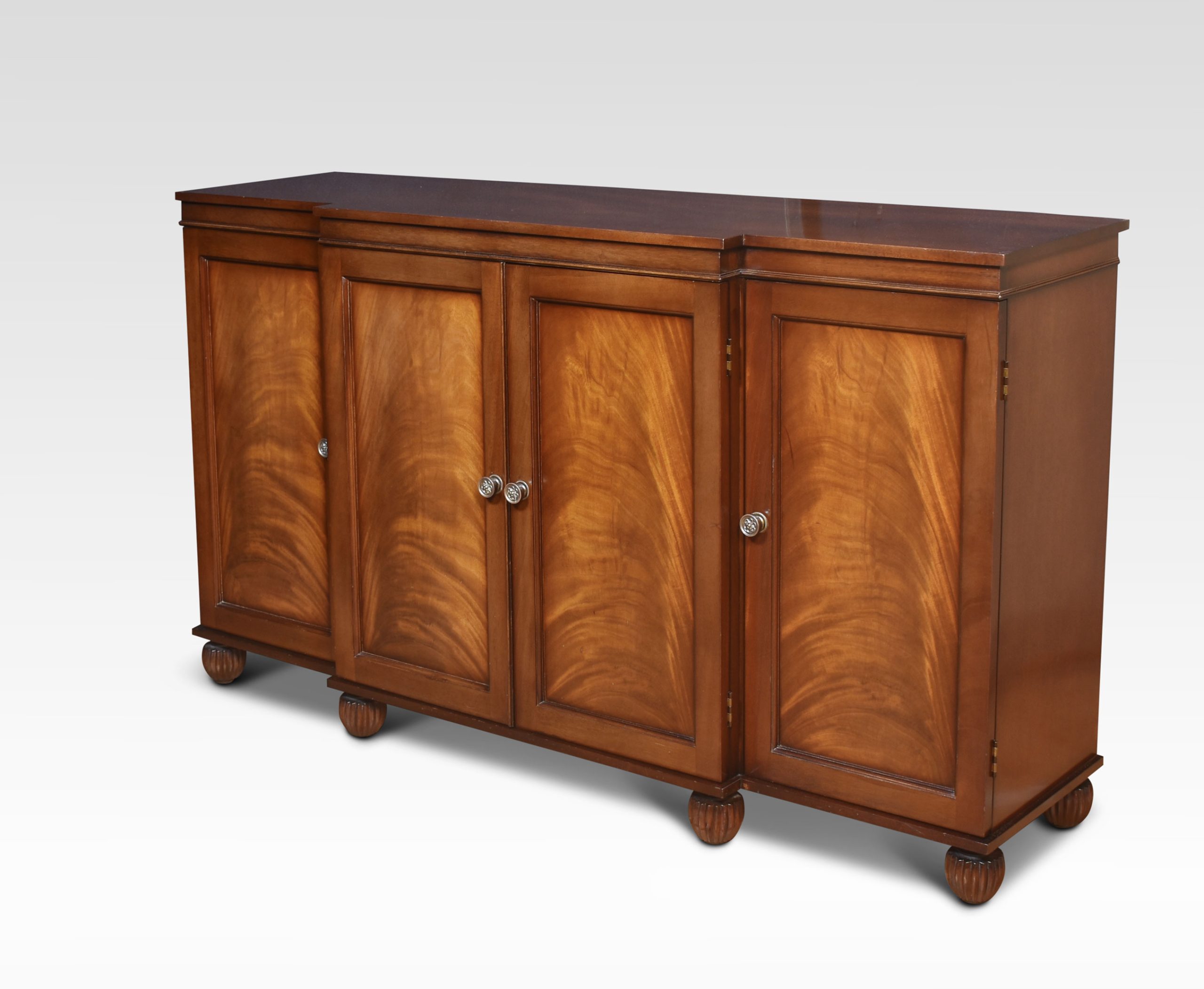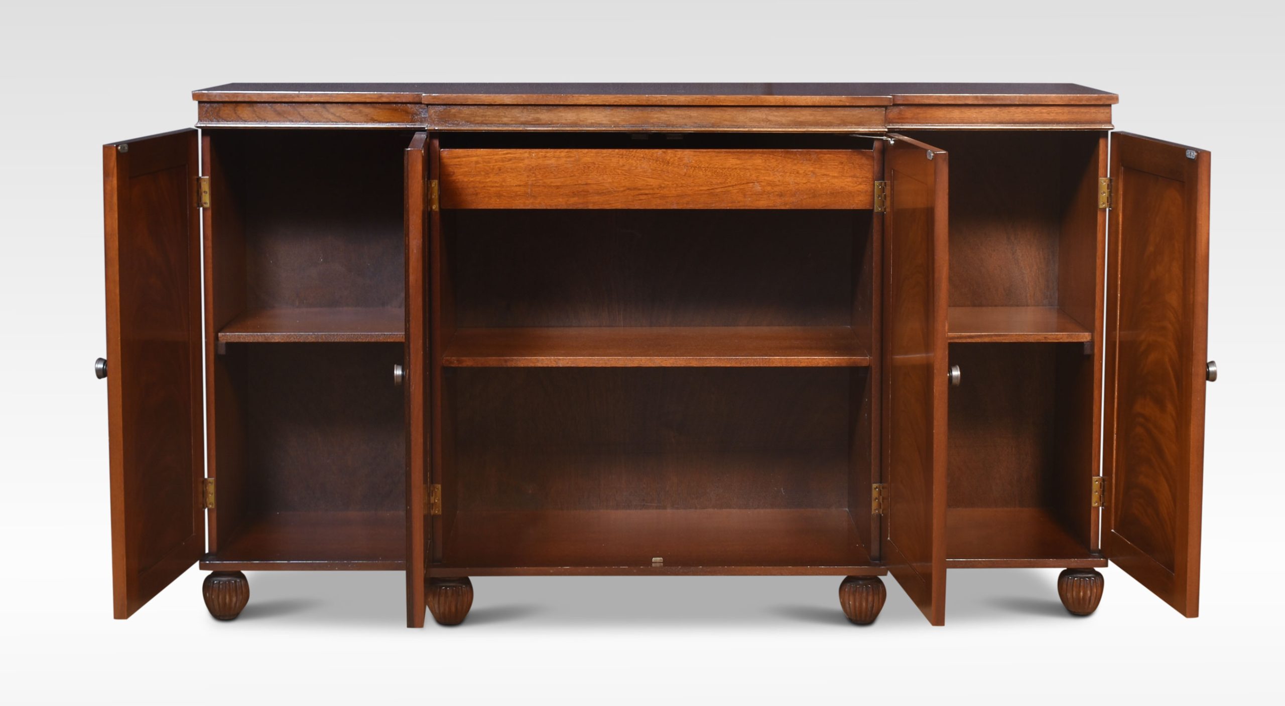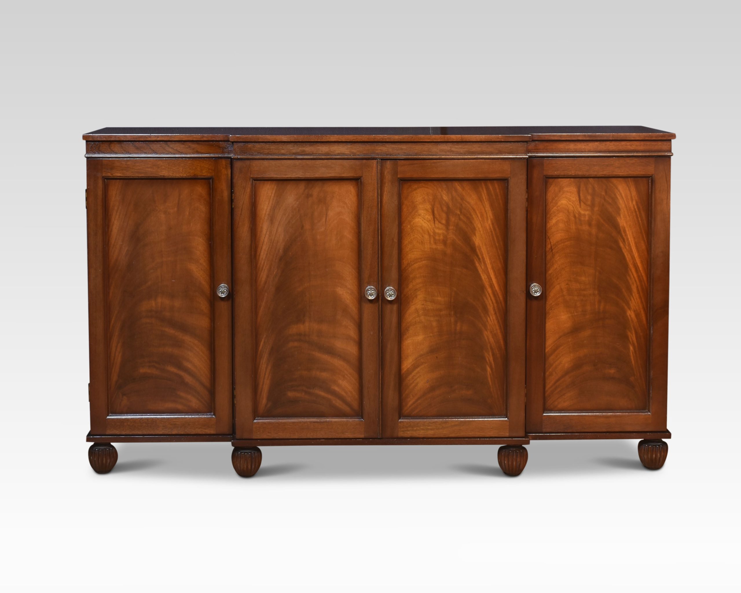 Mahogany side bird the large rectangular mahogany breakfront top above four flame mahogany panelled doors opening to reveal the adjustable shelved interior and baize lined cutlery drawer. All raised up on turned feet.