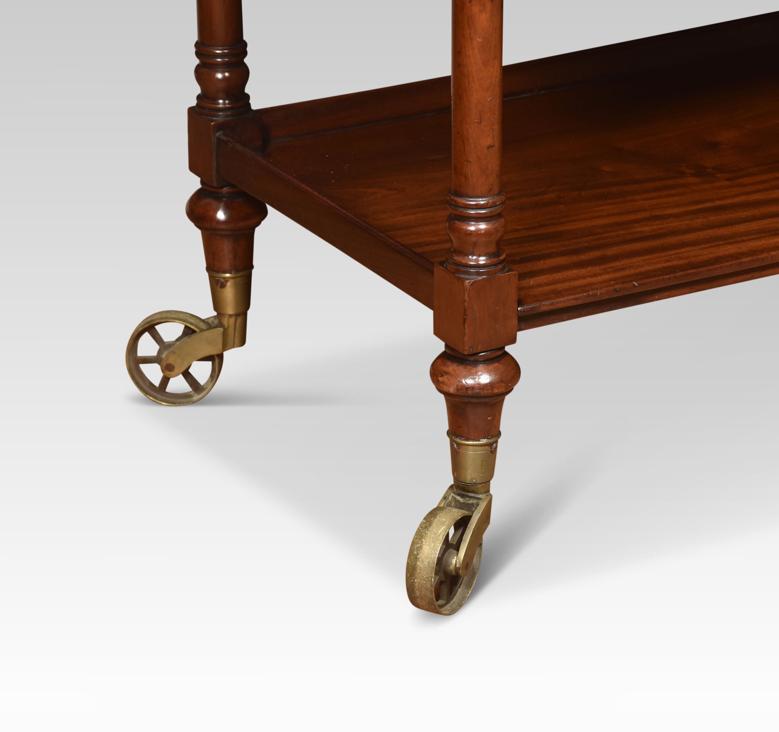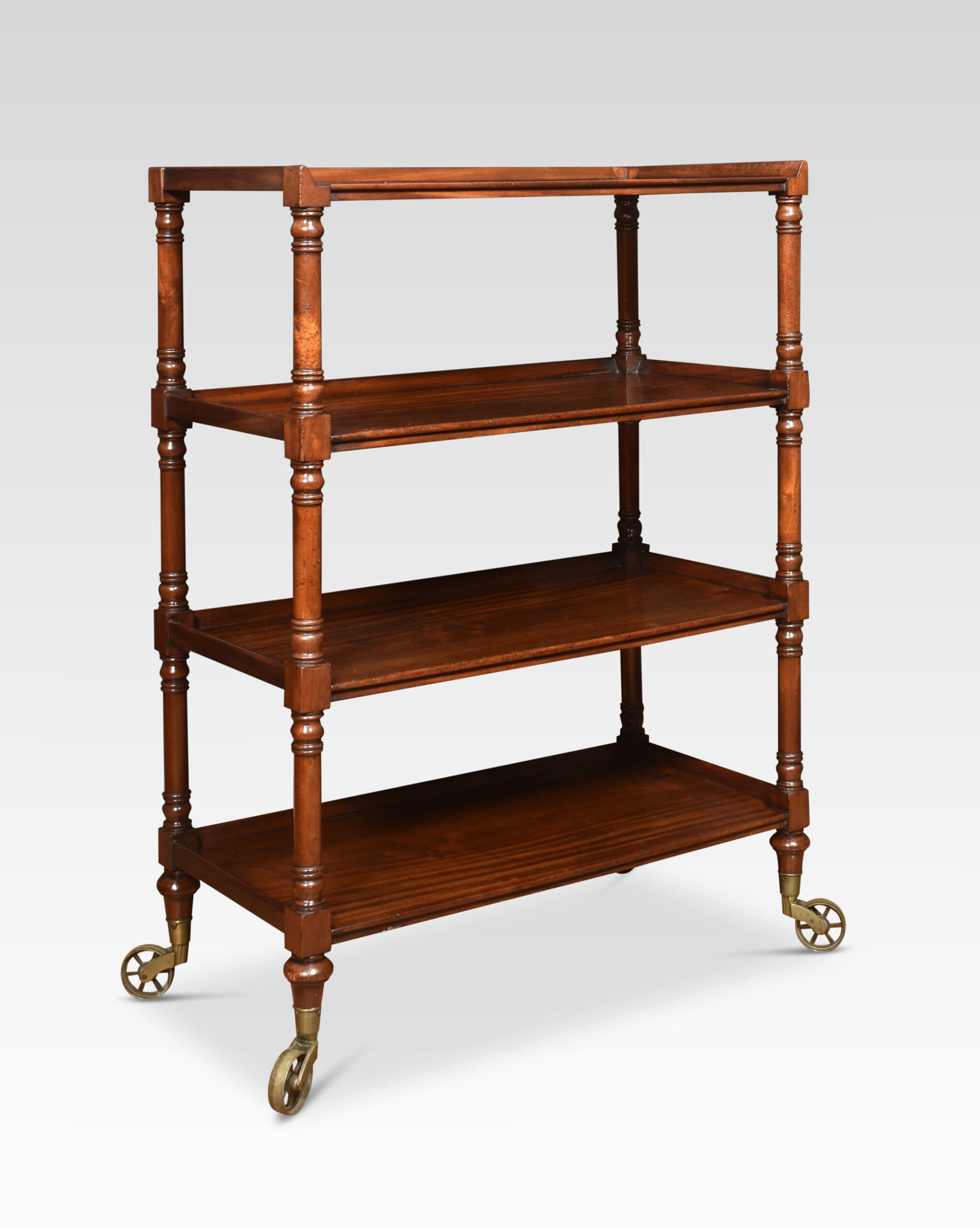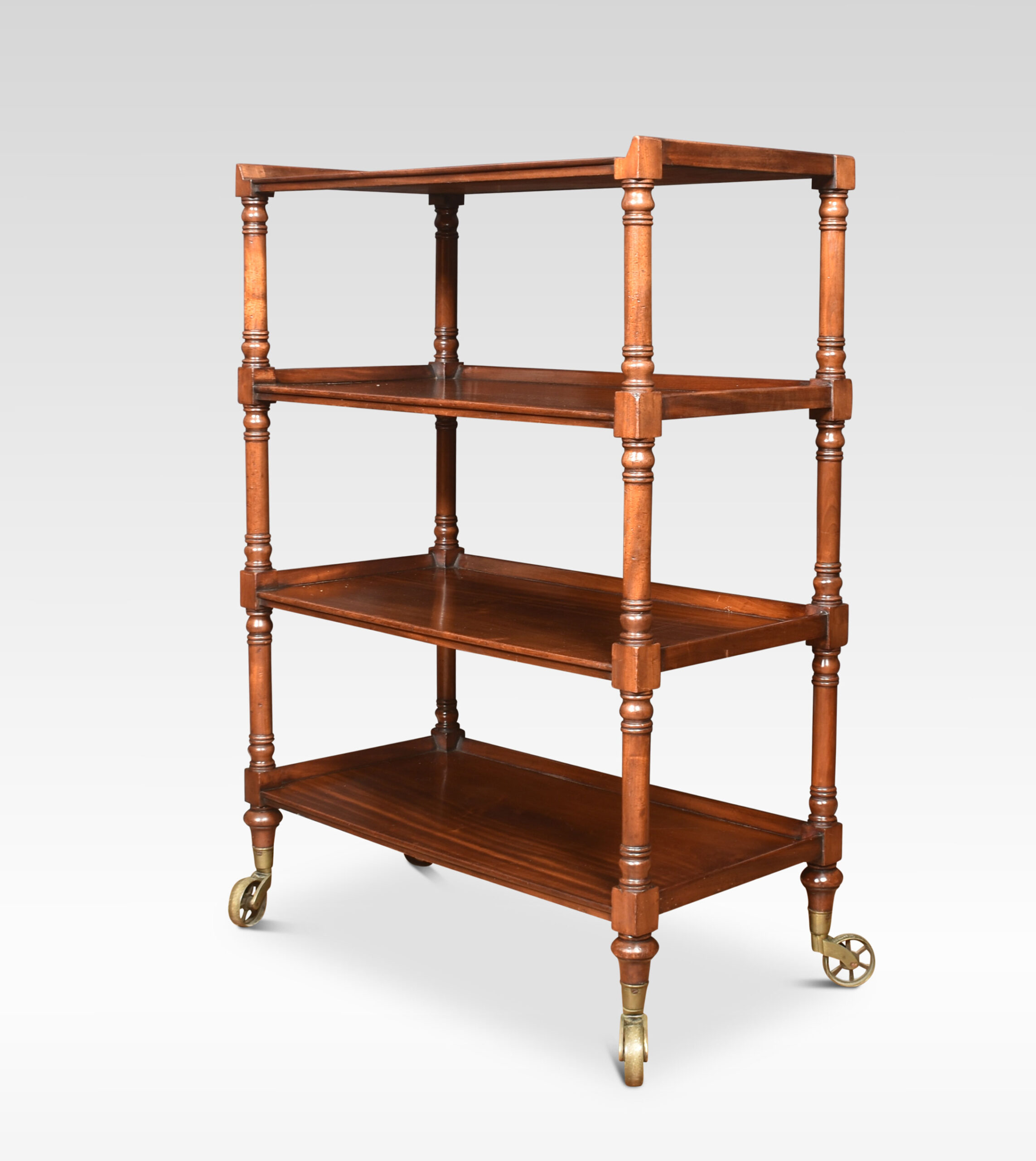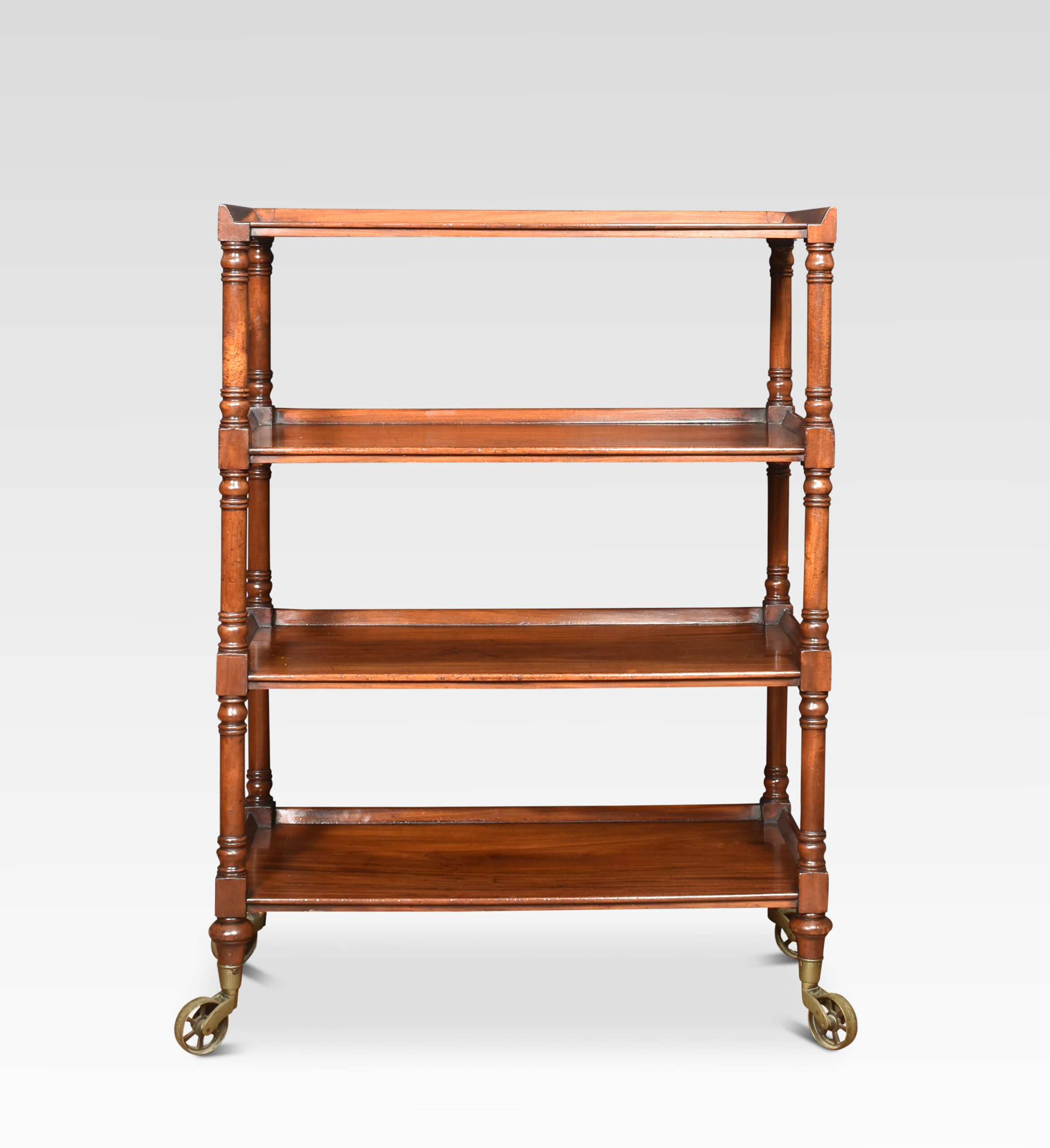Mahogany drinks trolly, the four rectangular well figure mahogany tiers united by turned carved uprights. Raised up on four large brass spoked castors.
