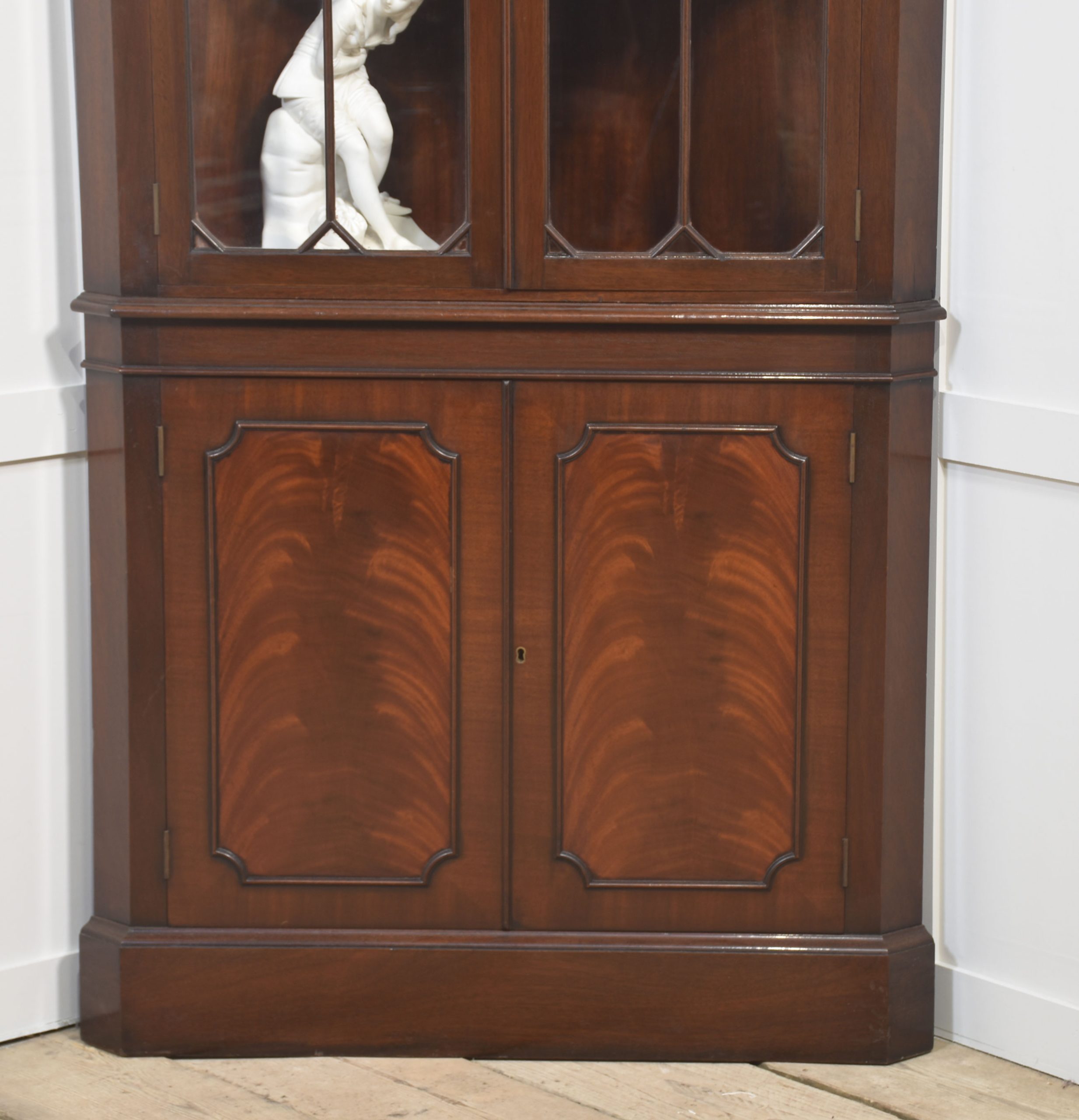 Mahogany standing corner cupboard the moulded top above a pair of glazed beaded doors opening to reveal a shelved interior. The base is fitted with a pair of well-figured mahogany panelled doors that open to reveal a single fixed shelf. All raised on bracket feet.