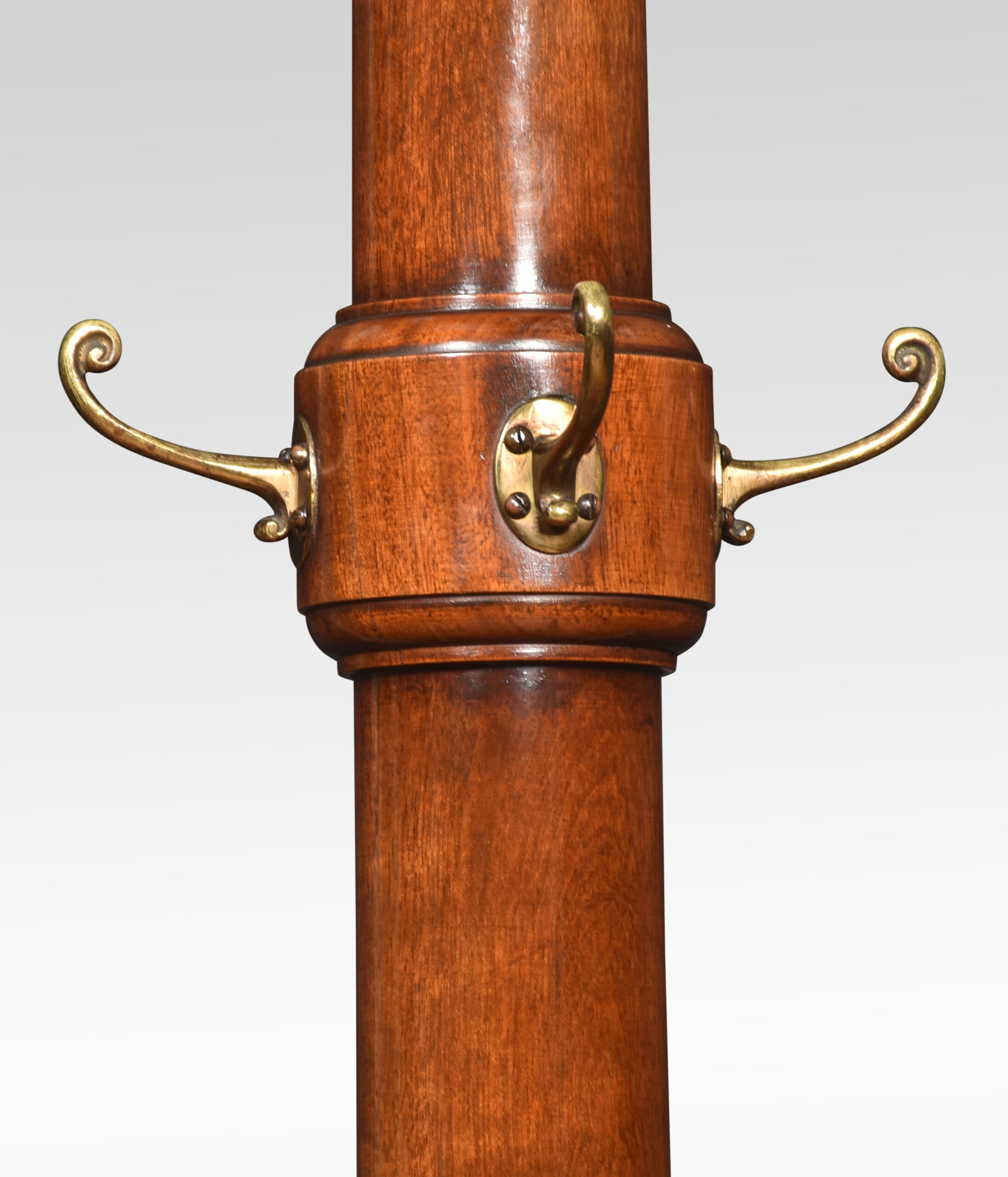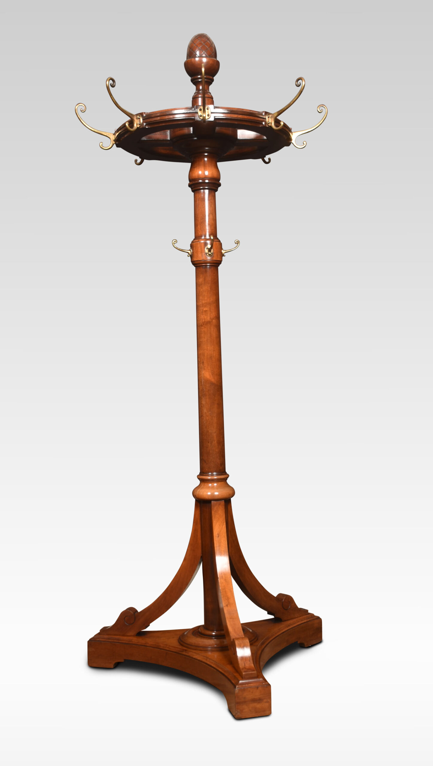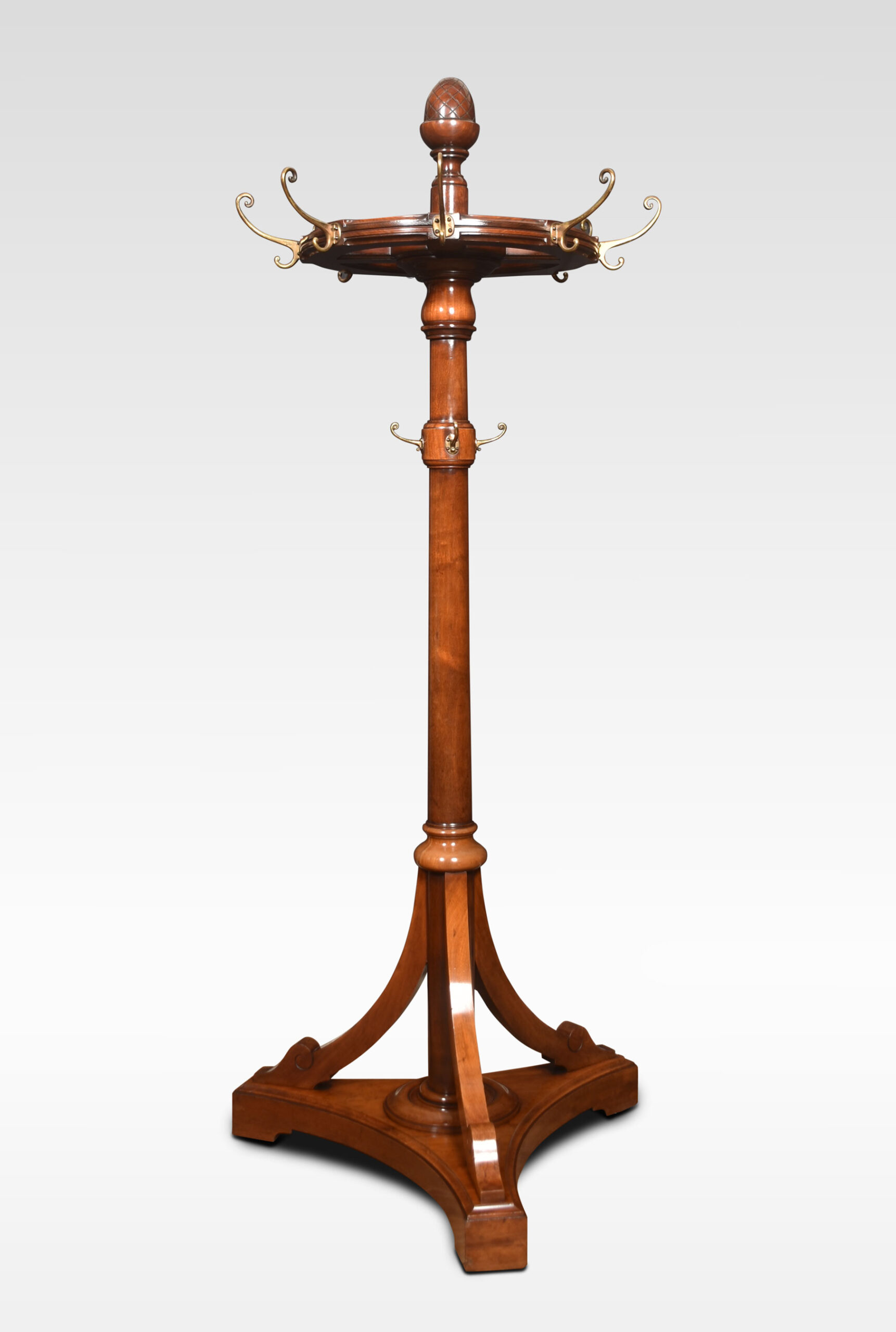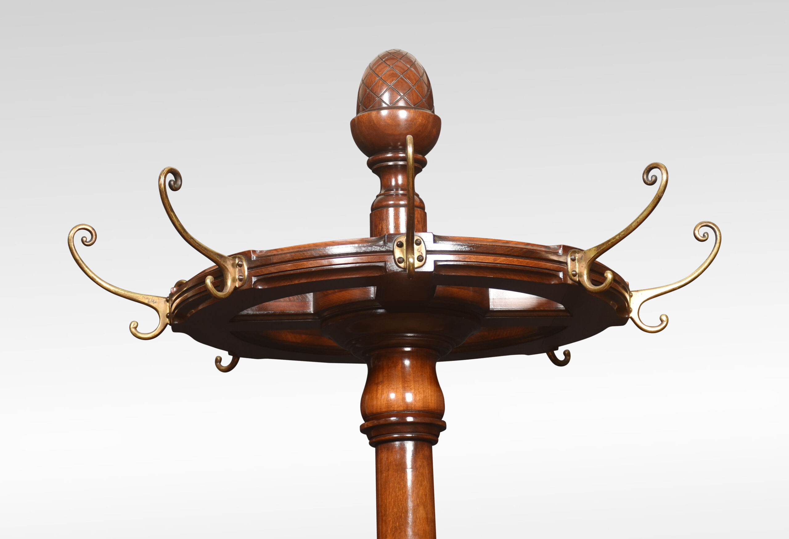 Mahogany hat and coat stand with an acorn finial, rotating top section with eight brass hooks and four smaller hooks raised up on circular column with a triform platform base.
