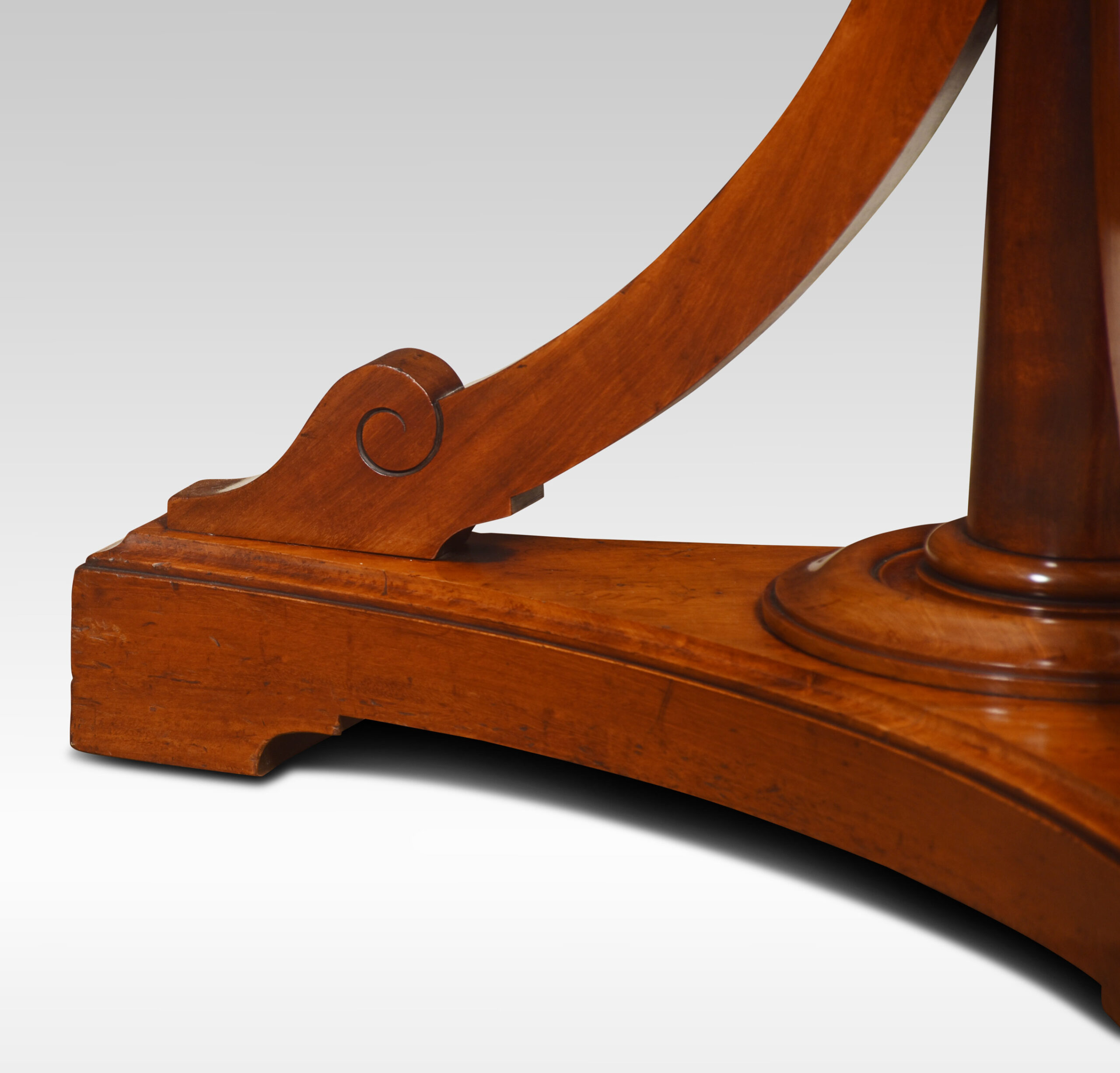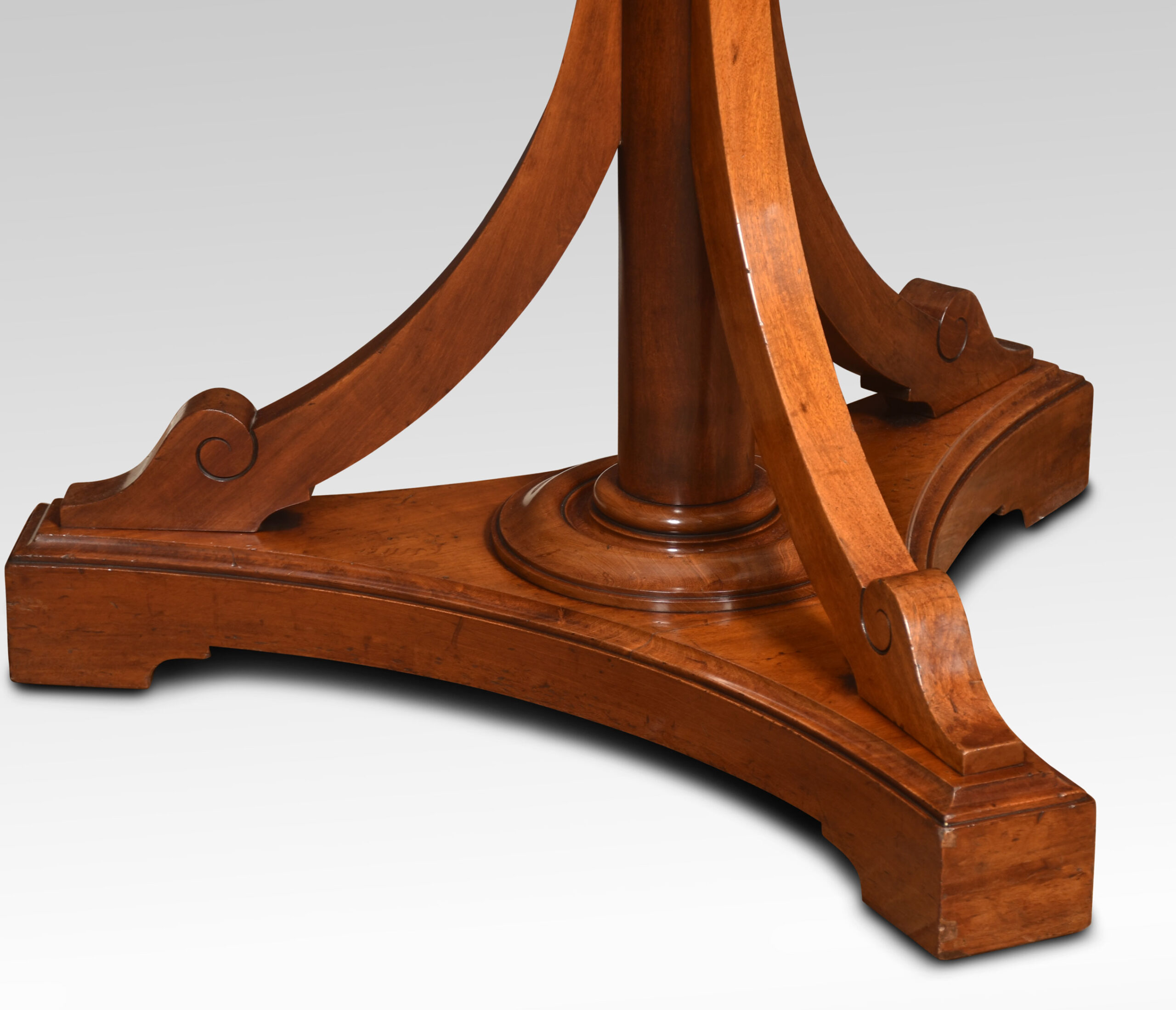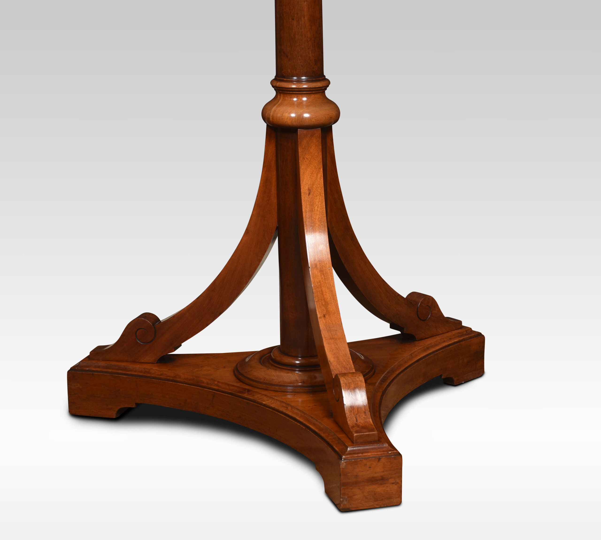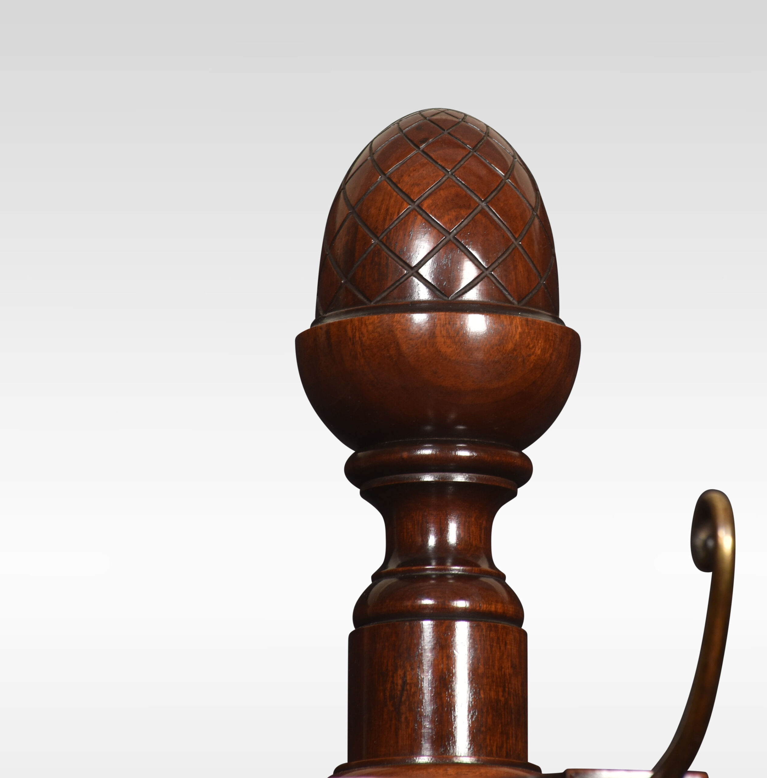 Mahogany hat and coat stand with an acorn finial, rotating top section with eight brass hooks and four smaller hooks raised up on circular column with a triform platform base.