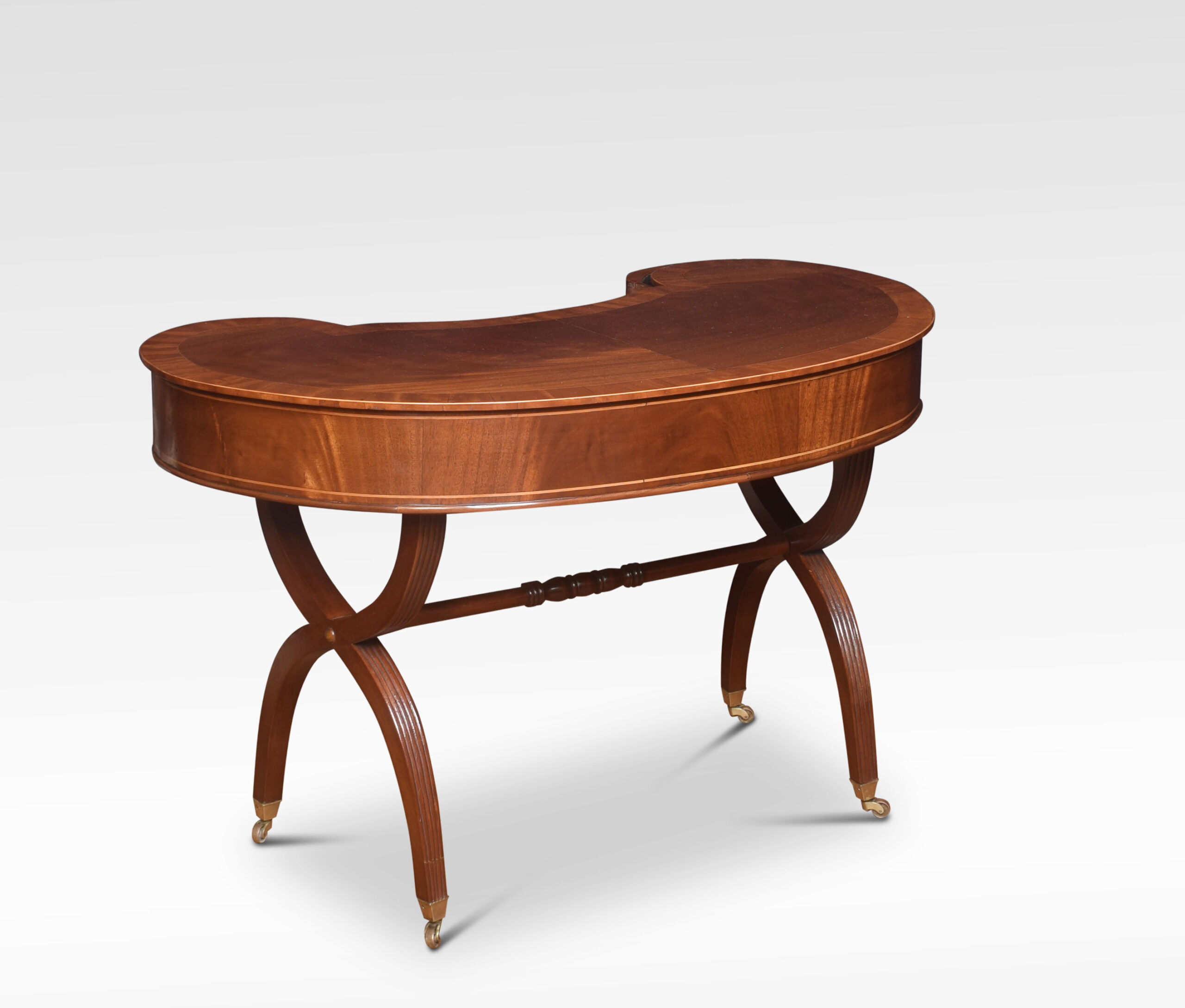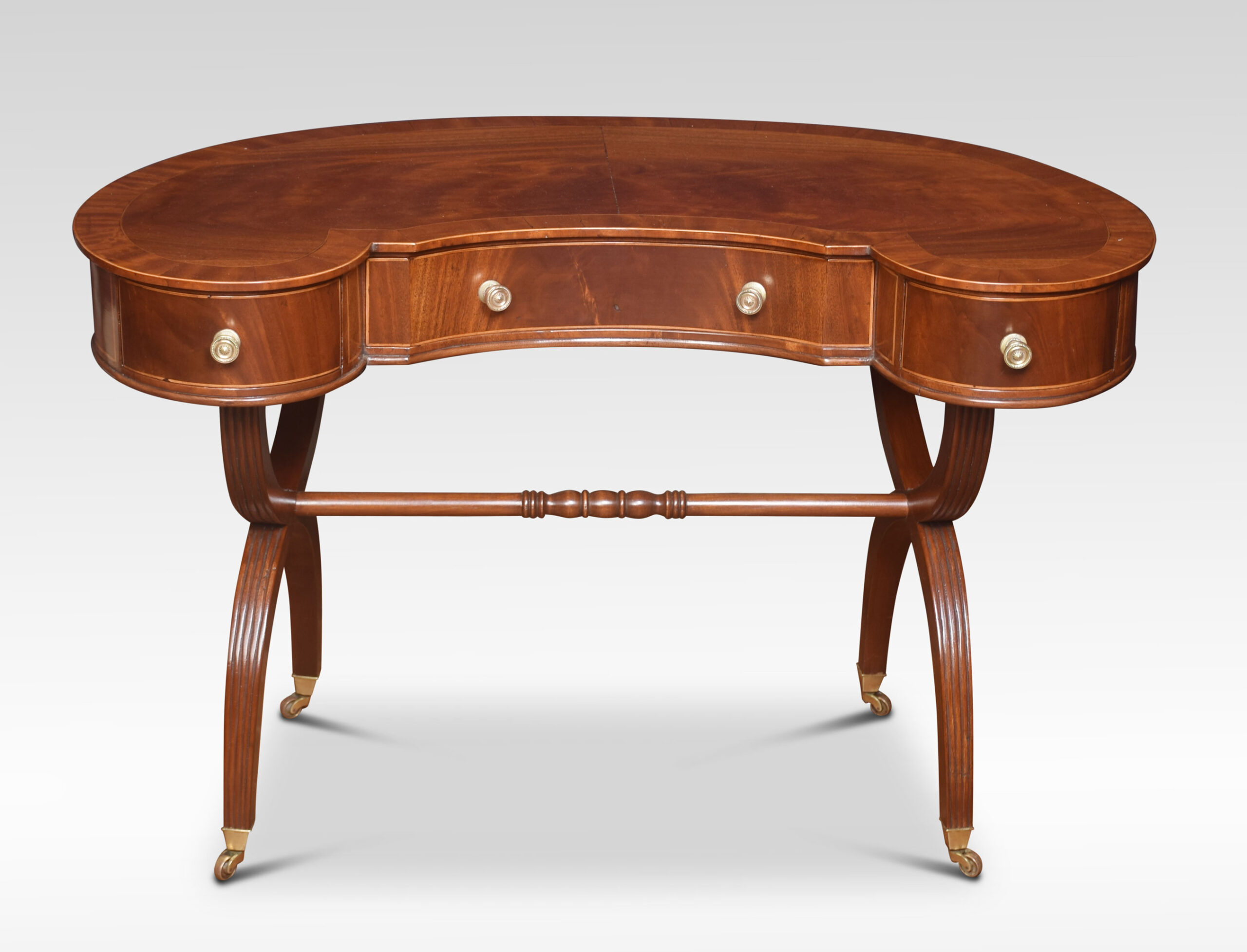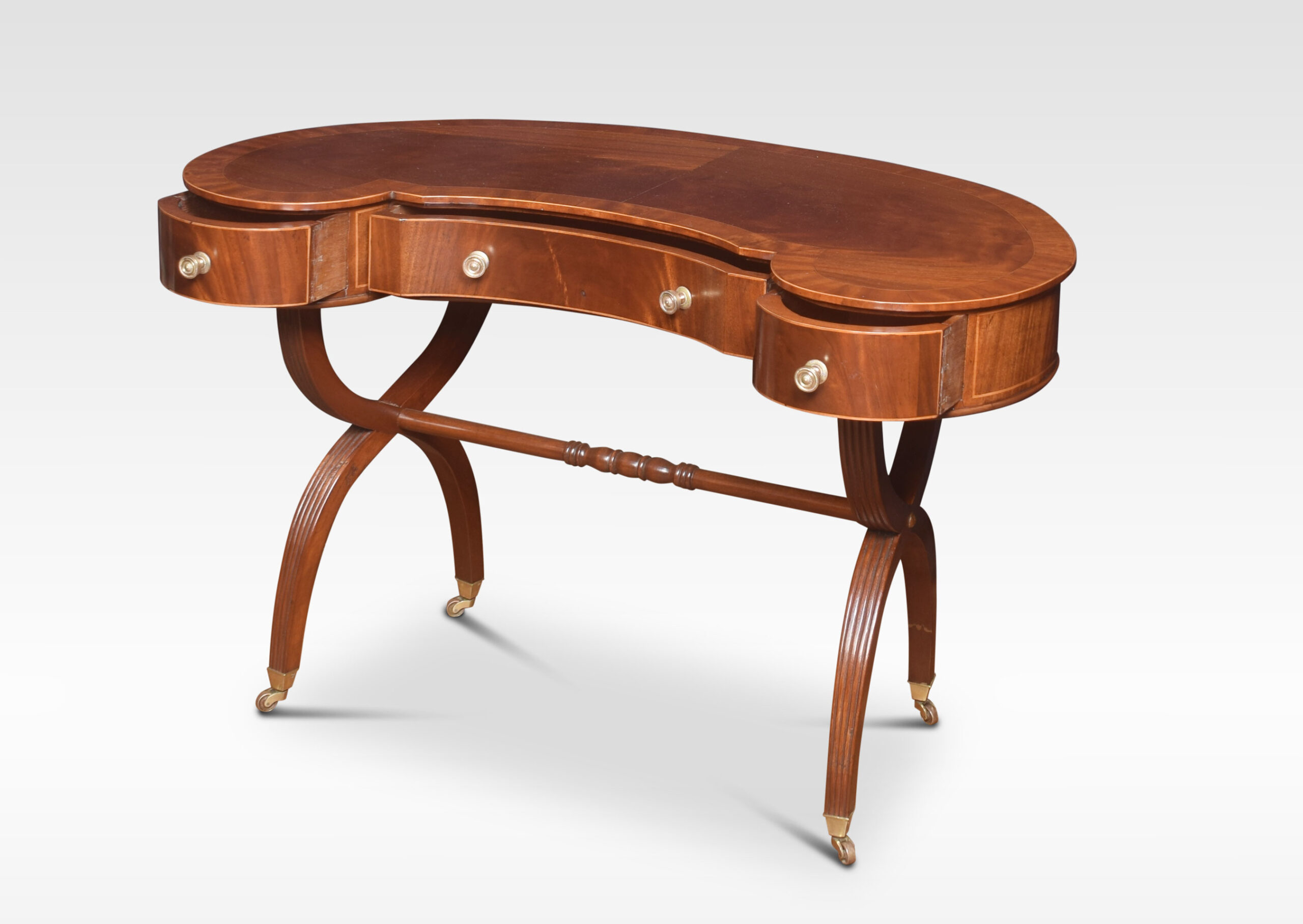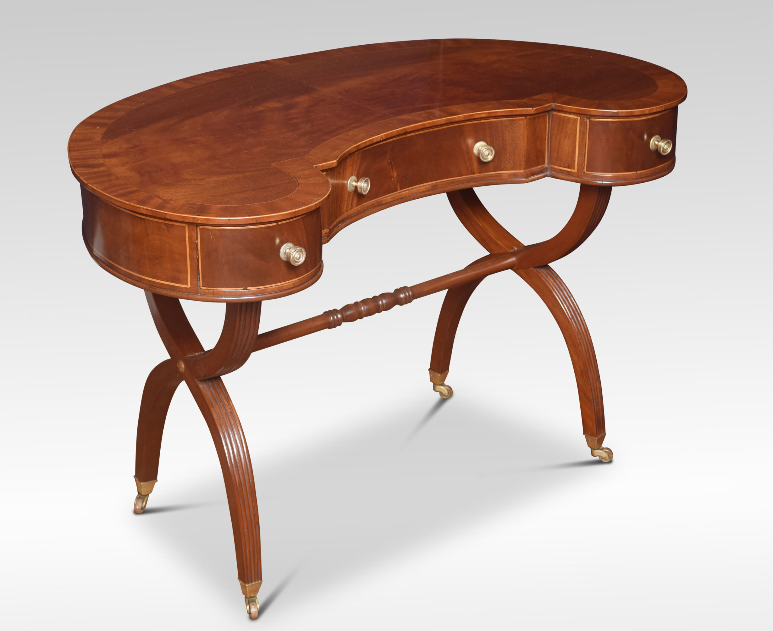 Mahogany lady’s dressing table the kidney-shaped crossbanded top, above three freeze drawers. Raised on `X` shaped supports terminating in brass castors