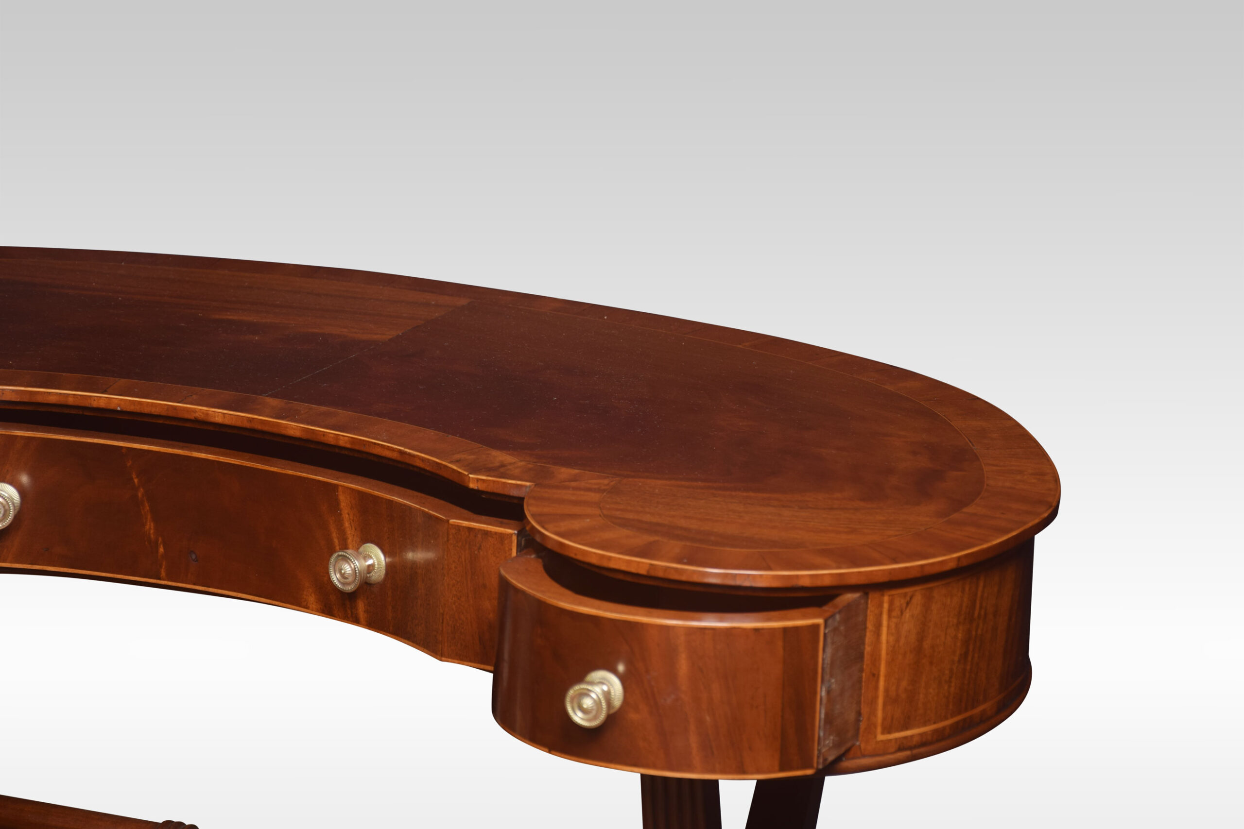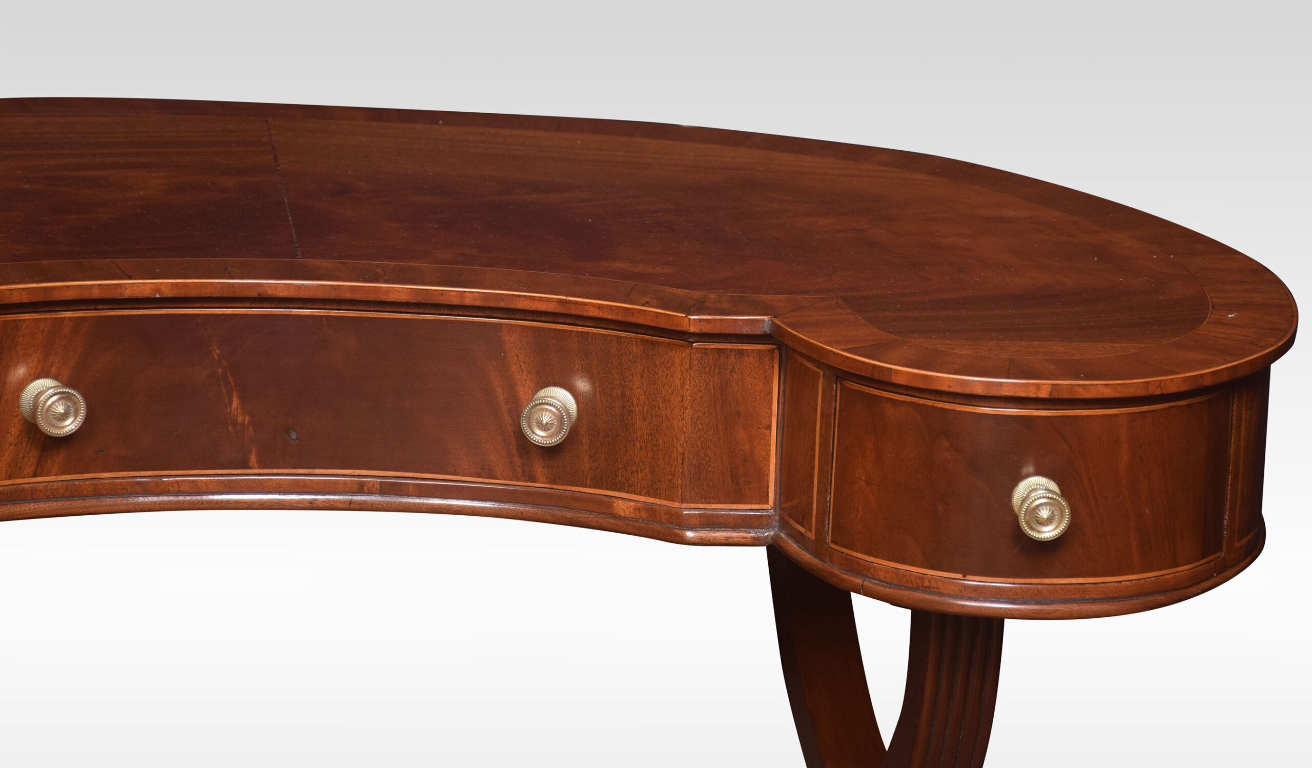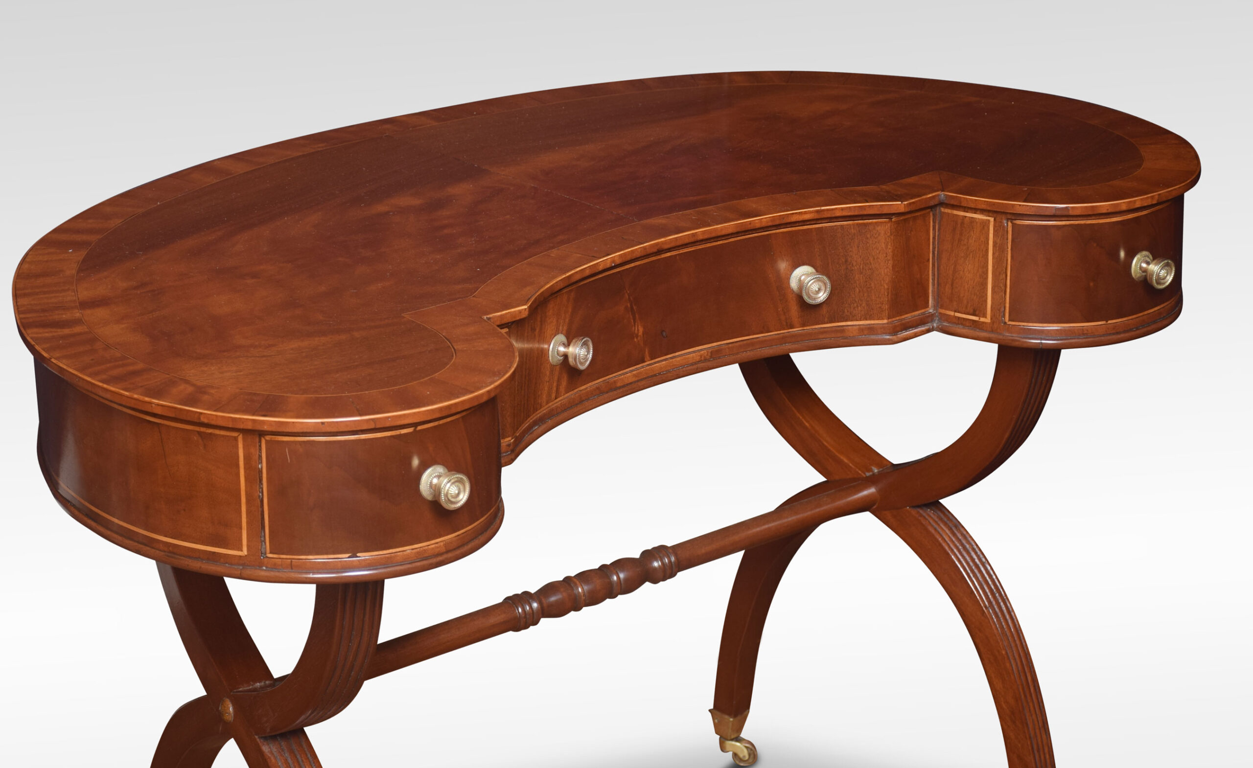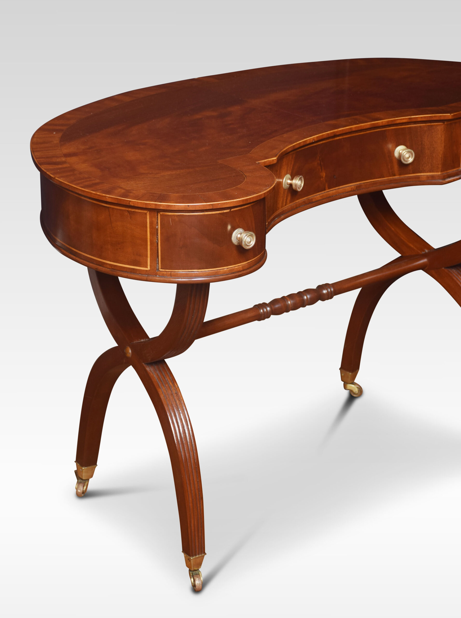 Mahogany lady’s dressing table the kidney-shaped crossbanded top, above three freeze drawers. Raised on `X` shaped supports terminating in brass castors