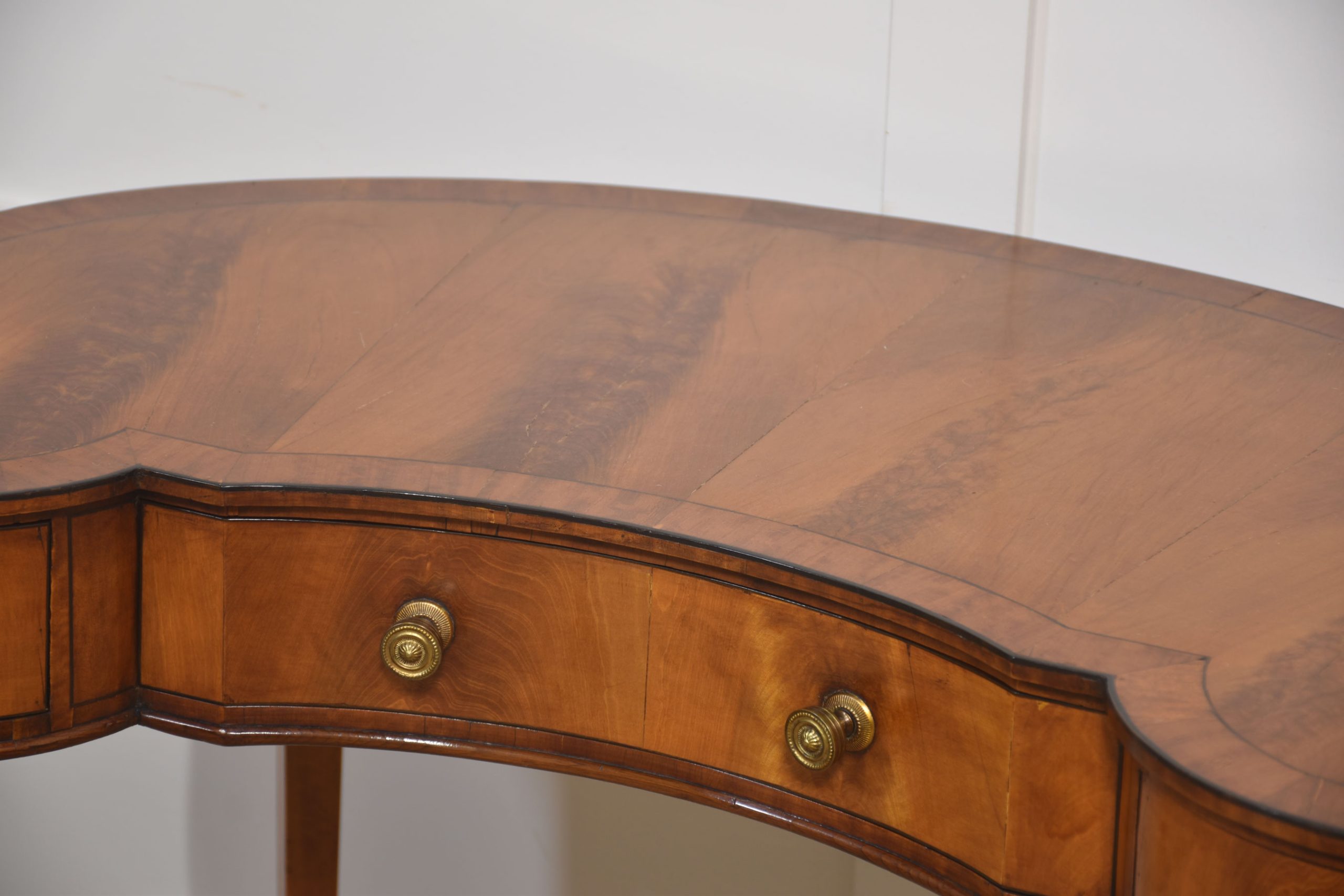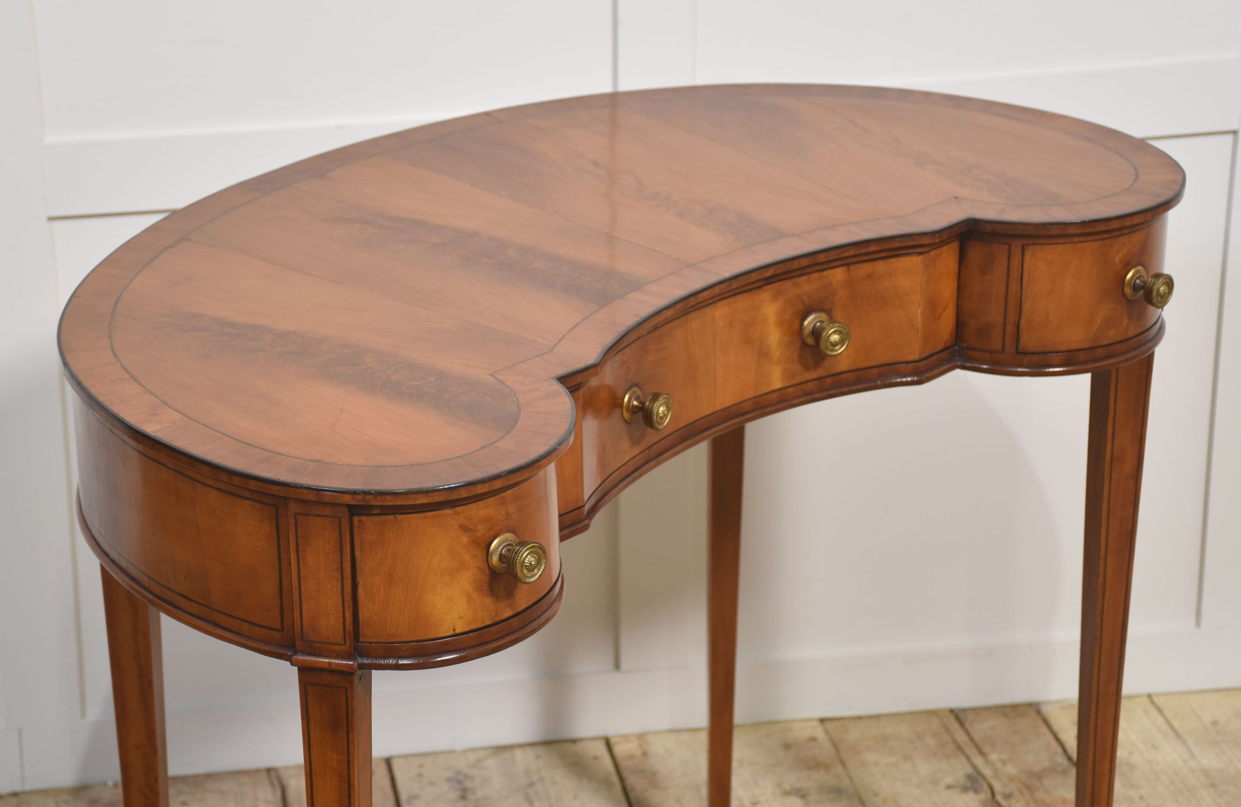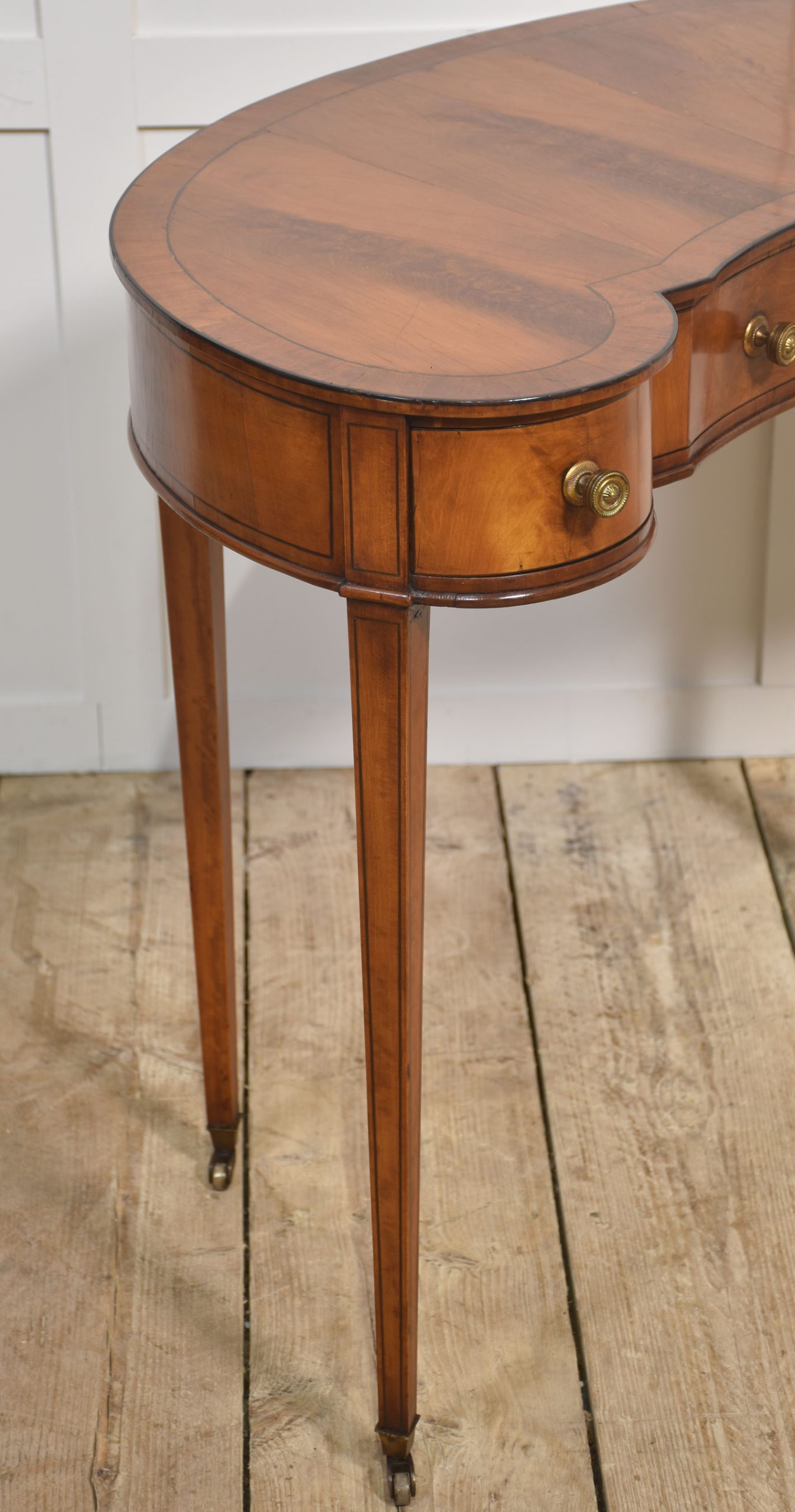 Mahogany lady’s dressing table, the kidney-shaped top, above three frieze drawers. Raised on square tappering supports terminating in brass castors.