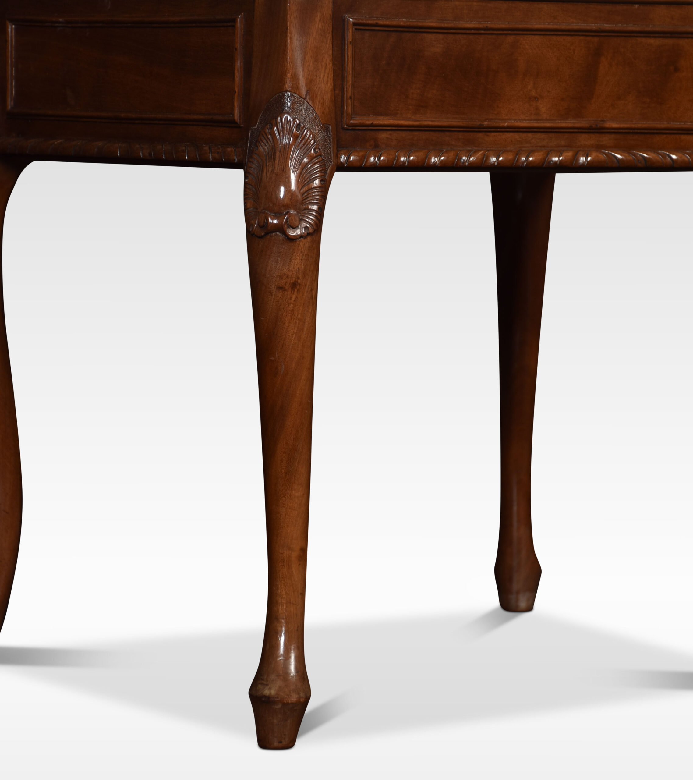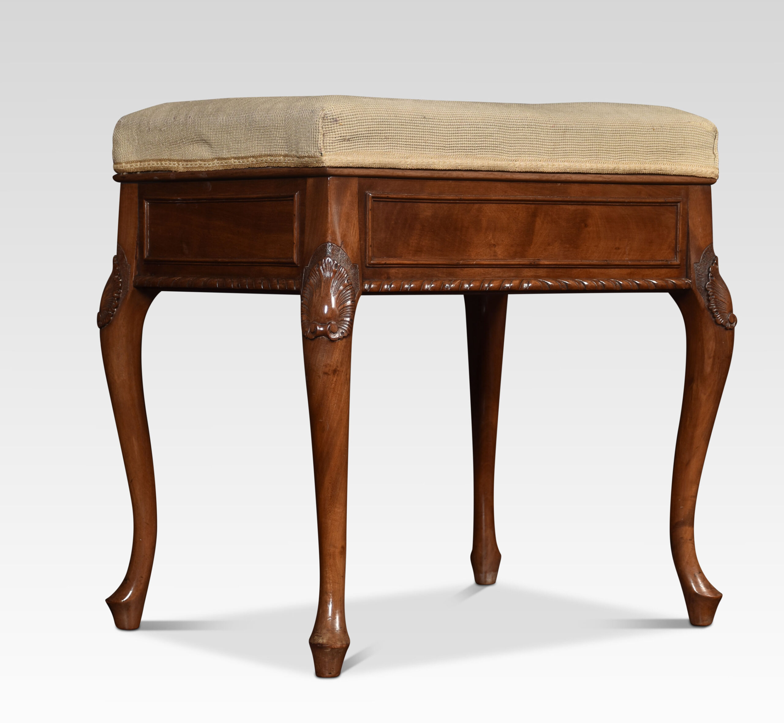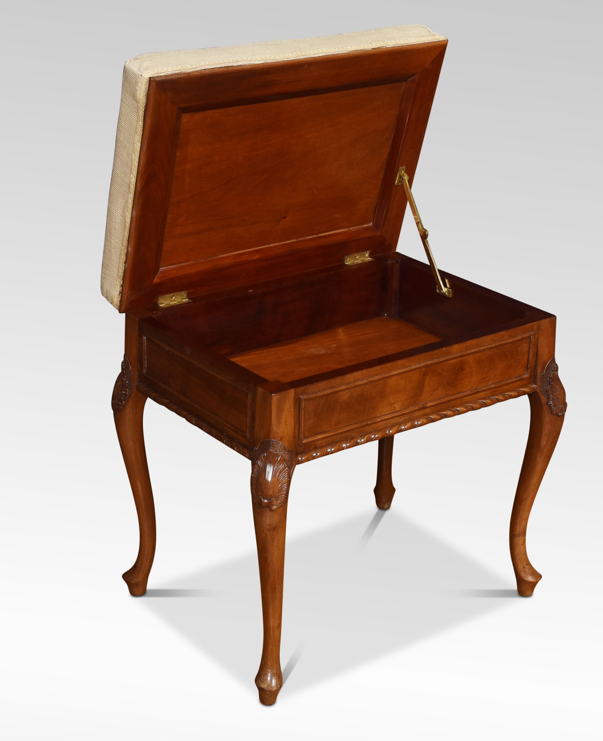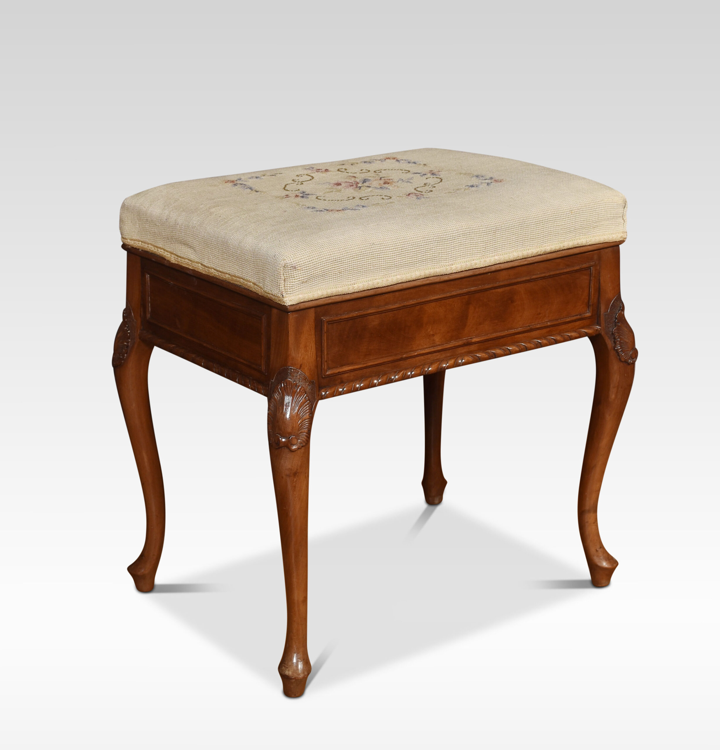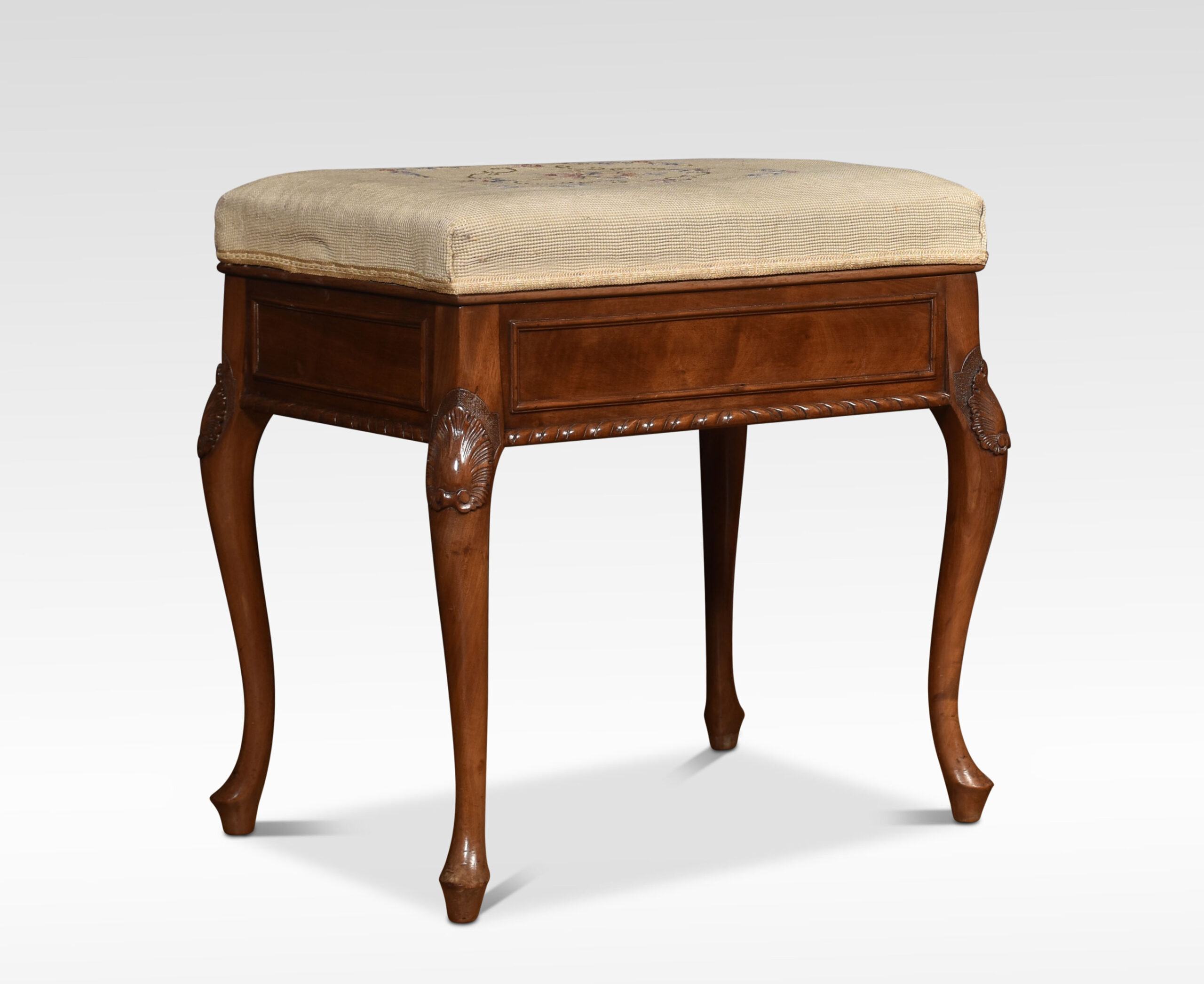 Mahogany piano stool the upholstery needlepoint overstuffed seat opening to reveal large storage are, to the carved moulded freeze all raised up on four slender cabriole support terminating in scrolling toes.