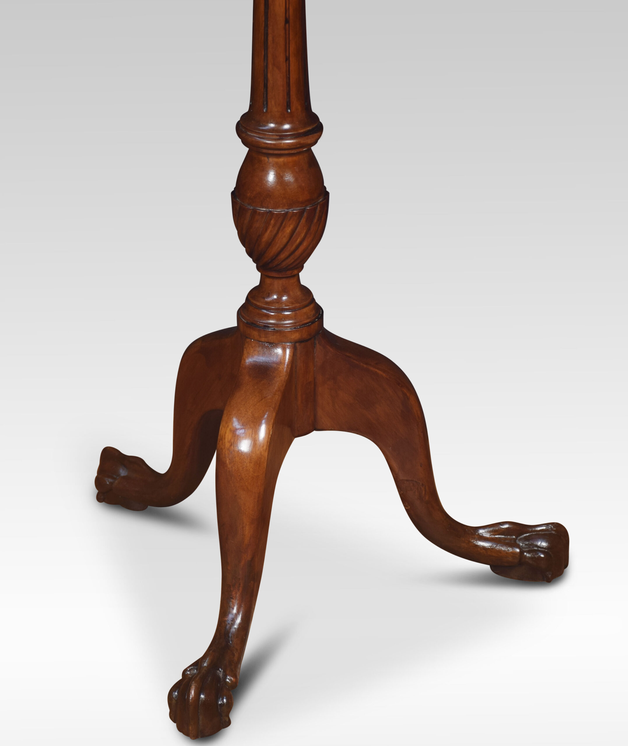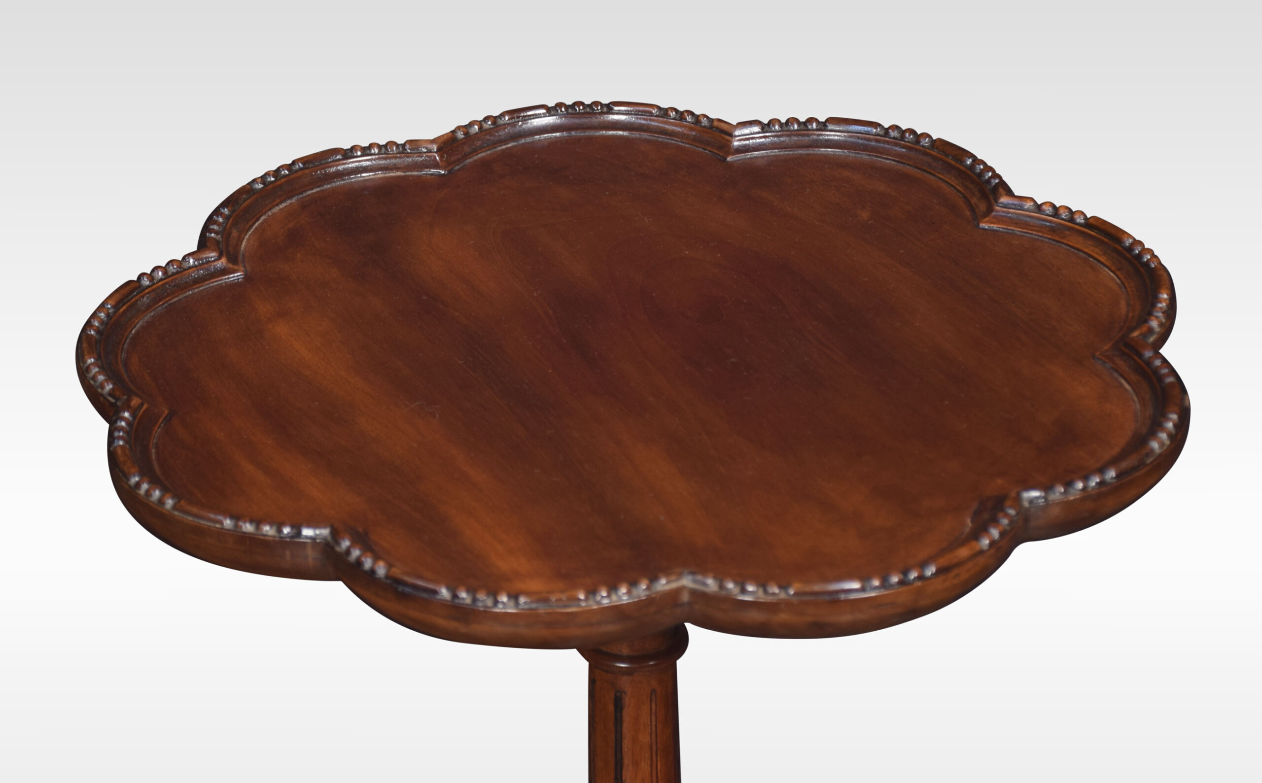 Mahogany wine table the shaped top with a carved edge above turned stem supported on three cabriole legs terminating in claw and ball feet.